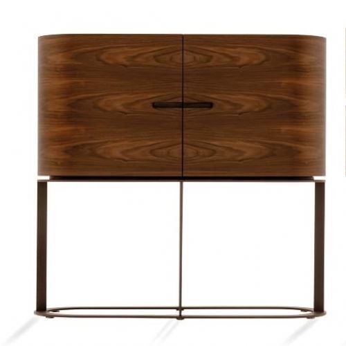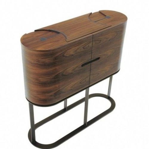 Дизайнерский барный шкаф Ino сделан из древесины грецкого ореха. Металлическое основание окрашено в бронзовый цвет. Внутренняя поверхность облицована золотой фольгой. Бар оборудован стеклянными вращающимися полками на металлическом каркасе также в бронзовом цвете, высота полок регулируется. Имеется подсветка LED. Эта модель может использоваться для хранения «милых сердцу» предметов. Бар в отделке светлый полированный орех.