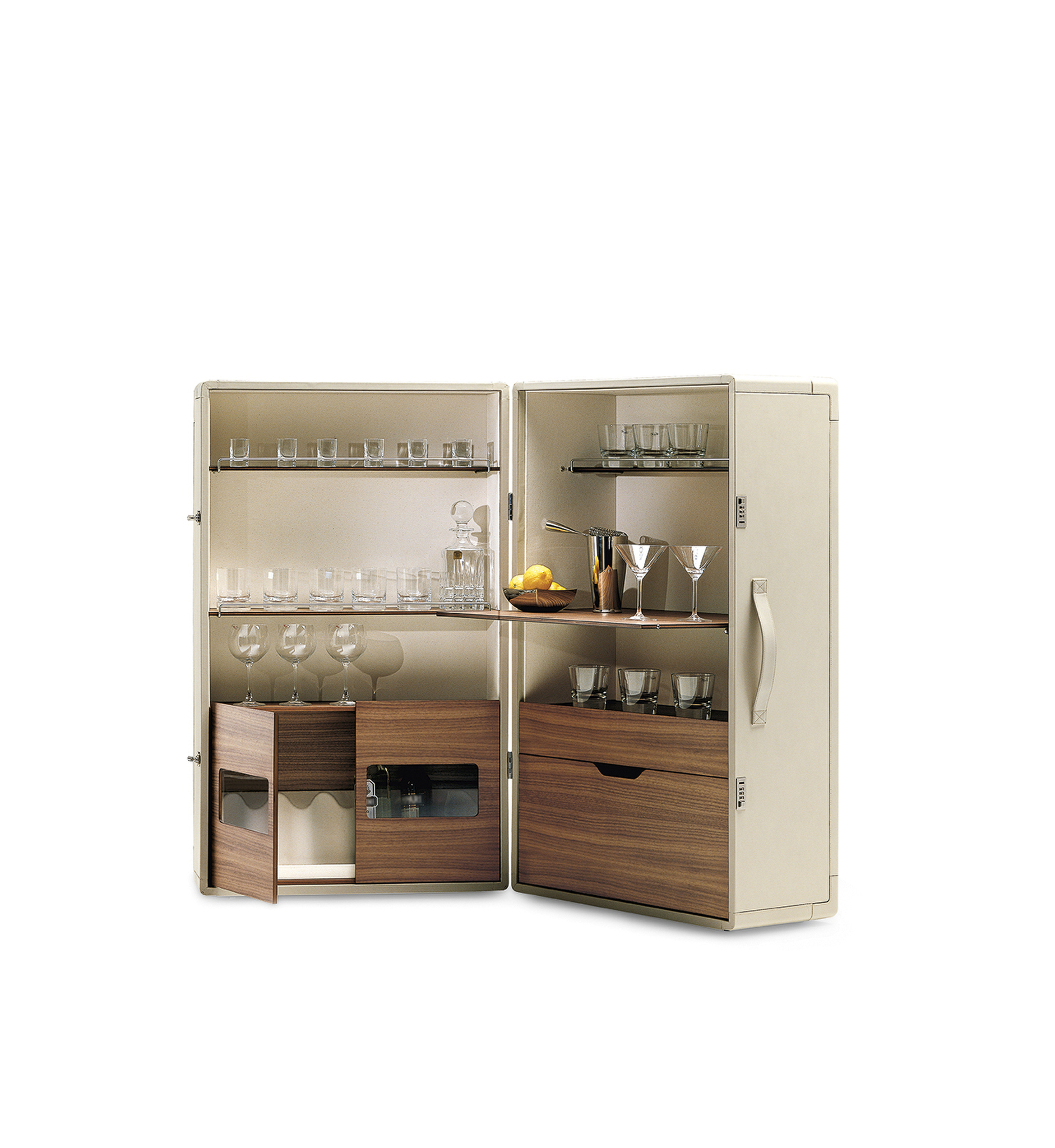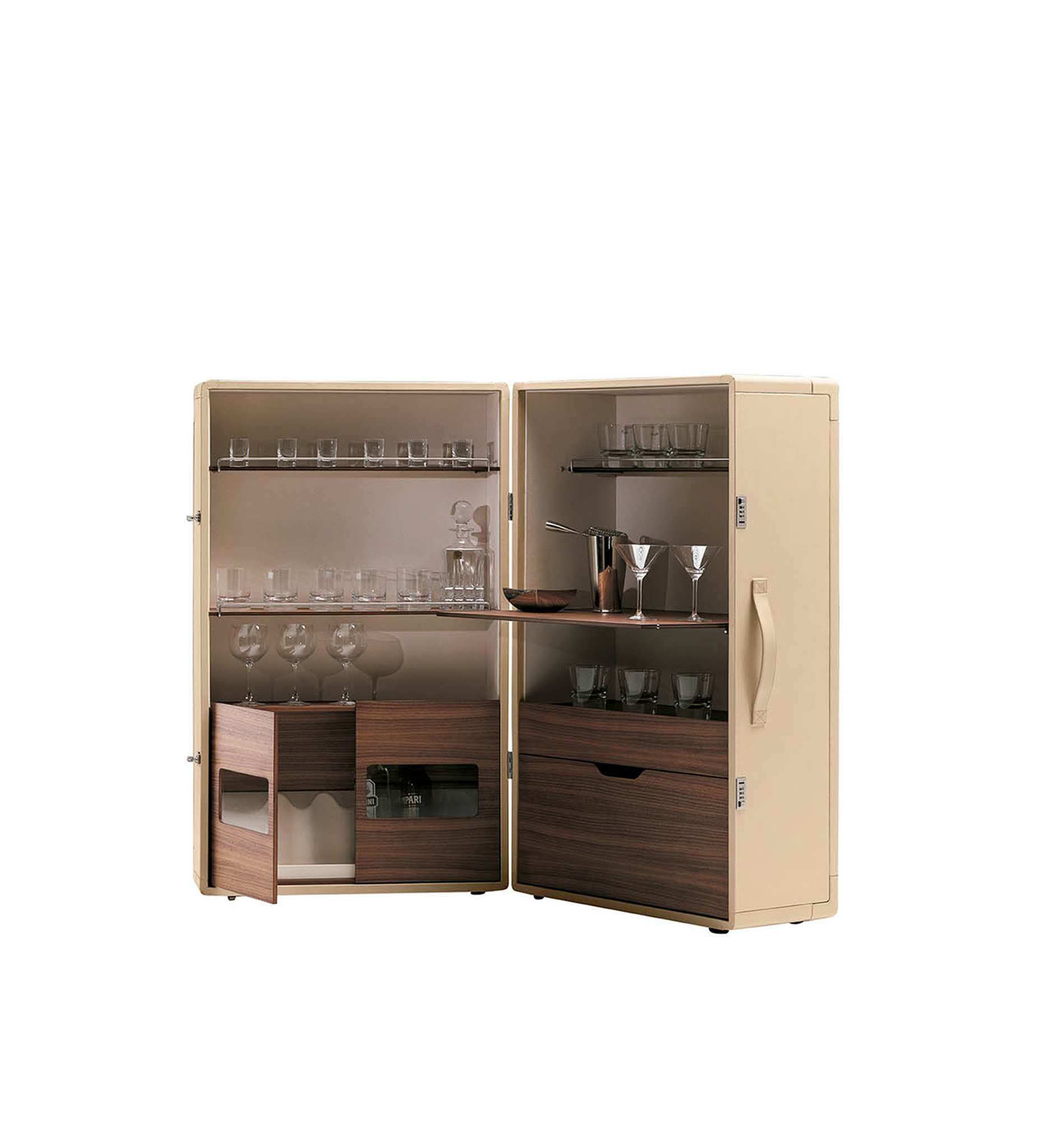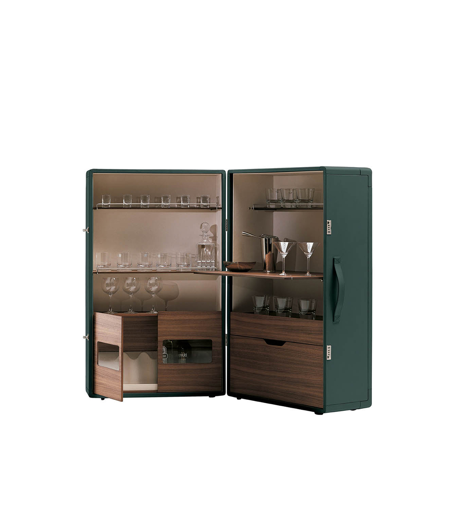 Благодаря мобильному бару Isidoro время коктейлей в вашем доме становится уютным и праздничным. Жан-Мари Массо придал элементу ретро современный вид. Isidoro - это элегантный шкаф на колесиках, который открывается как книга. У него есть внешняя ручка и механизм закрывания со щелчком. Это ценный предмет, изготовленный из высококачественных материалов и тщательно проработанный до мельчайших деталей. Внутреннее пространство тщательно продумано и включает отделения для стаканов и бутылок с небольшими металлическими ограждениями. Складную полку можно использовать в качестве практичной столешницы.