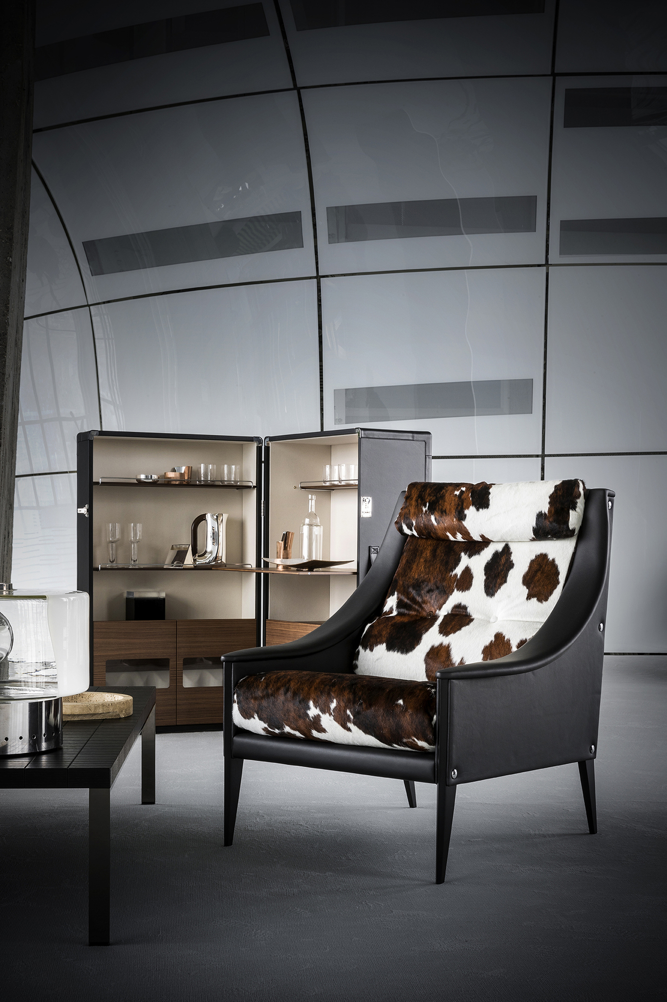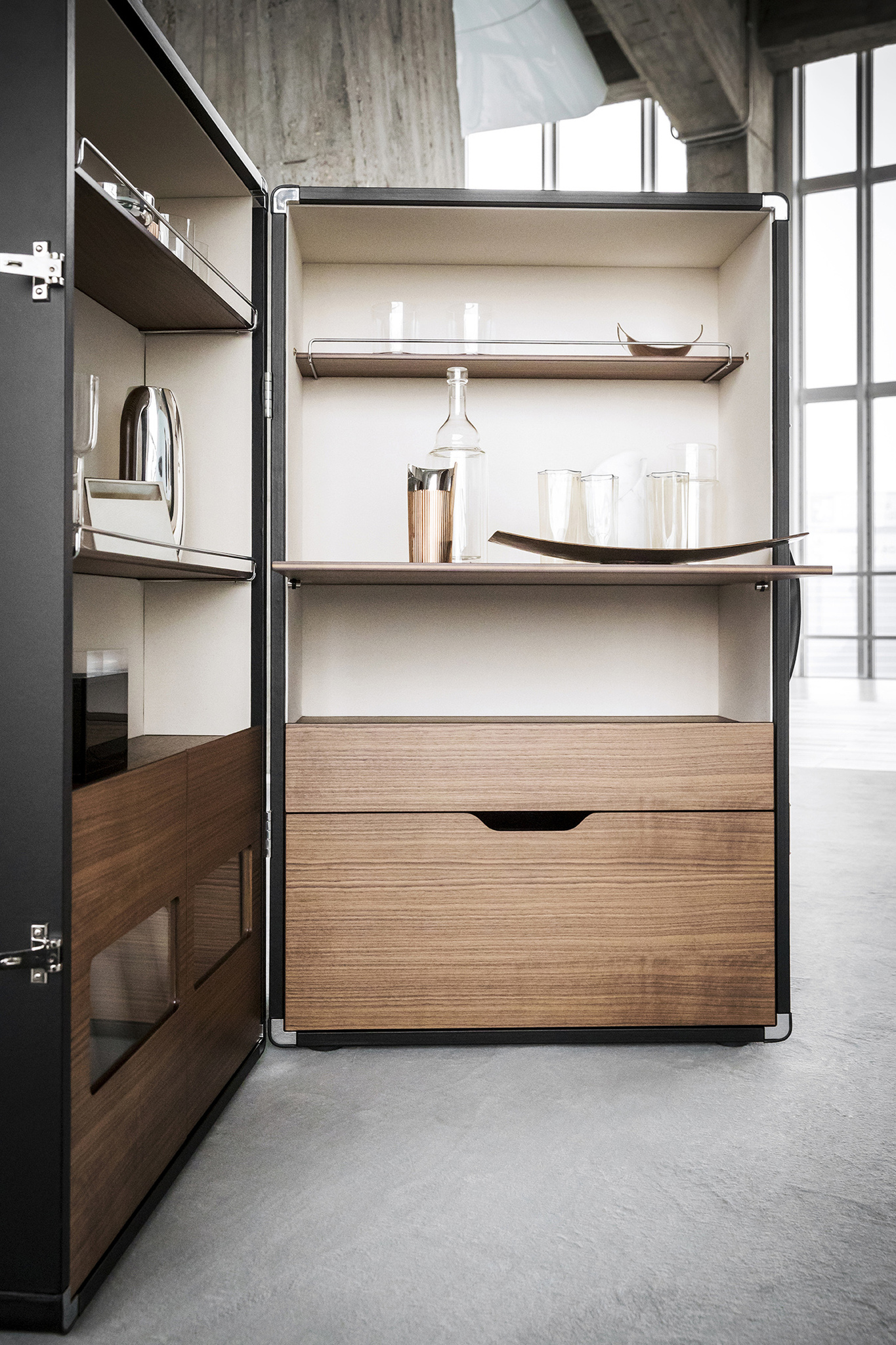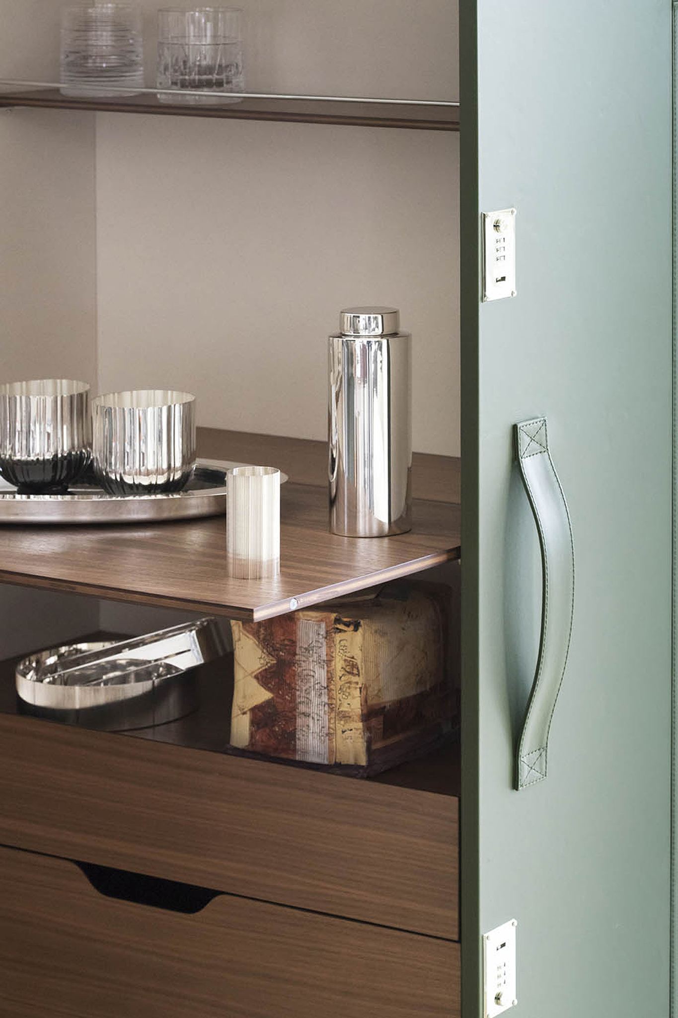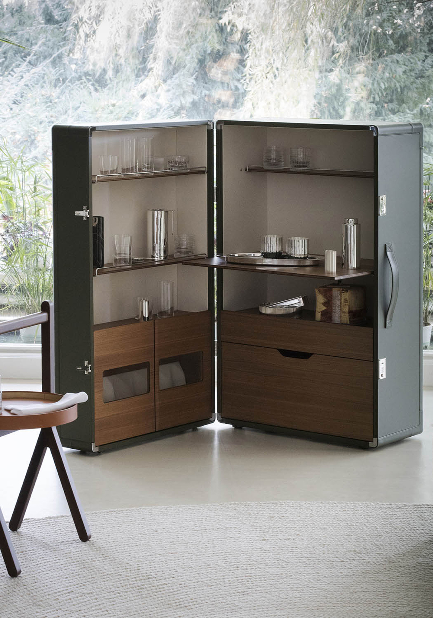 Благодаря мобильному бару Isidoro время коктейлей в вашем доме становится уютным и праздничным. Жан-Мари Массо придал элементу ретро современный вид. Isidoro - это элегантный шкаф на колесиках, который открывается как книга. У него есть внешняя ручка и механизм закрывания со щелчком. Это ценный предмет, изготовленный из высококачественных материалов и тщательно проработанный до мельчайших деталей. Внутреннее пространство тщательно продумано и включает отделения для стаканов и бутылок с небольшими металлическими ограждениями. Складную полку можно использовать в качестве практичной столешницы.