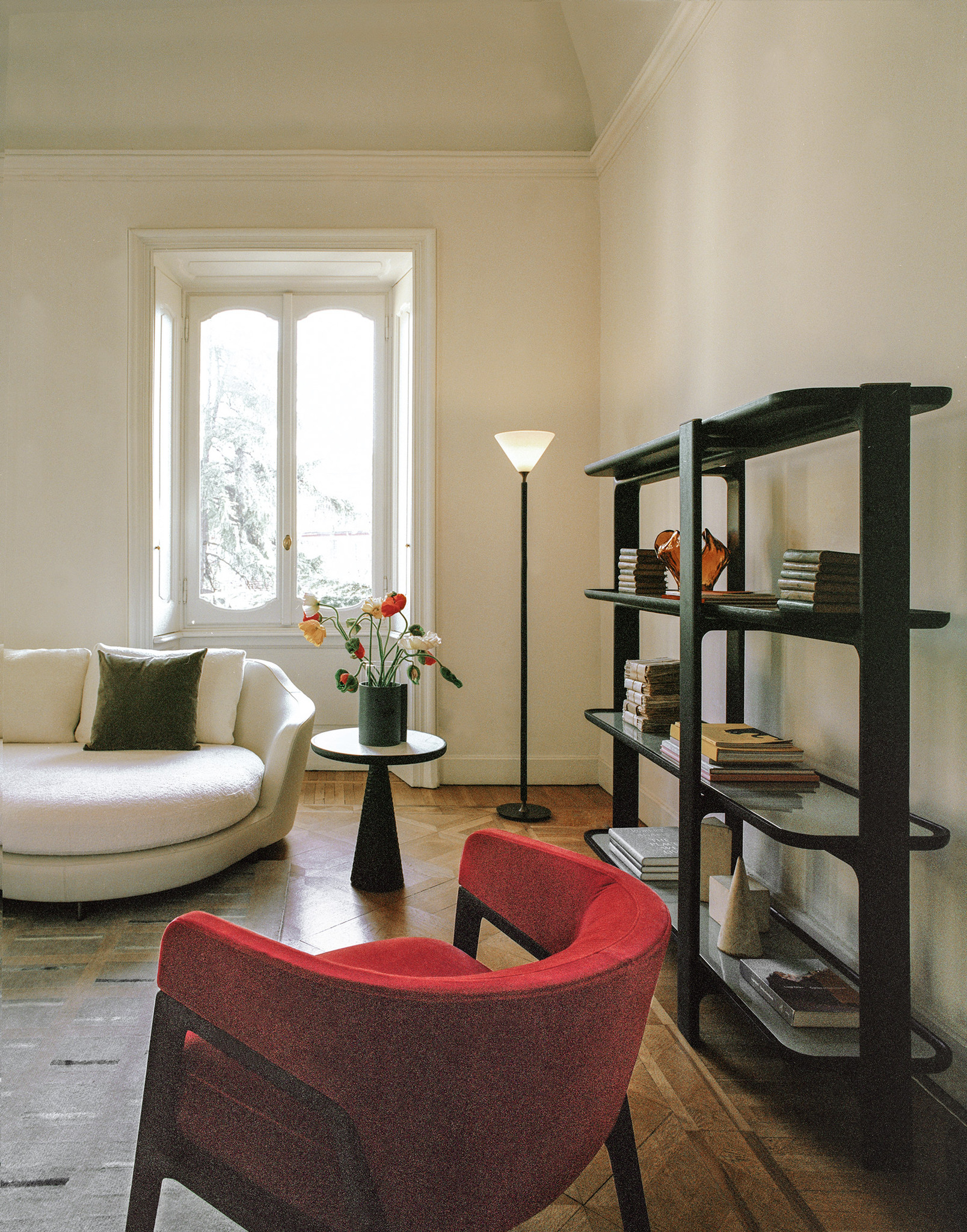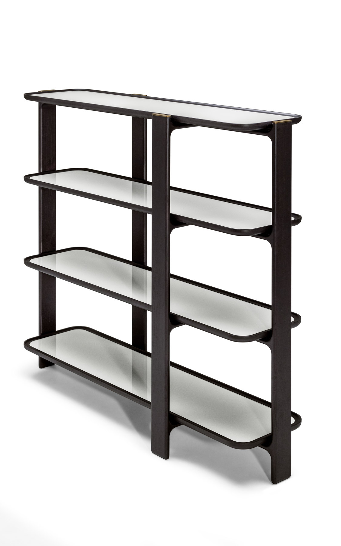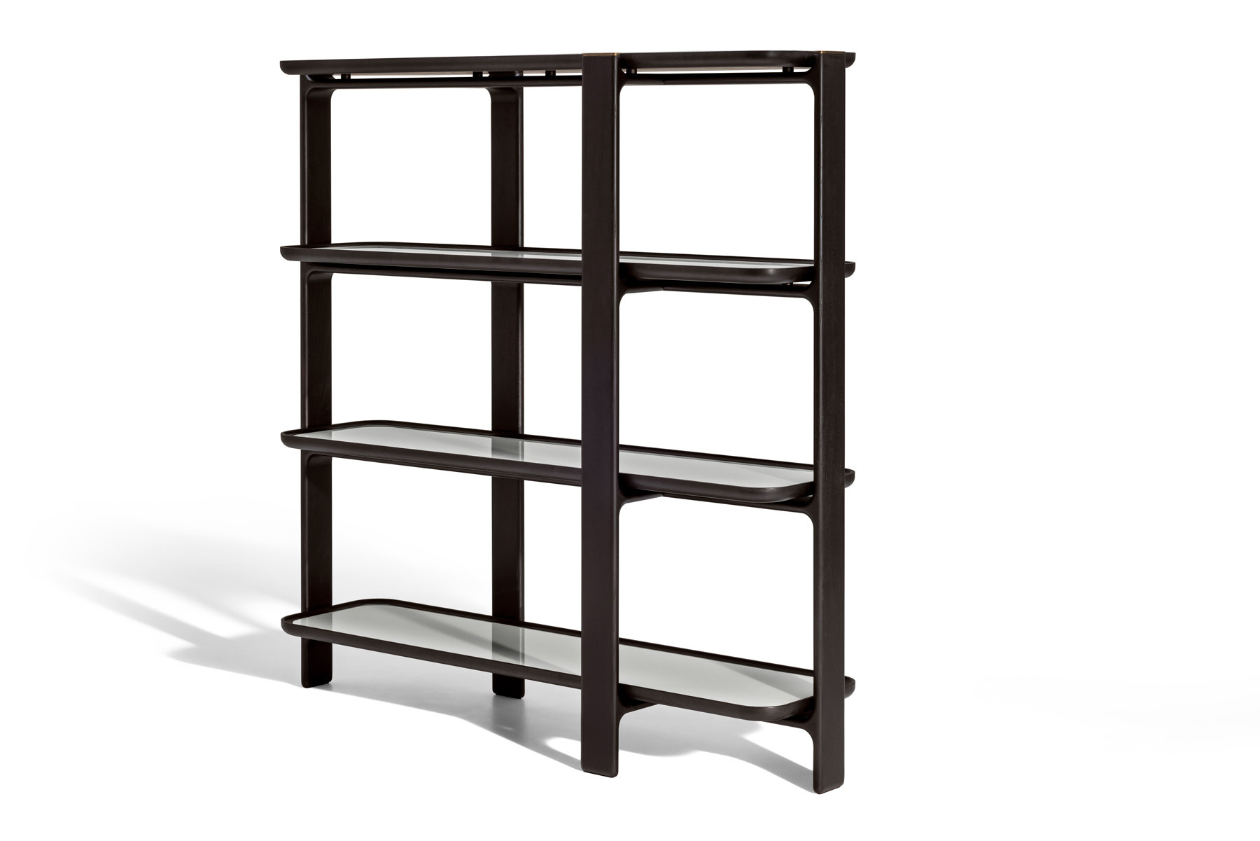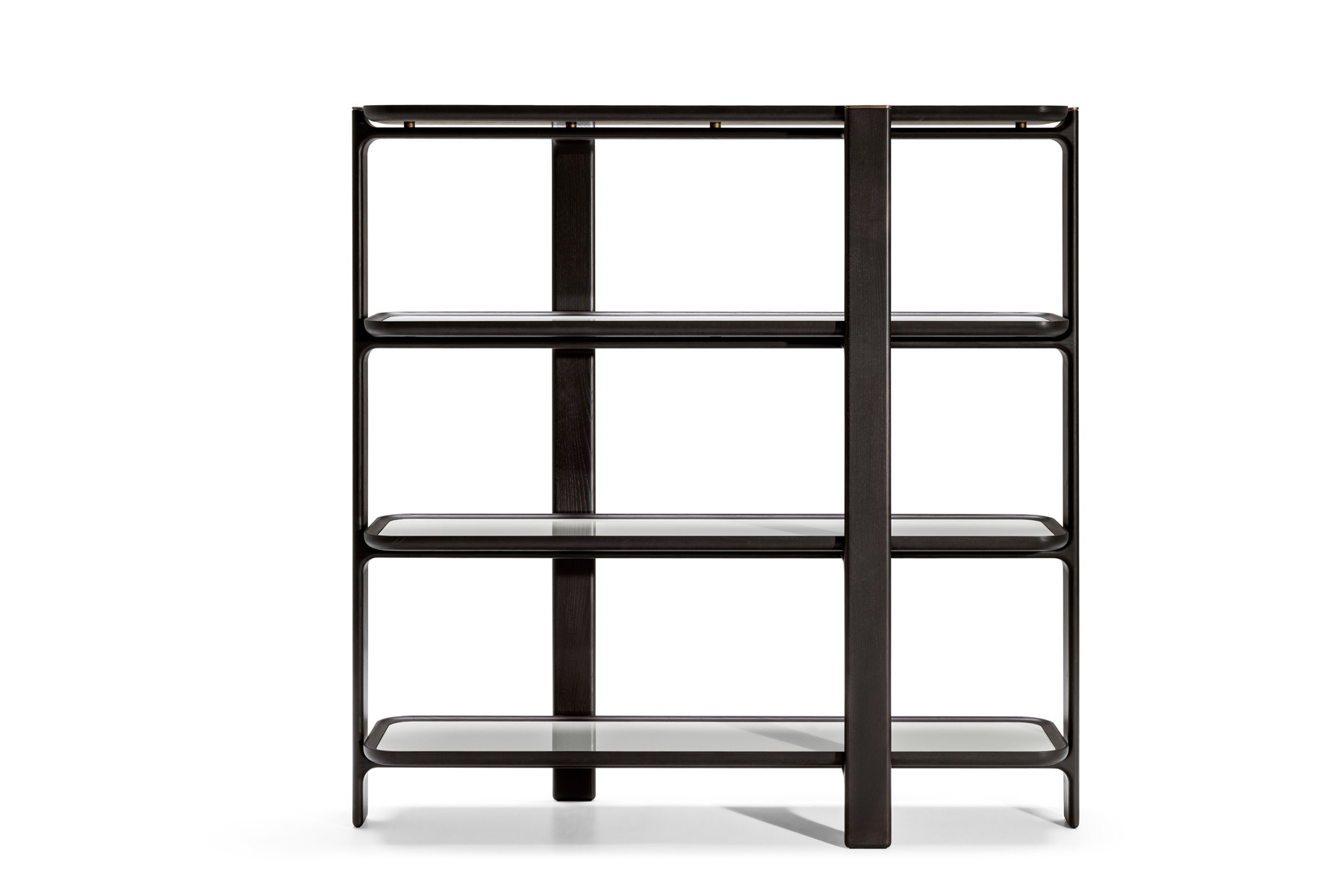 Книжный шкаф DUO состоит из расположенных в шахматном порядке стоек и полок с каркасом из ясеня который доступен в различных вариантах отделки. Нижняя часть полок изготовлена из тополиной фанеры шпонированной ясенем в той же отделке что и каркас. По запросу в рамки полок может быть вставлена столешница из мрамора или стекла окрашенного с обратной стороны для придания еще более элегантного эффекта. Книжный шкаф DUO доступен с четырьмя или двумя полками. Металлические детали с тонированной бронзовой отделкой придают дополнительный стиль и изысканность общему дизайну.
