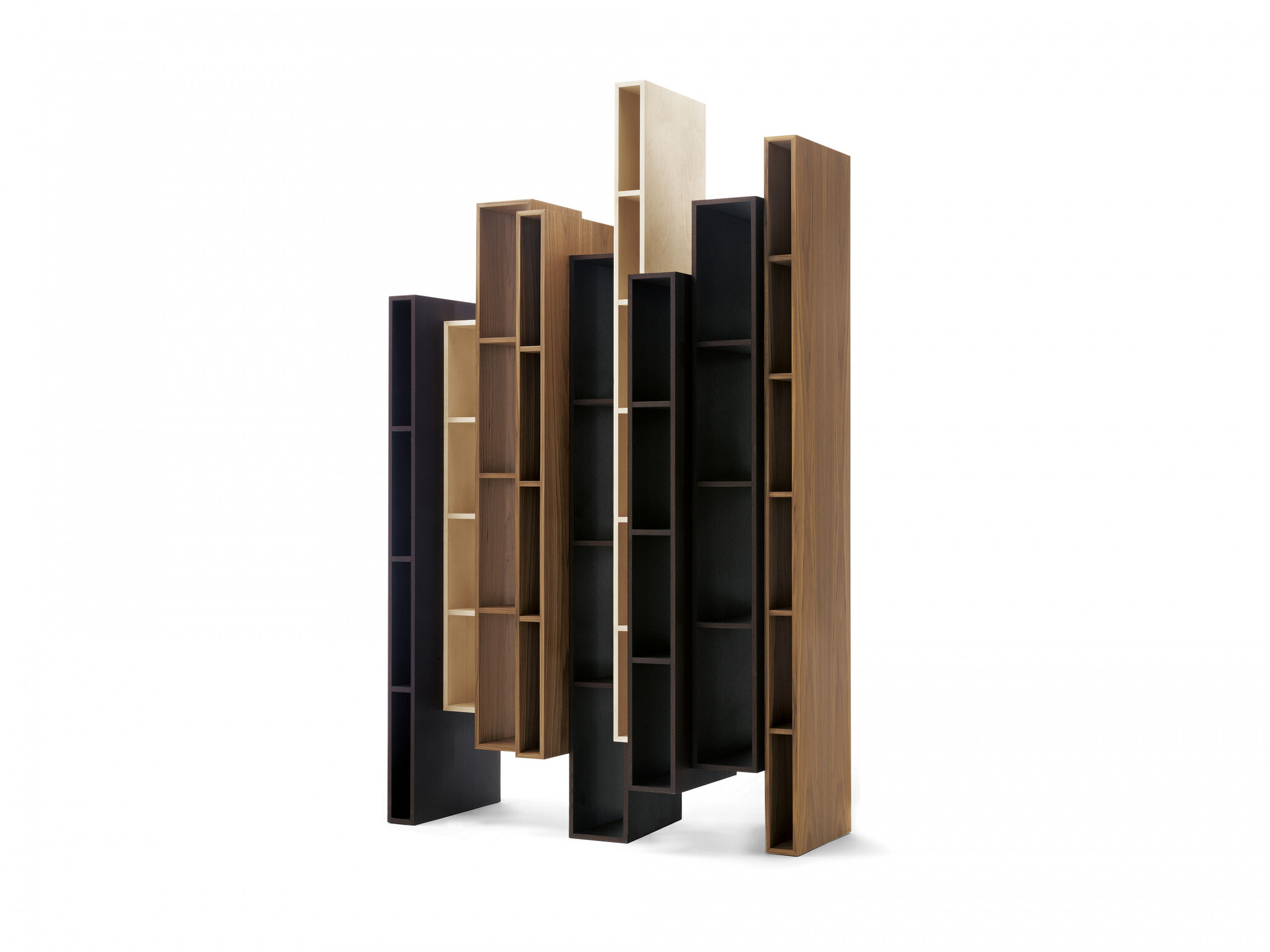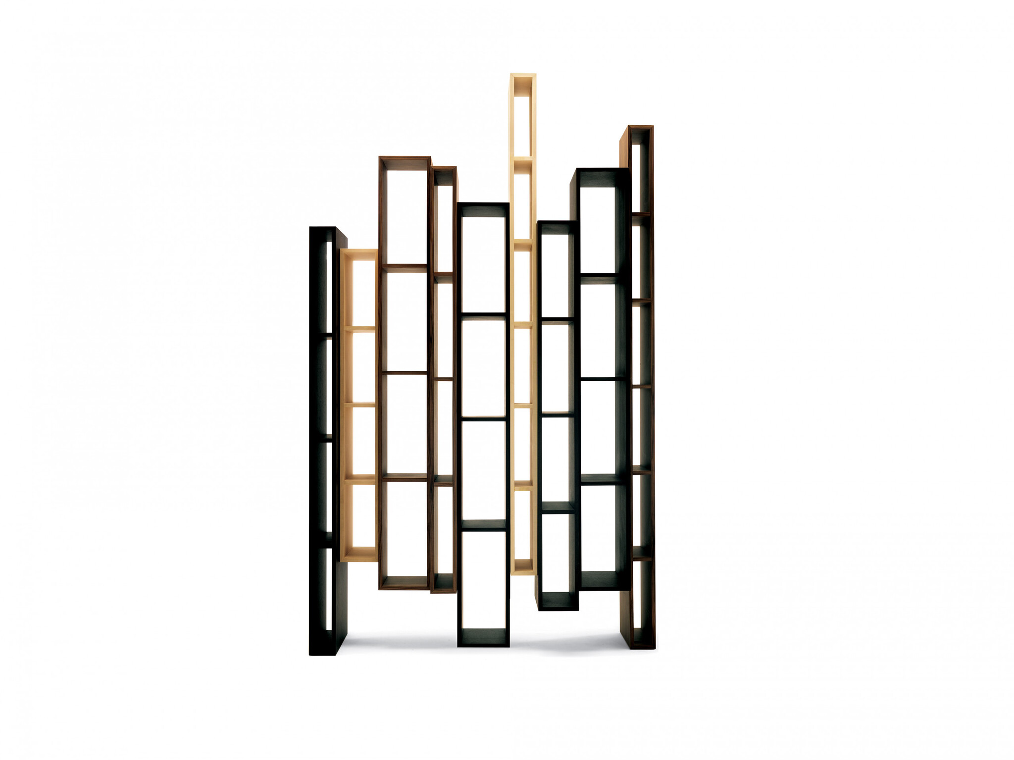 Книжный шкаф - это одновременно эстетичный и рациональный объект. Skyline - изобретение дизайнера Винченцо Де Котиса. Он состоит из вертикальных модулей соединенных горизонтально. Колонны опирающиеся на пол чередуются с другими плавающими модулями образуя шахматную доску с пространствами разного размера в которых можно разместить ваши книги и самые ценные вещи. Решение которое не только создает необычные композиции но и придает помещению легкость добавляя оригинальный ритм. Самонесущий и двусторонний он изготовлен из шпонированной фанеры и смеси пород дерева в которой американский орех чередуется с венге и кленом и обработан вручную натуральным воском.