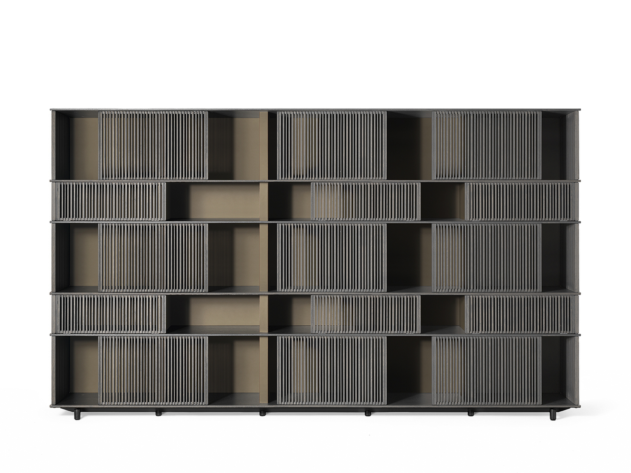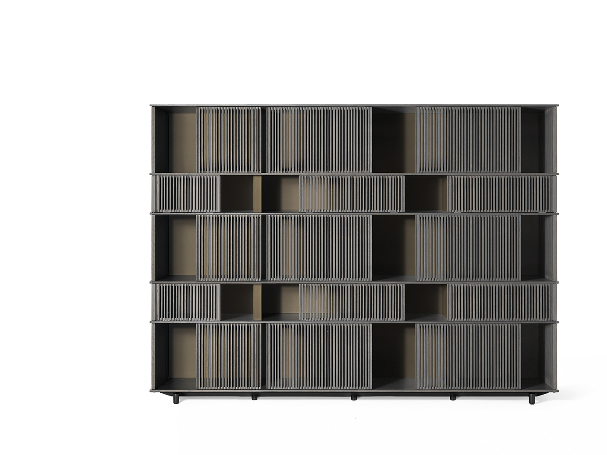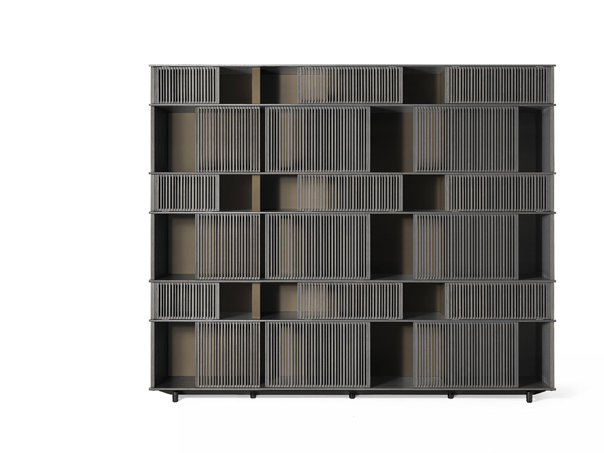 Жан-Мари Массо разработал систему хранения и книжных шкафов Lloyd с изменяемой геометрией. Тонкие вертикальные деревянные стержни создают легкие решетки, которые проходят сверху вниз по невидимым горизонтальным направляющим. Каждую решетку можно перемещать по желанию, создавая каждый раз новую последовательность. Изменчивое сочетание твердых тел и пустот, света и тени. Чувственная игра, которая позволяет увидеть содержимое, книги и предметы, не раскрывая их полностью. Самые передовые технологии сочетаются с традиционными материалами, деревом и кожей седла, образуя прочную минималистичную конструкцию.