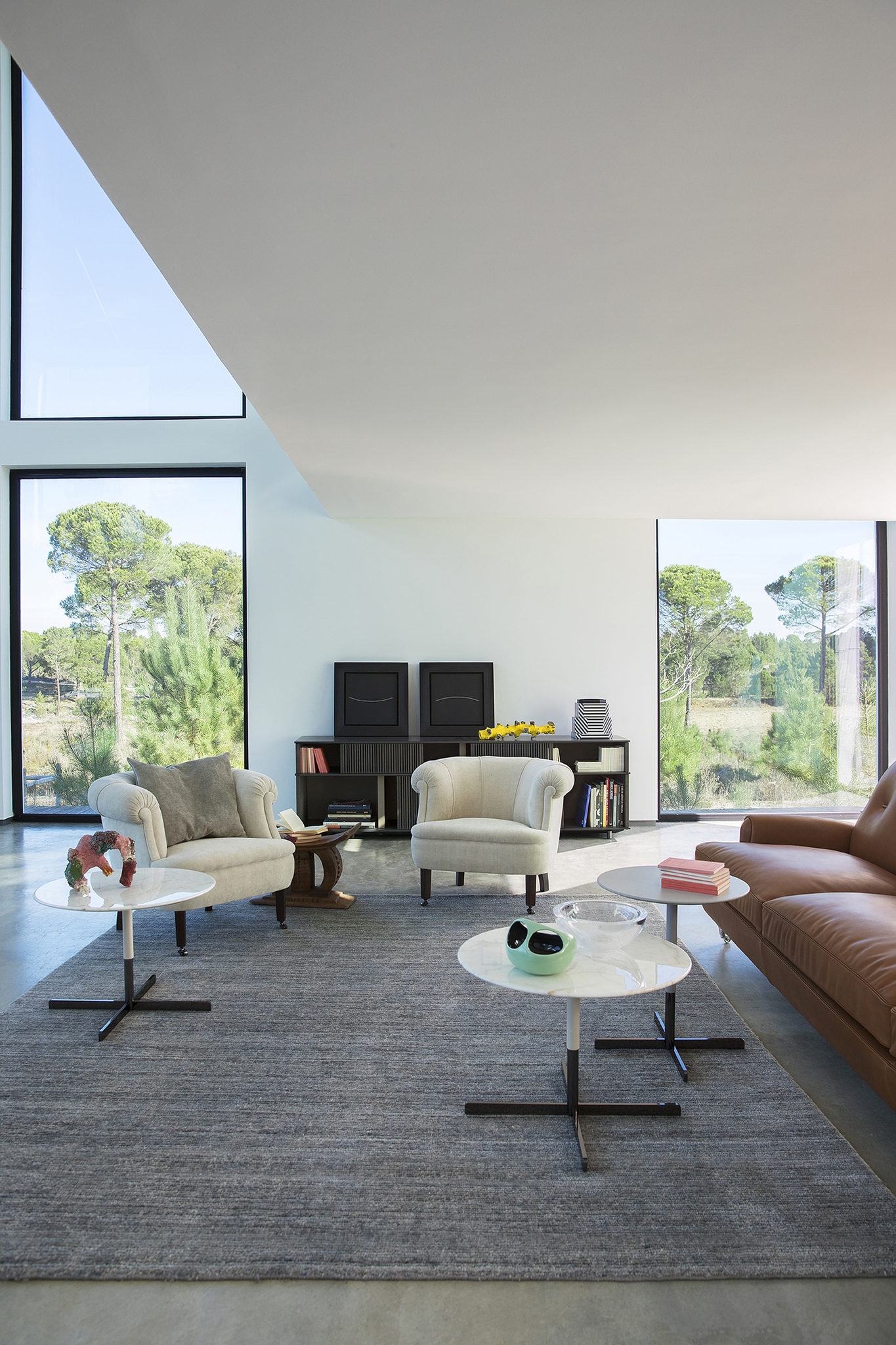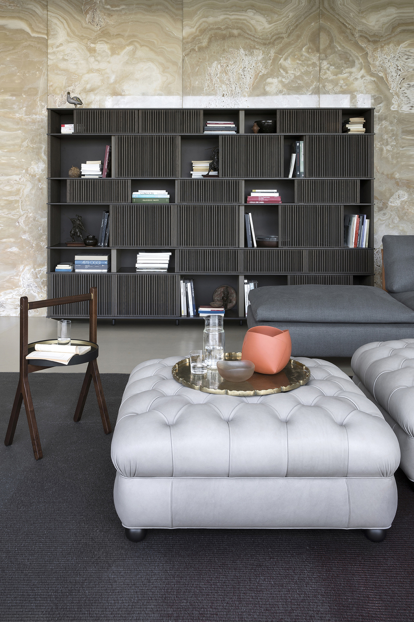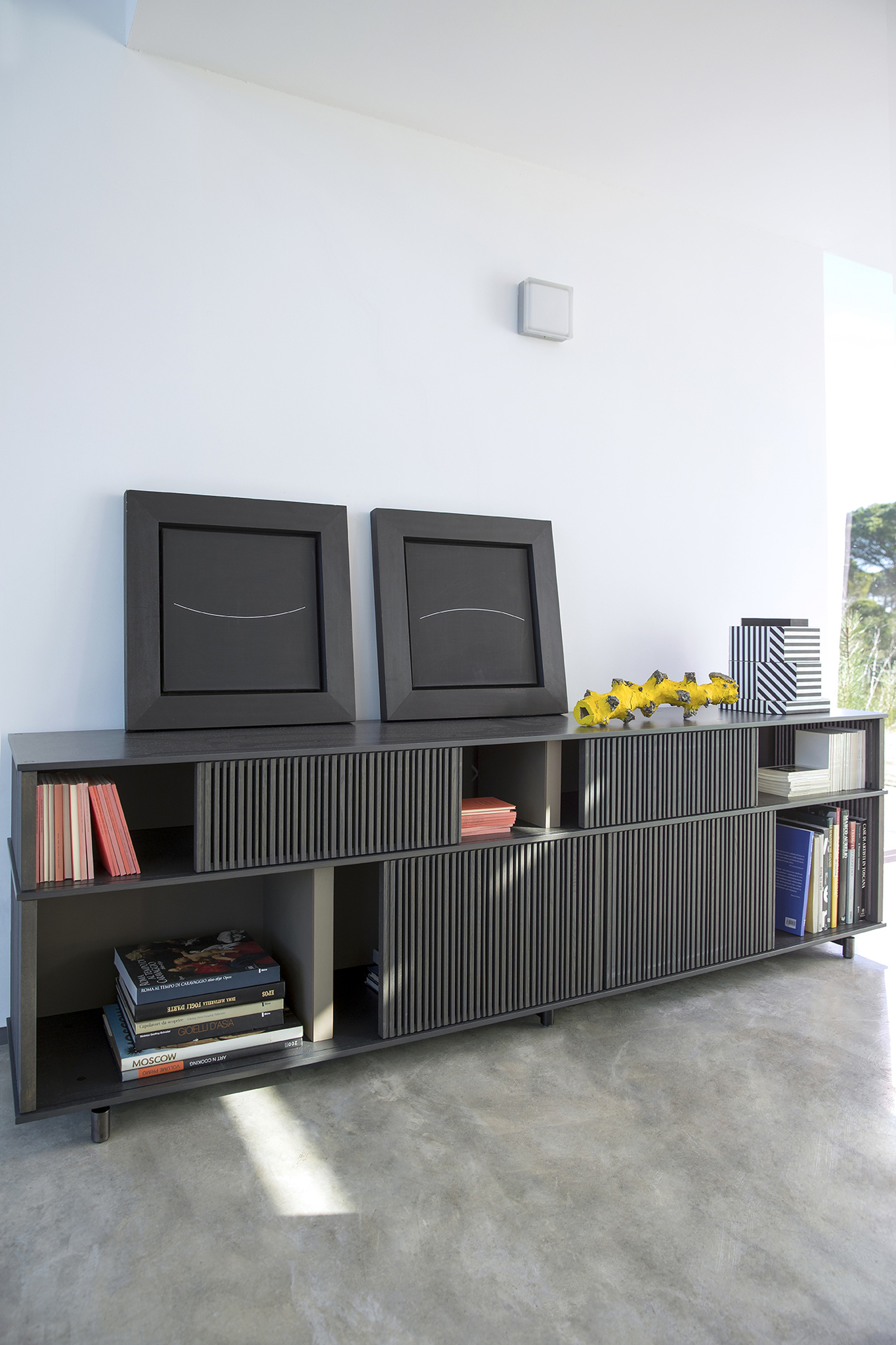 Жан-Мари Массо разработал систему хранения и книжных шкафов Lloyd с изменяемой геометрией. Тонкие вертикальные деревянные стержни создают легкие решетки, которые проходят сверху вниз по невидимым горизонтальным направляющим. Каждую решетку можно перемещать по желанию, создавая каждый раз новую последовательность. Изменчивое сочетание твердых тел и пустот, света и тени. Чувственная игра, которая позволяет увидеть содержимое, книги и предметы, не раскрывая их полностью. Самые передовые технологии сочетаются с традиционными материалами, деревом и кожей седла, образуя прочную минималистичную конструкцию.
