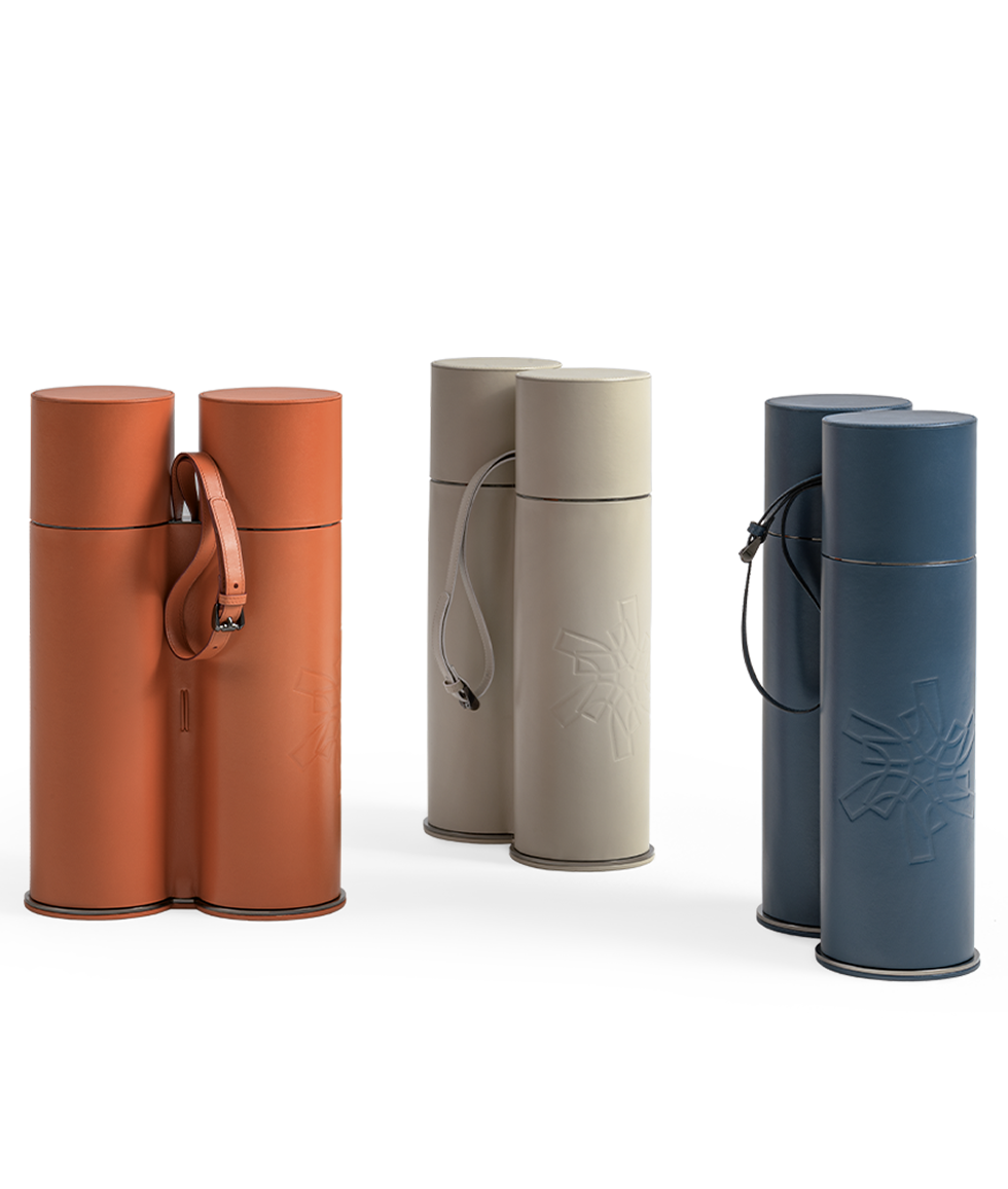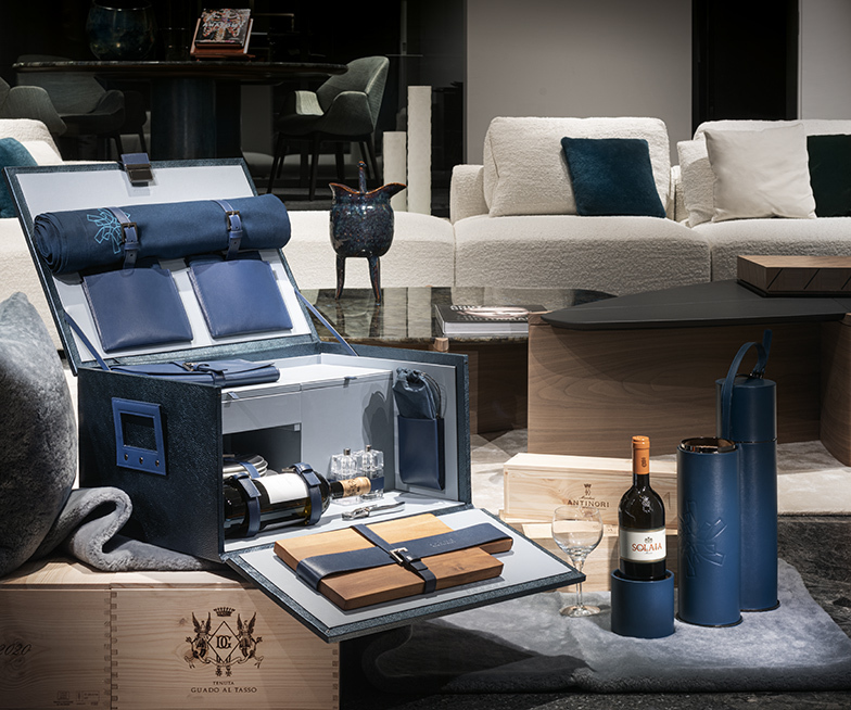 Кожаный держатель для бутылок, вмещающий и транспортирующий две бутылки — пример качества, страсти к деталям и мастерству. Pineider X Giorgetti.