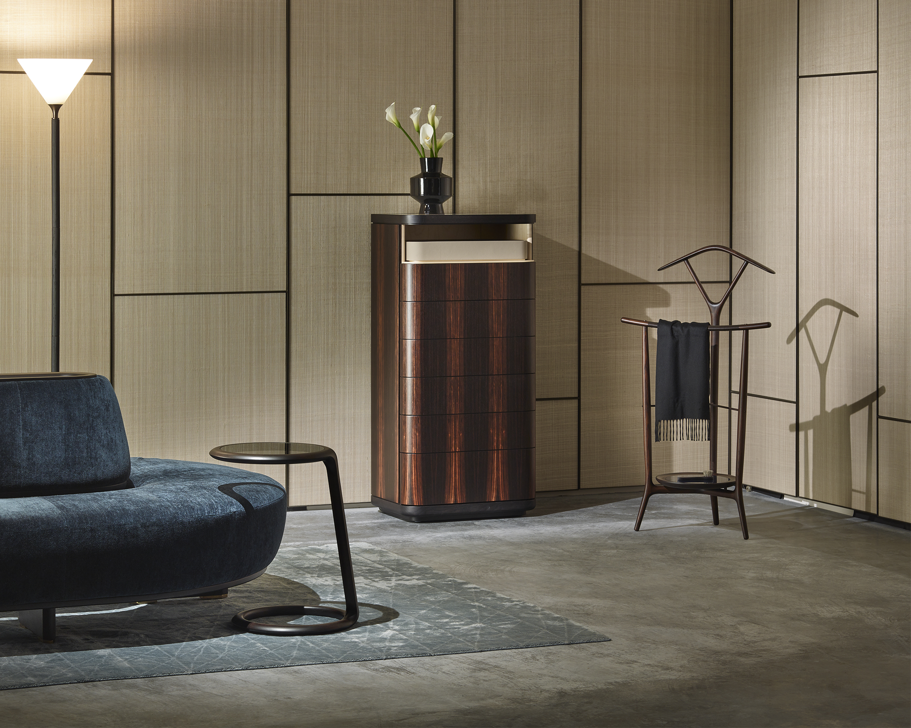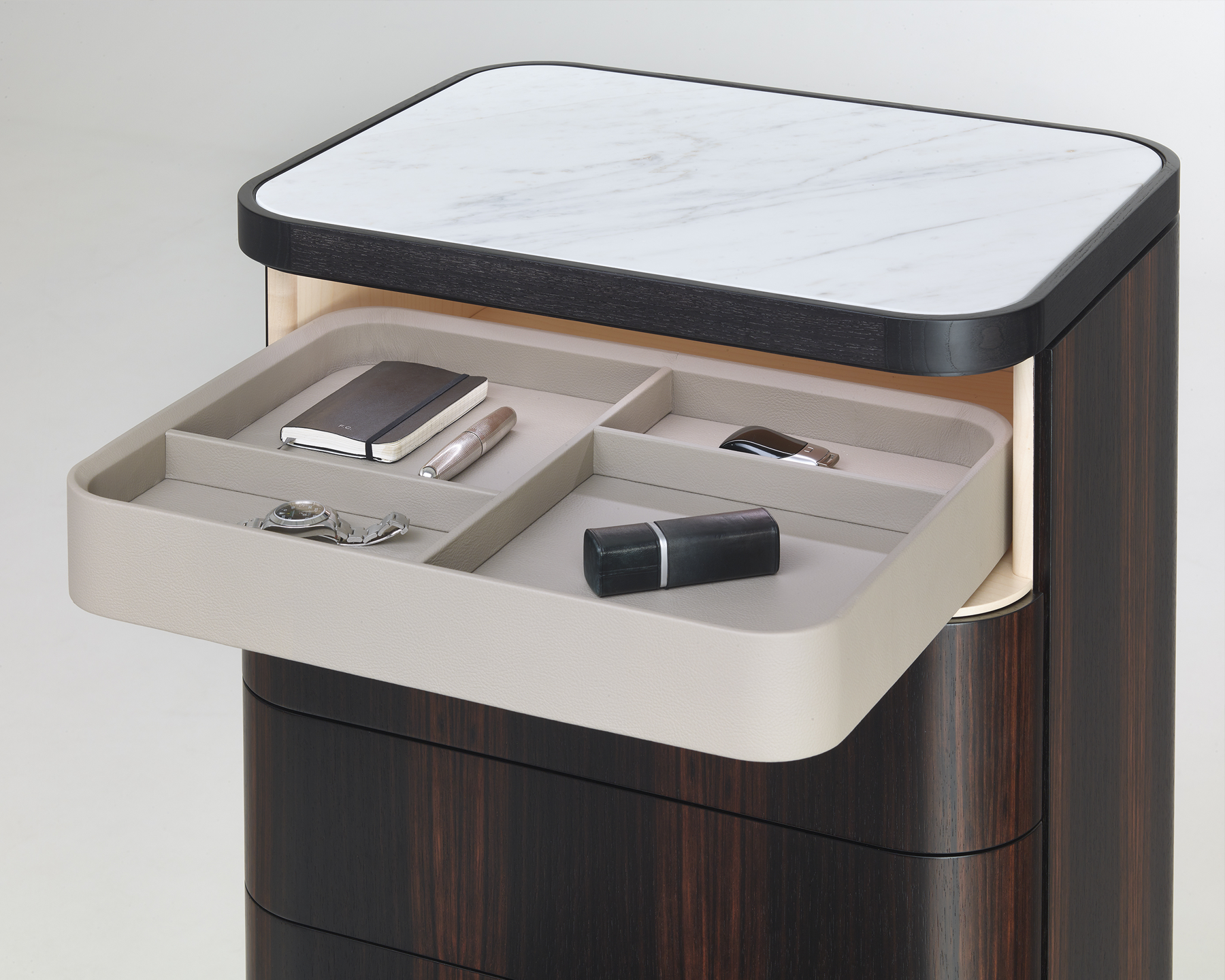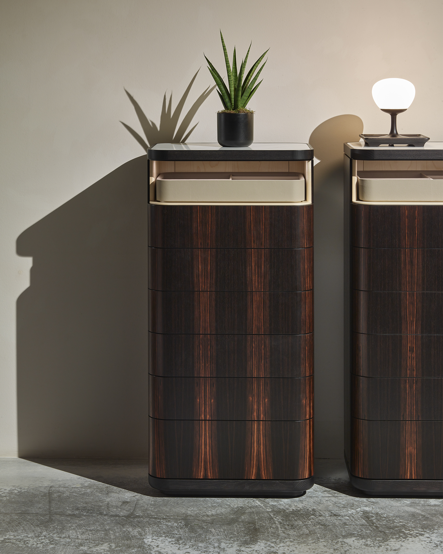 Это дополнение для ночной зоны берет свое начало от предыдущего шкафа DUO и оба они разработаны Роберто Лаццерони. Комод DUO находит свое идеальное место в спальне становясь бесшумным компаньоном готовым незаметно удовлетворить любые потребности. Этот новый комод из массива ясеня складывается вертикально и состоит из шести выдвижных ящиков и небольшого открытого отделения которое обеспечивает практичное и элегантное пространство внутри которого находится выдвижной лоток обтянутый кожей и разделенный на отделения идеально подходящие для упорядоченной и изысканной организации небольших предметов. В верхней части внутренней части отделения находится светодиодная подсветка с сенсорным управлением которая мягко освещает содержимое сочетая функциональность и эстетику. Столешница которая может быть выполнена из дерева стекла с обратной окраской или мрамора калакатта установлена заподлицо с рамой из массива ясеня. Выдвижные ящики изготовлены из клена с возможностью обивки дна кожей различных цветов указанных в прайс-листе. Внешняя поверхность шкафа может быть облицована шпоном черного дерева натурального ореха клена инкрустированного клена или натурального ореха грецкого что придает всем сторонам шкафа современную текстуру чередуя и контрастируя с рисунком натурального дерева и вертикальными насечками. Эта деталь также подходит для размещения в центре комнаты.