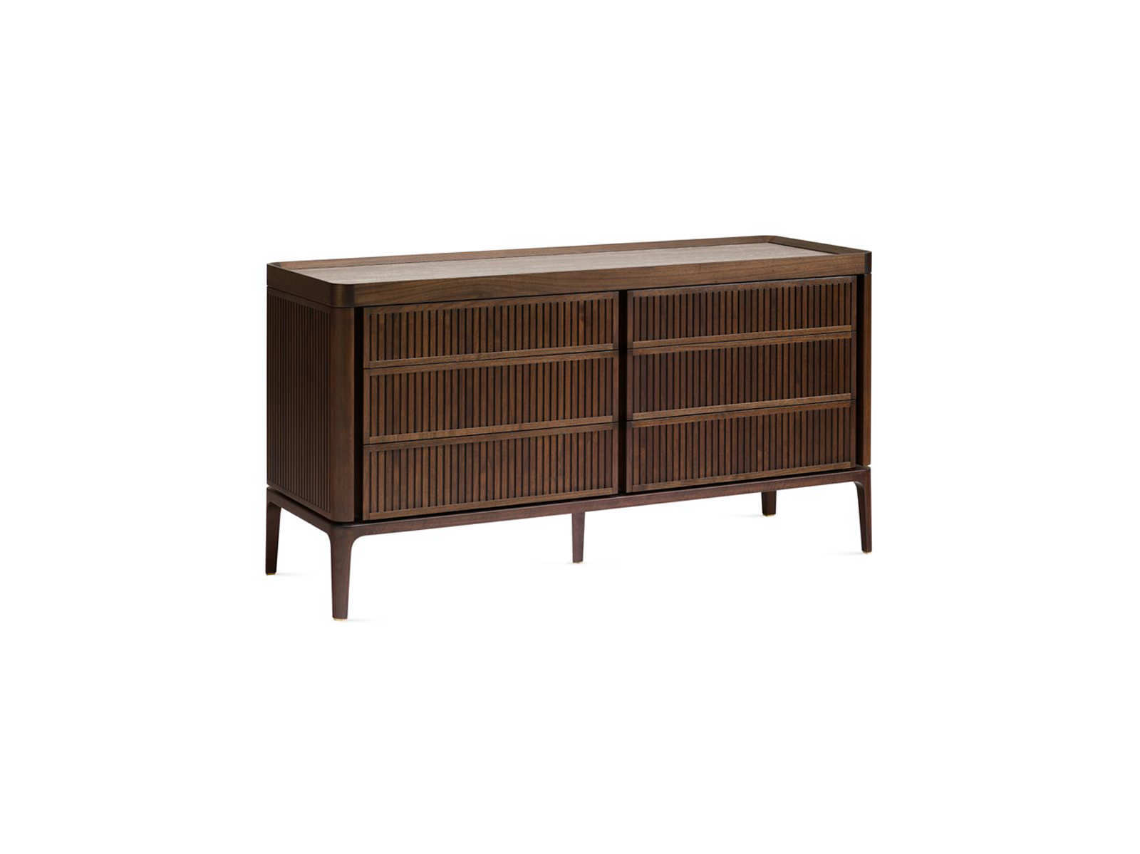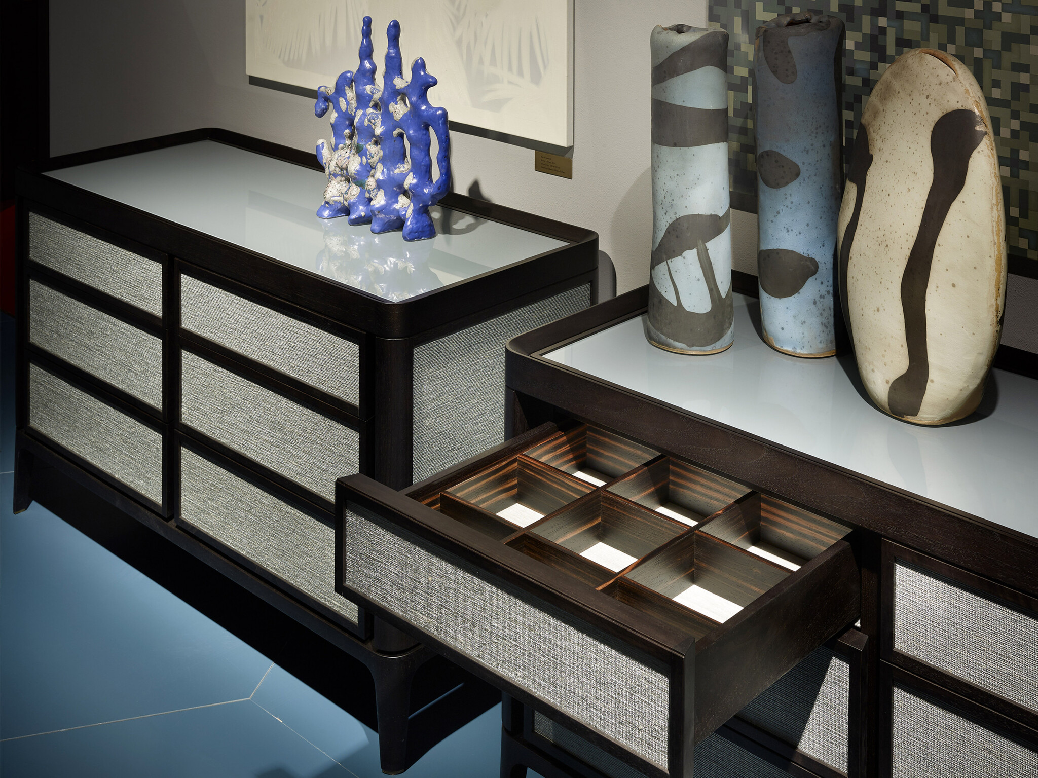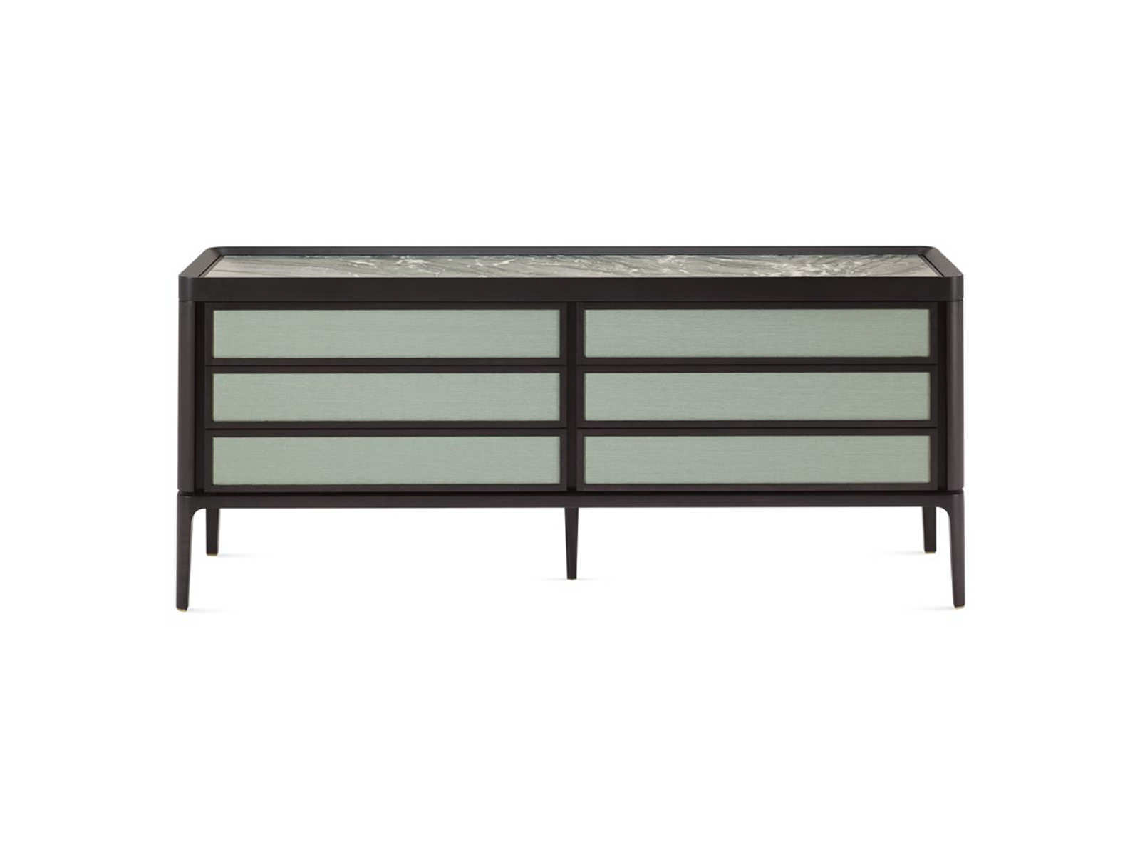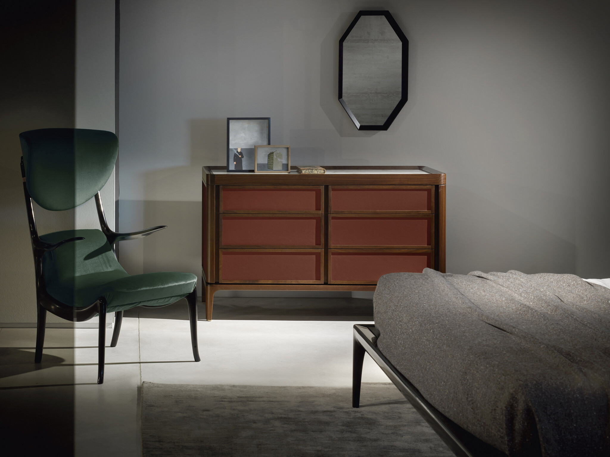 Это произведение искусства отражает результат встречи личностей каждая из которых обладает собственным талантом и видением но общим желанием создавать особые предметы для дома. Этот комод из полного ассортимента доступный в маленьком среднем и большом исполнении был разработан Роберто Лаццерони в 2017 году. Это элегантное изделие одинаково идеально подходит как для спальни так и для прихожей. Конструкция выполнена из массива американского ореха в то время как фасады ящиков и боковые панели могут быть отделаны орехом черным деревом тканью или кожей а также покрыты лаком. Для изготовления столешницы предлагается широкий выбор материалов которые могут быть выполнены из дерева цветного стекла или мрамора. Доступна дополнительная версия с фасадами выдвижных ящиков и боковыми панелями покрытыми мелкими полосками из массива американского ореха нанесенными вручную. Это элегантный образец мастерства мастеров Ceccotti Collezioni. Дно выдвижных ящиков также может быть выполнено из кожи а внутри ящиков могут быть вставлены разделители из черного дерева для удобства использования. Для комплектации к нему может прилагаться полноценная прикроватная тумбочка.