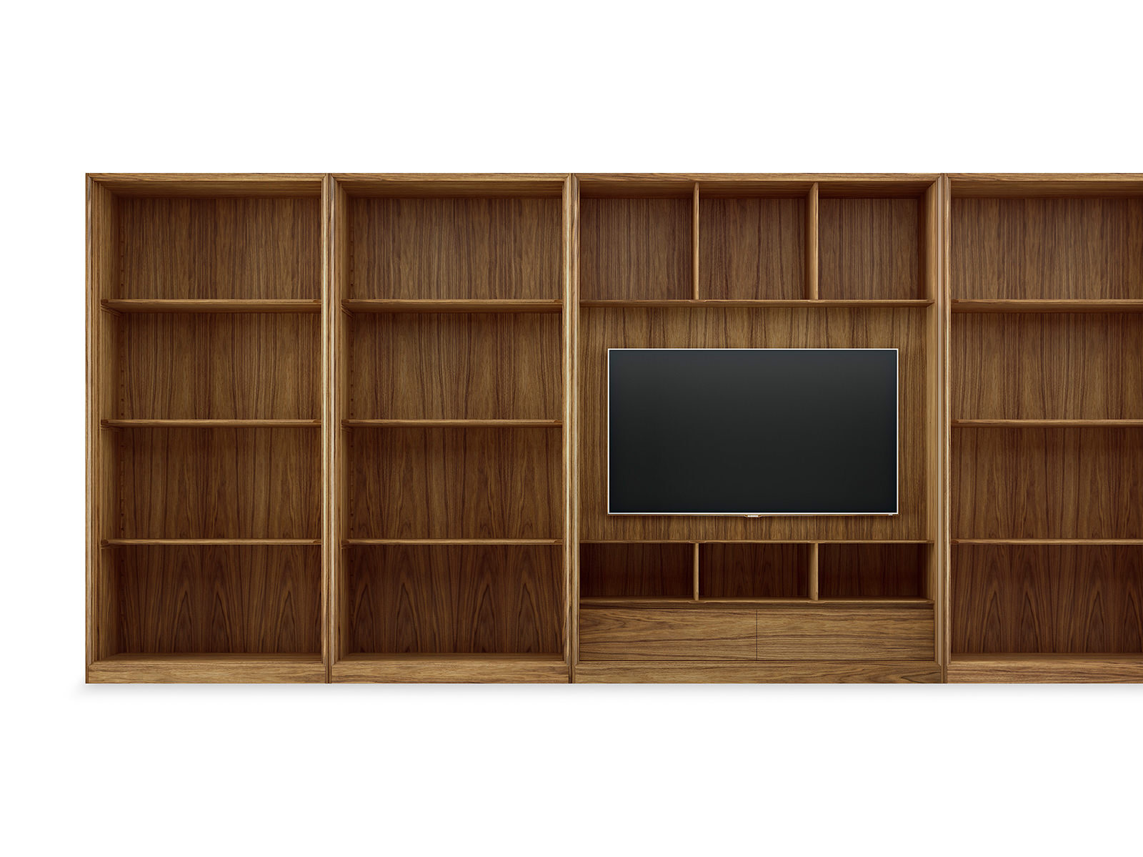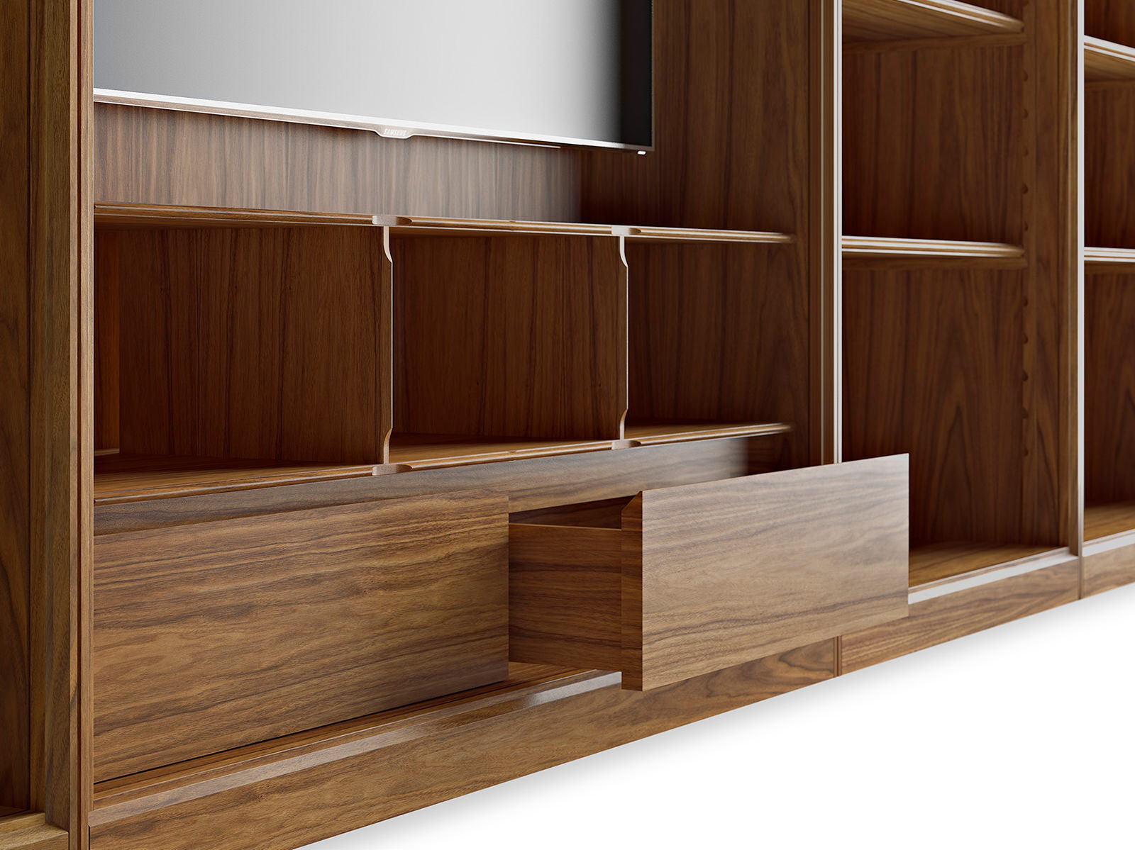 Тумба для телевизора из массива американского ореха и шпонированной фанеры с 2 выдвижными ящиками. Дизайнерская идея основанная на универсальности и эклектичности. Work - это модульная система хранения изготовленная из массива американского ореха и шпонированной фанеры которая с годами менялась в соответствии с различными потребностями. Выбор материалов для столешницы а не для дверей позволяет удовлетворить различные эстетические вкусы. Из базового модуля были изготовлены буфеты комоды столешницы витрины книжные шкафы гардеробные тумбы для телевизора и буазери. Изделие также отличается особой изысканностью конструкции которая выражается в петлях фурнитуре из полированной латуни а также в отверстиях и запорах. Например сама дверца превращается в ручку за которую можно взяться в любом месте чтобы открыть шкаф.