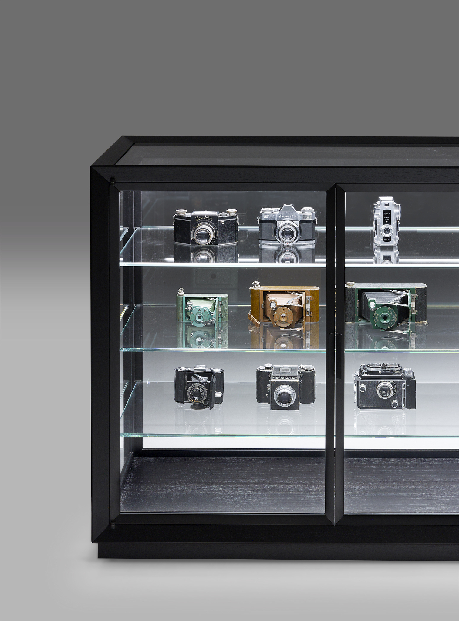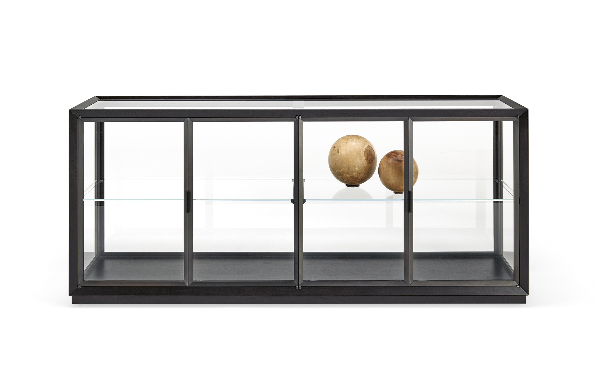 Wonderbox напоминает музейную витрину для редких и особенных предметов. Шкаф имеет простую конструкцию из массива американского ореха с прозрачными стеклянными поверхностями и тонкими рамами из бронзированного алюминия. Дверцы распашные с наклонной ручкой. Внутренние полки подсвечиваемые светодиодными лампочками регулируются по положению. Если шкаф предназначен для установки у стены можно добавить панель оклеенную обоями или оставить его полностью стеклянным а также в случае расположения в центре комнаты в качестве главного элемента жилой зоны.