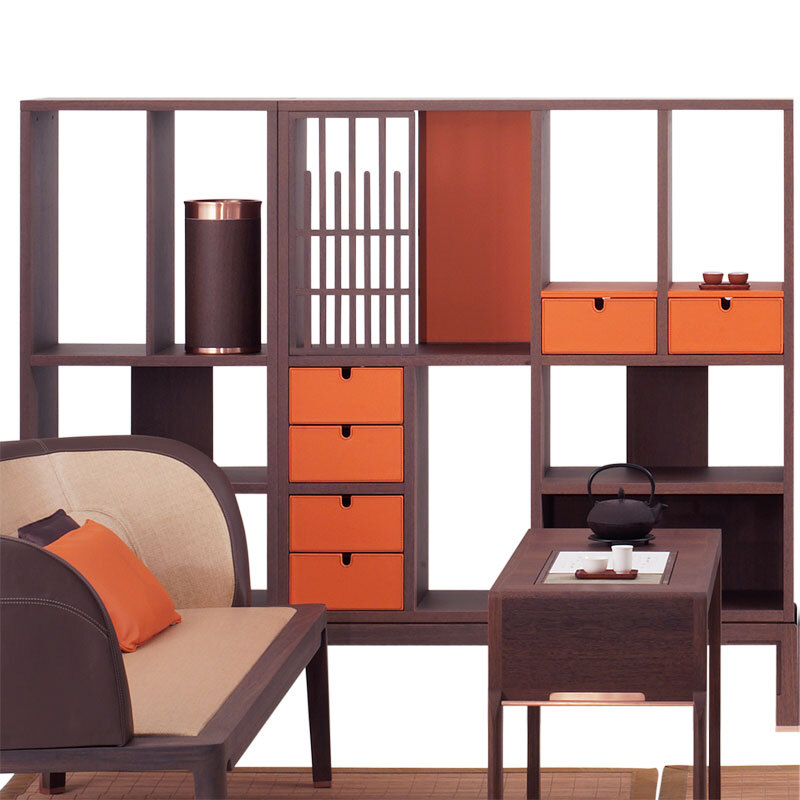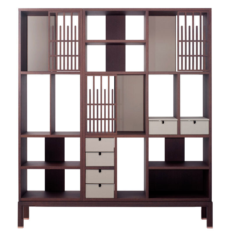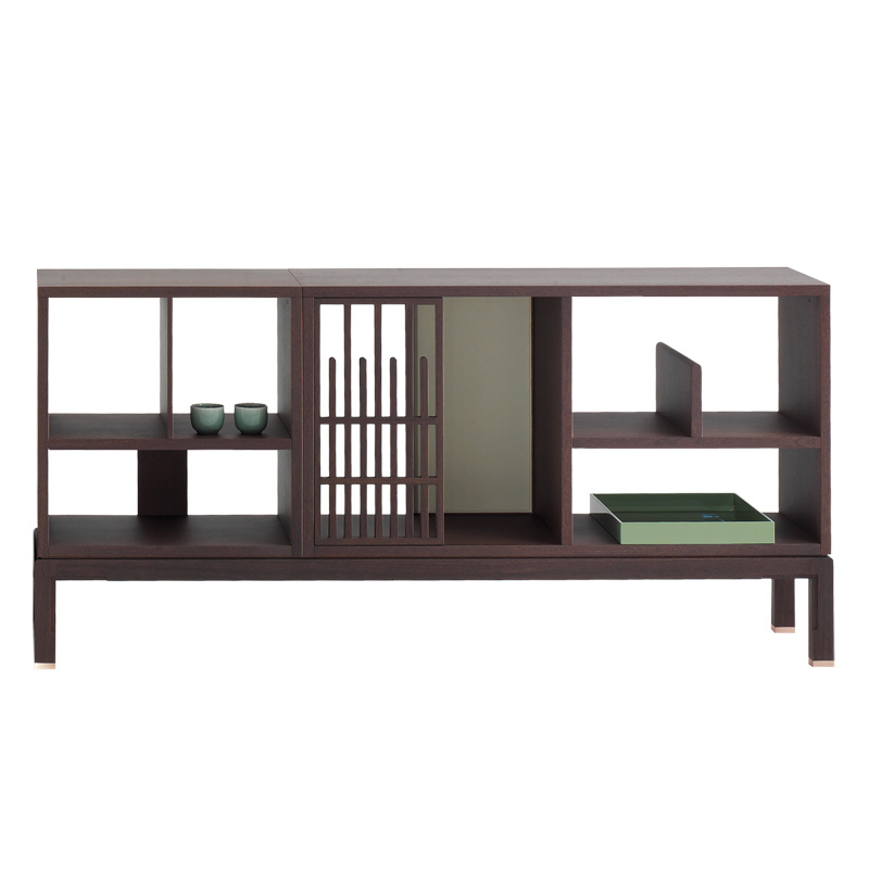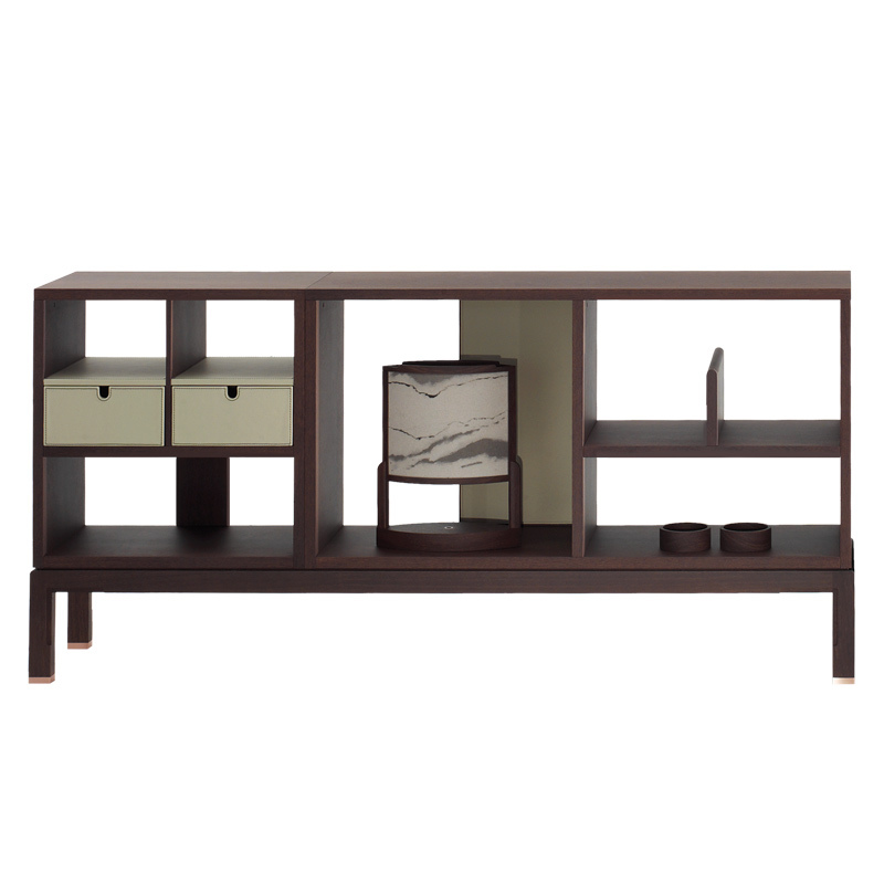 Открытый шкаф и полки AVRA 18012, деревянная рама Sucupira и раздвижные решетки, кожаные панели и выдвижные ящики, дополнительные кожаные подушки, металлические элементы без отделки. Размеры [W x D x H] в мм: 1815 x 360 x 865