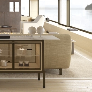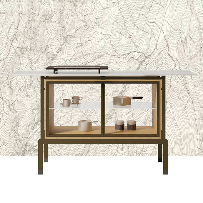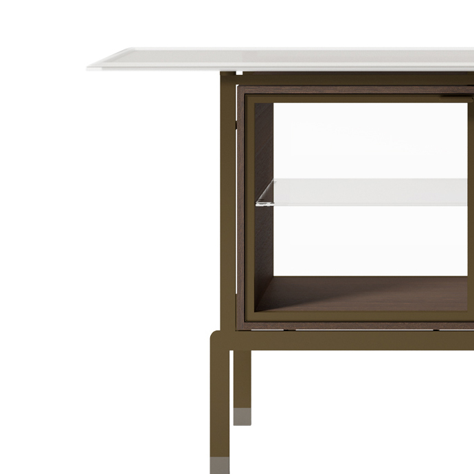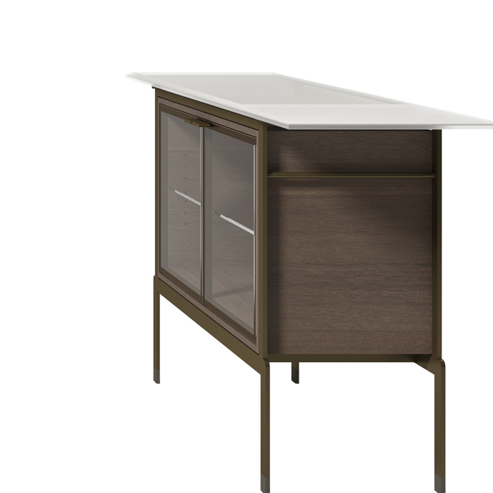 Столешница из многослойного стекла NERA 72017 Vitrine из полупрозрачной ткани или металлической сетки, обработанная пескоструйной обработкой по краям и частично сверху, дверцы из прозрачного стекла в металлической раме, регулируемая стеклянная полка, отделение из сукупиры или натурального дуба, металлическая конструкция Размеры [W x D x H] в мм: 1600 x 450 x 850