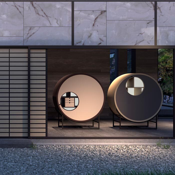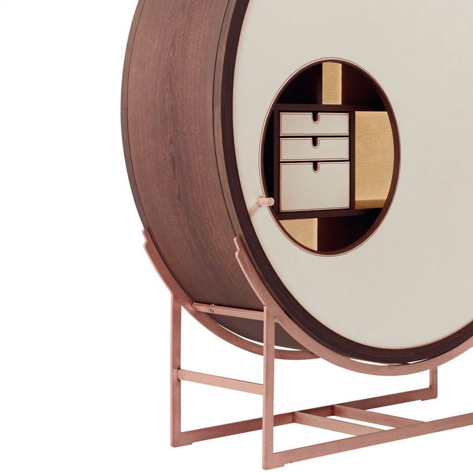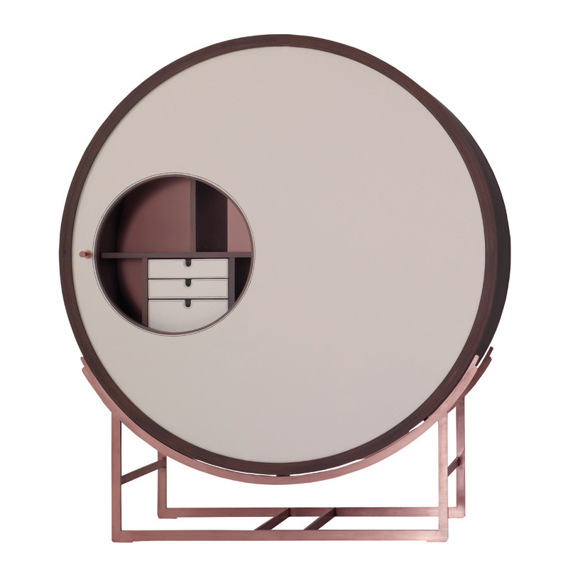 Круглый шкаф ONAR 21012 с вращающимися дверцами, деревянной рамой и полками, кожаной вращающейся дверцей и выдвижными ящиками, задней панелью, покрытой медным лаком внутри, и зеркальной панелью, окрашенной бронзой снаружи, дополнительными кожаными подушками, металлическими элементами без отделки. Размеры [W x D x H] в мм: 1500 x 430 x 1730