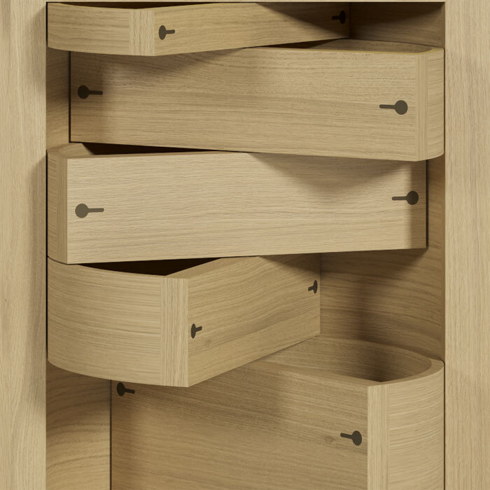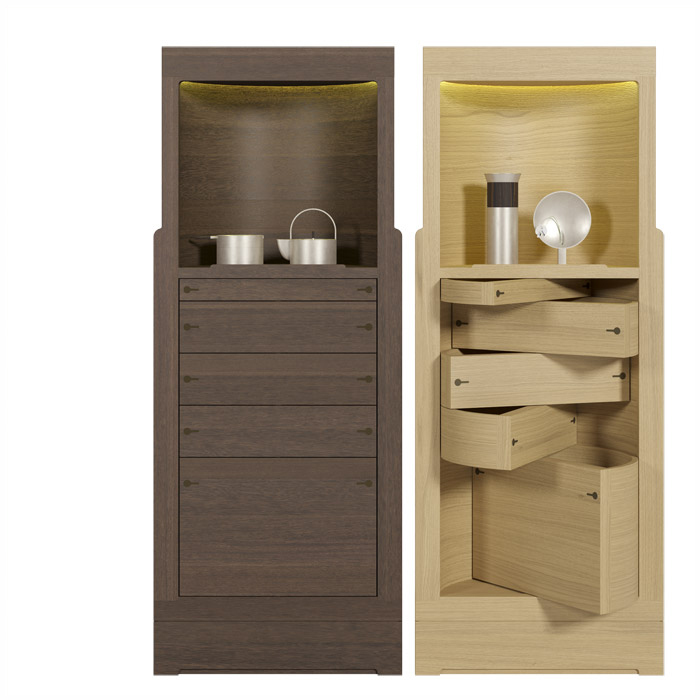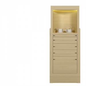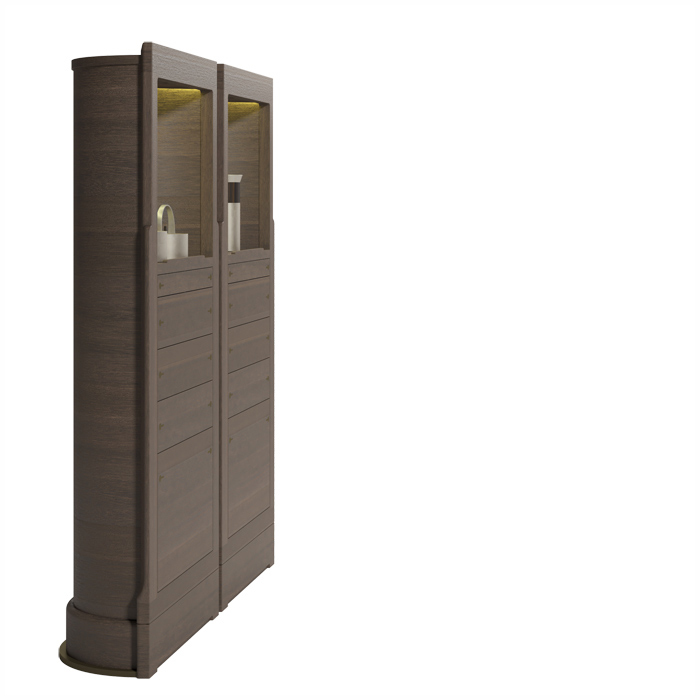 Столешница SIMA 57217 выполнена из сосны или натурального дуба, с вращающимися полукруглыми выдвижными ящиками, верхней нишей со скрытой светодиодной подсветкой, металлическими вставками и основанием. Размеры [W x D x H] в мм: 690 x 320 x 1600