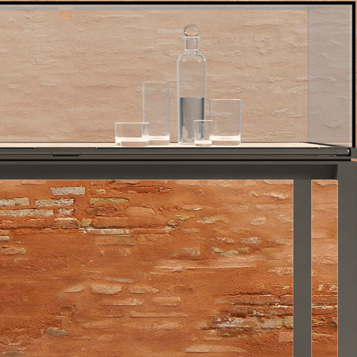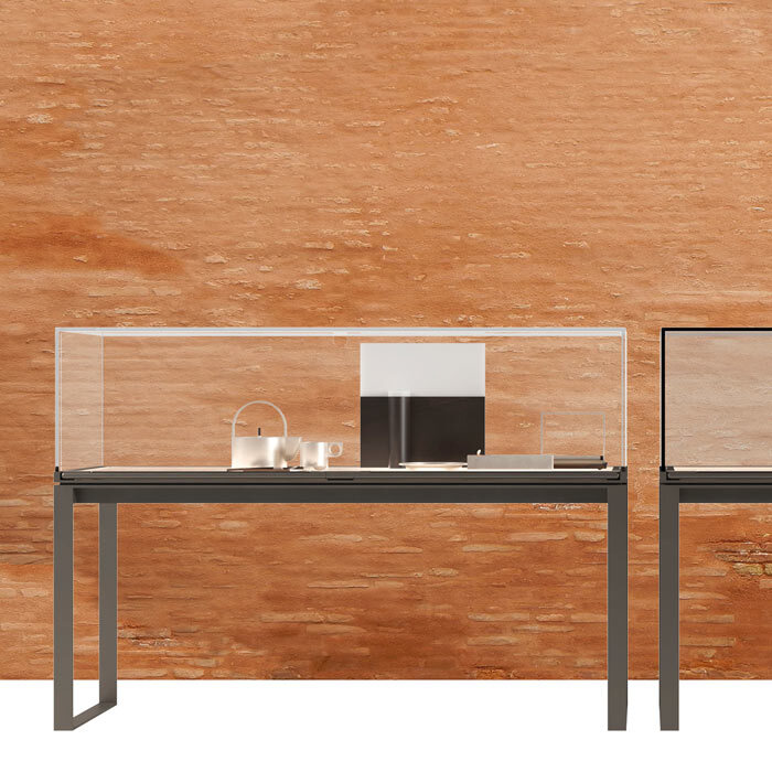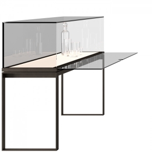 Витринный шкаф SIYI 77019 на высоком основании, корпус и откидная дверца из прозрачного или серого стекла с равномерным светодиодным освещением, металлическая петля и основание Размеры [W x D x H] в мм: 1200 x 360 x 850