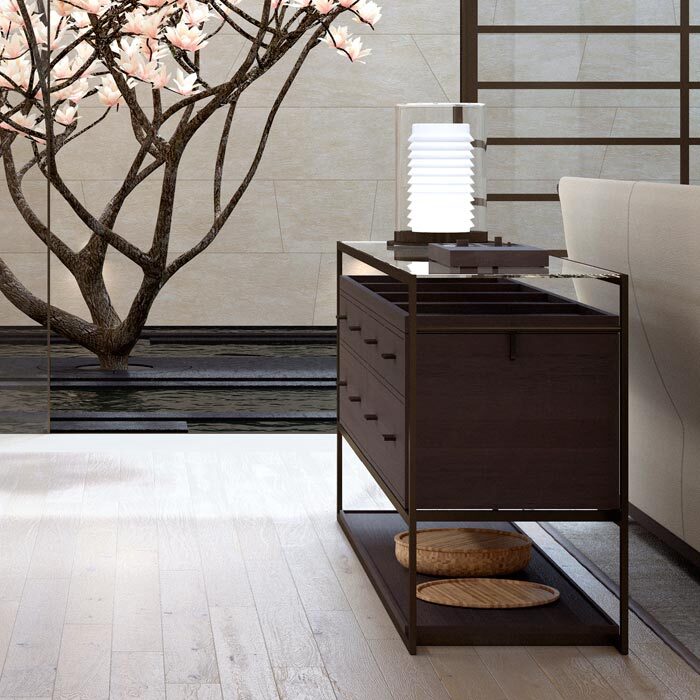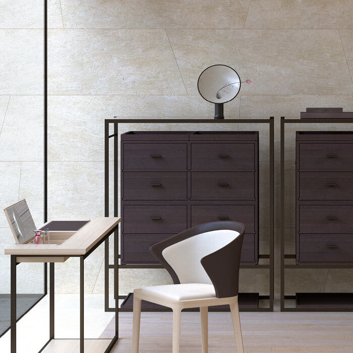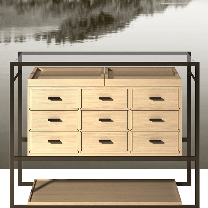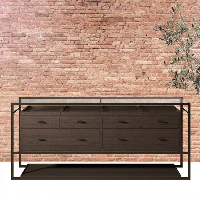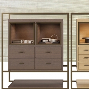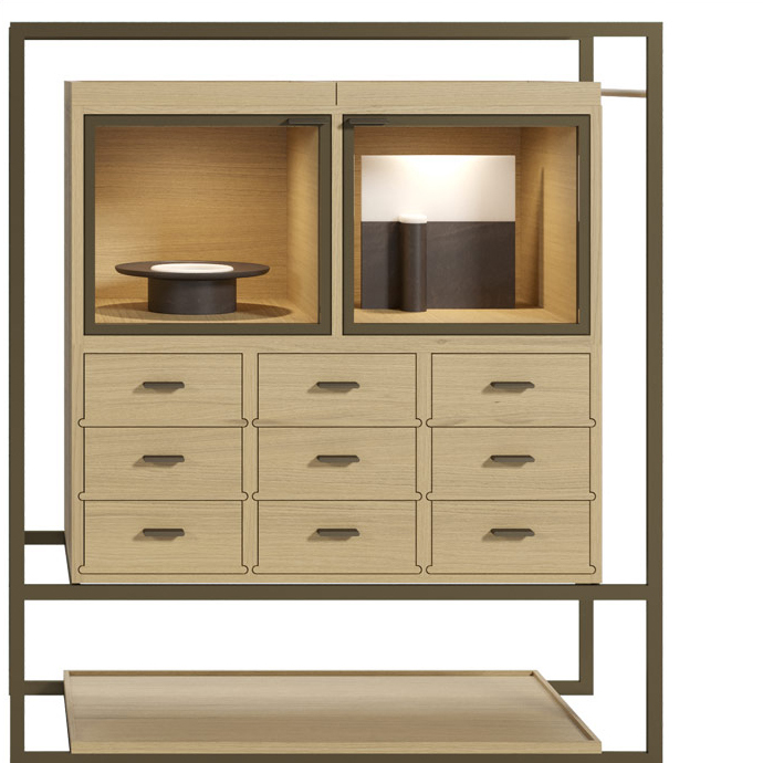 Высокий шкаф VERO 30317, витрина со светодиодной подсветкой, с двумя стеклянными дверцами в металлическом обрамлении, четырьмя выдвижными ящиками, нижними лотками из сосны или натурального дуба, металлической рамой, столешницей из закаленного особо прозрачного стекла. Размеры [W x D x H] в мм: 1120 x 500 x 1280