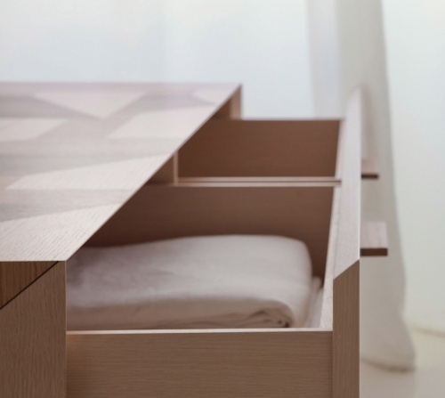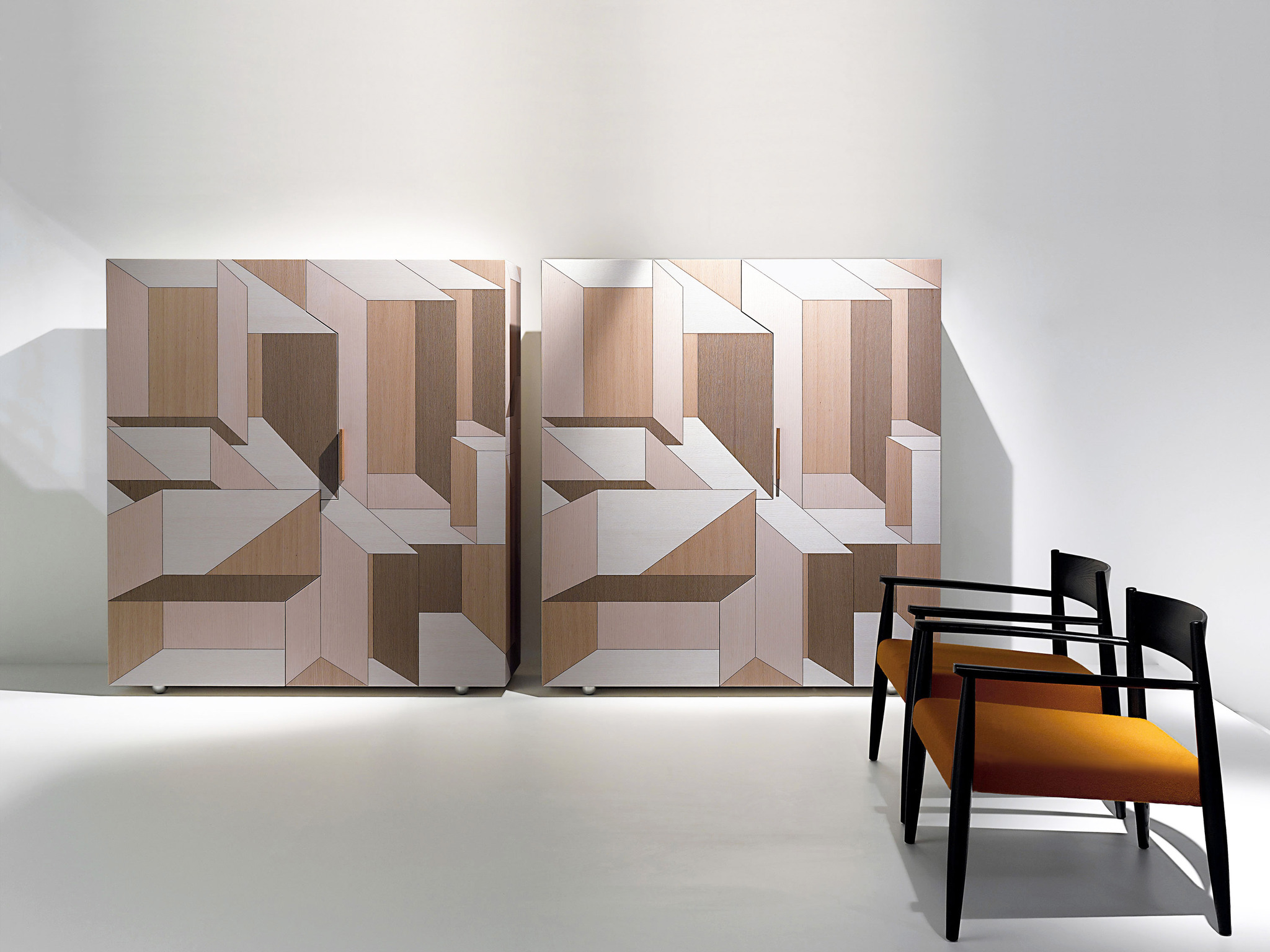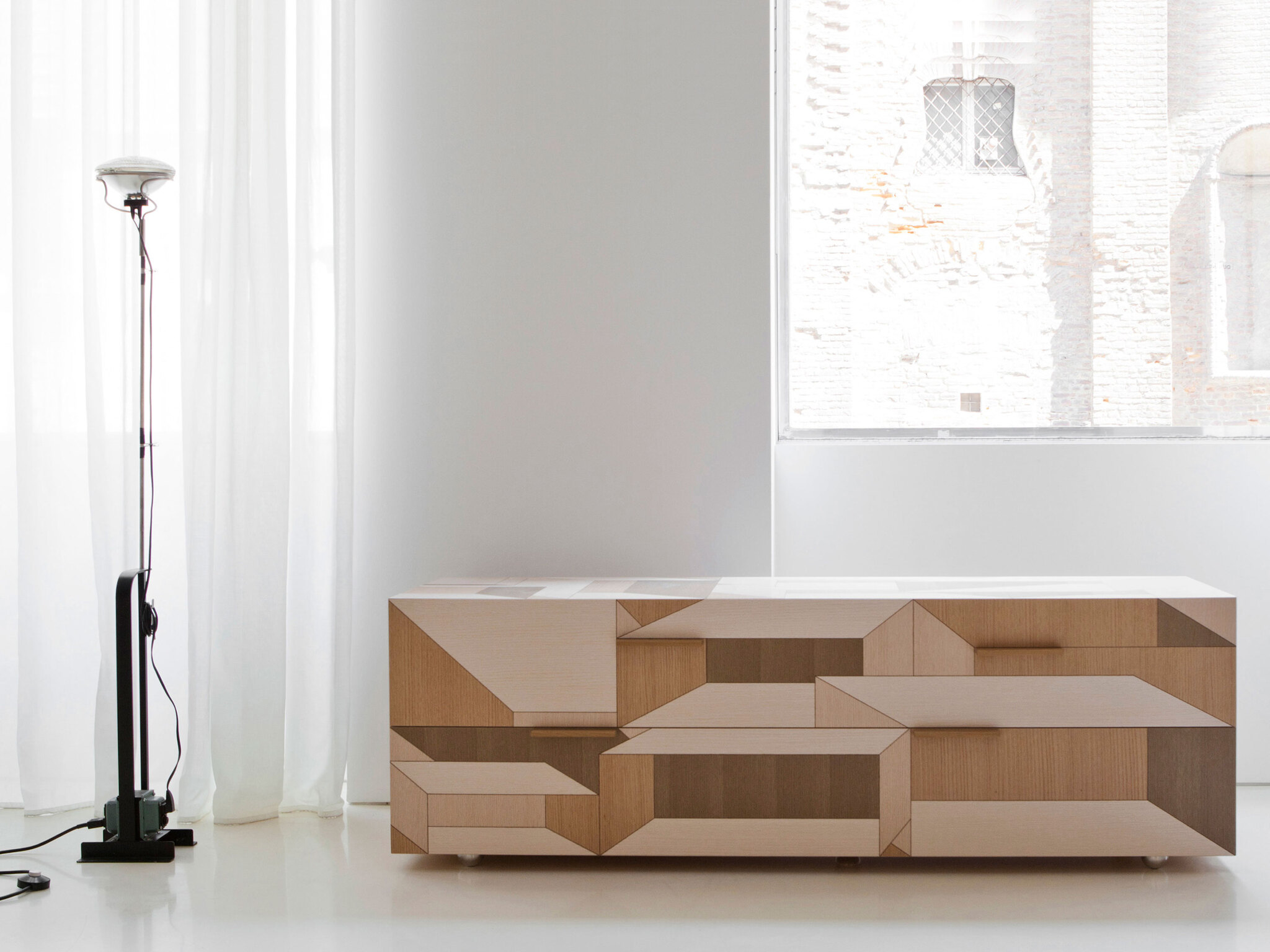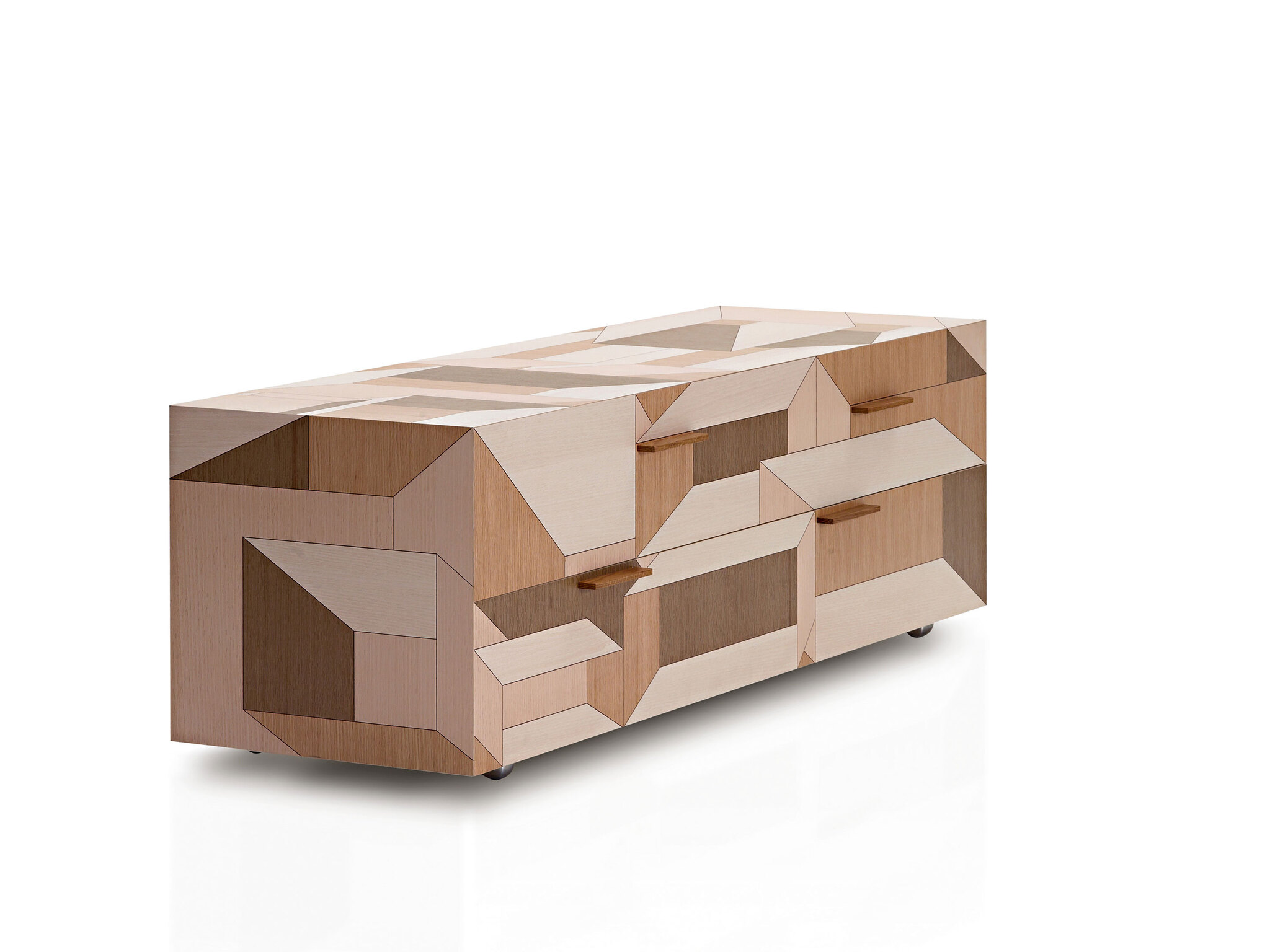 Инкрустация полностью воссоздает технику инкрустации, древнюю и ценную традицию старых времен. Изделие доступно в двух вариантах: сервант для гостиной и комод с 2 выдвижными ящиками, покрытый декором, напоминающим параллелепипеды, пересекающиеся в пространстве, что создает уникальный трехмерный эффект. Инкрустация - это результат точной технологии обработки, с использованием 4 различных цветов дуба и черного профиля: контурная линия, разделяющая различные грани текстуры и определяющая дизайн. Сервант имеет уникальное асимметричное отверстие и оснащен простыми внутренними полками и разделителями. В комоде имеется 2 выдвижных ящика, оснащенных 2 внутренними лотками и одной передней панелью. Ручки с инкрустацией выполнены из массива дуба; внутренняя поверхность серванта и комода выполнена из натурального дуба.