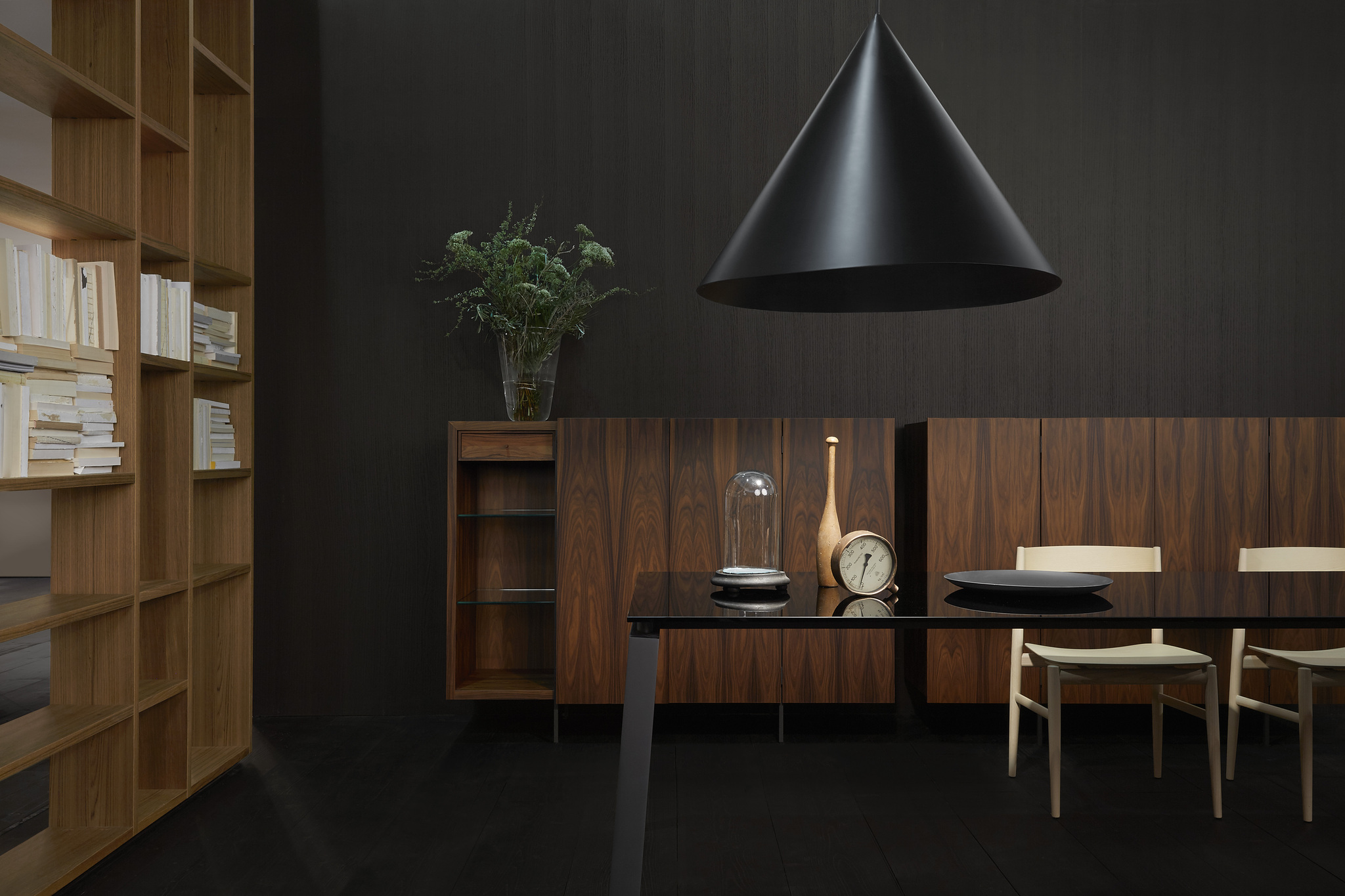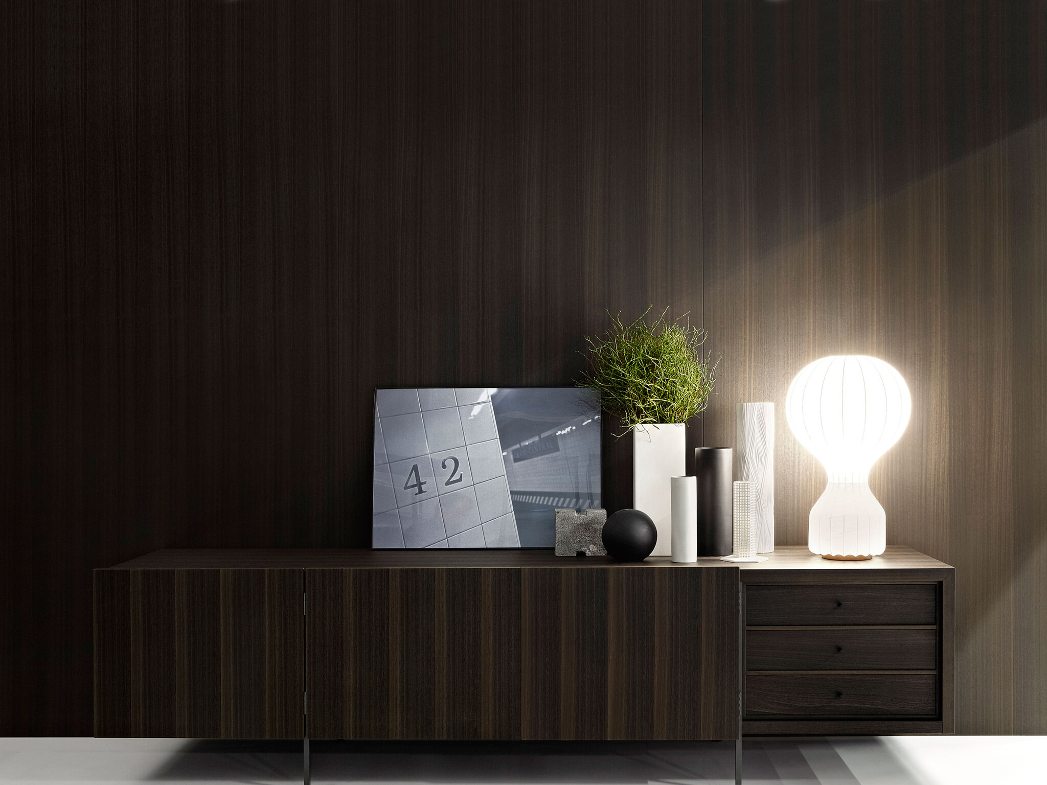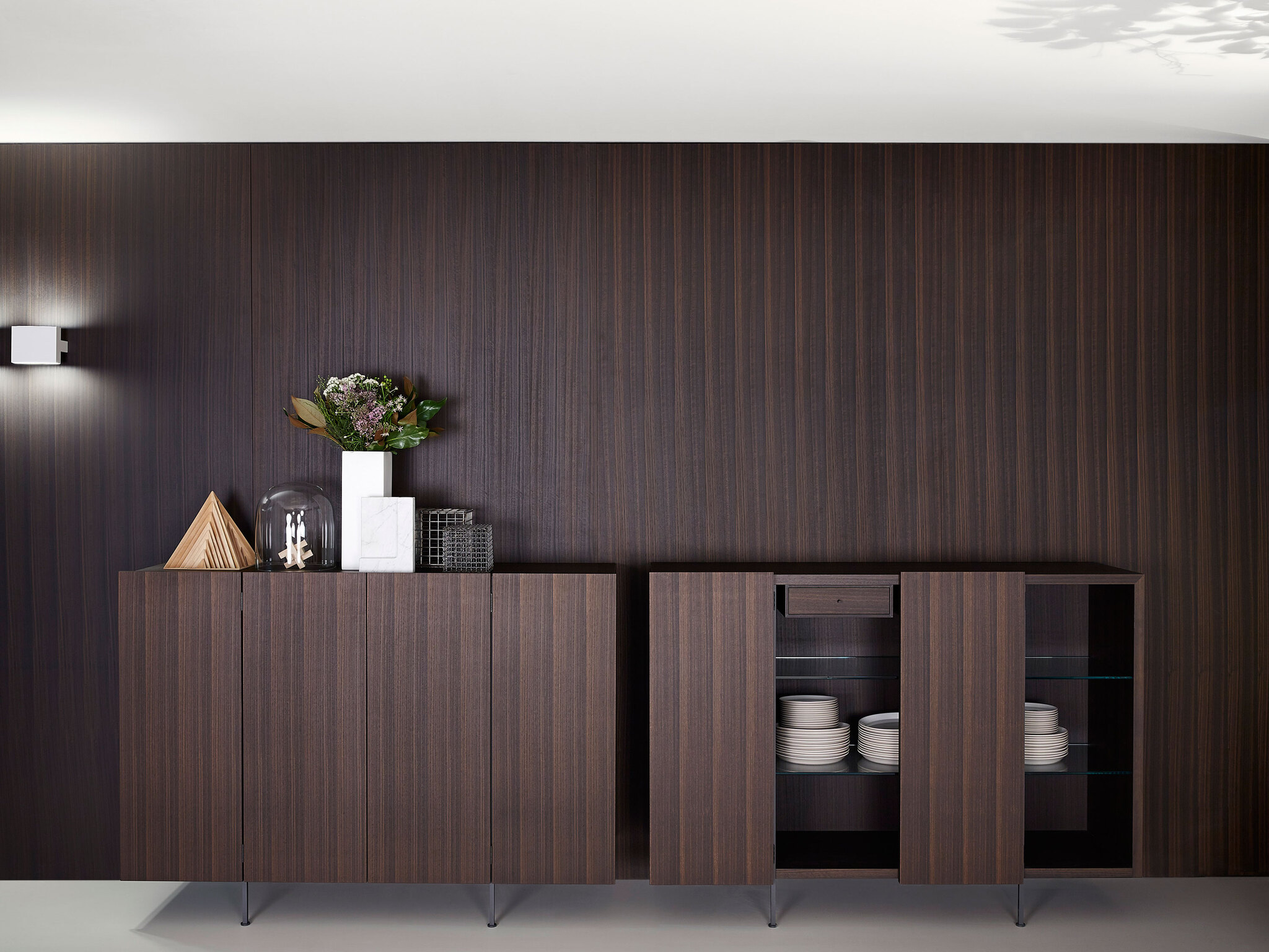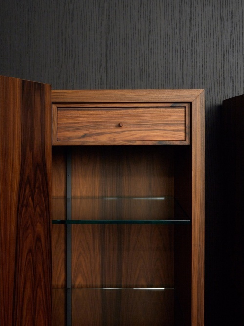 Сервант Tiller доступен в двух вариантах: вертикальный, длиной 1600 мм и горизонтальный, длиной 2330 мм. У Tiller 4 дверцы, которые открываются одна над другой на 180°, что приятно меняет дизайн его лицевой стороны. Сервант, приподнятый над полом на 4 металлических матовых ножках, еще раз подчеркивает техническую компетентность бренда, позволяя тестировать новые системы открывания и технологии. Румпель изготавливается из эвкалипта или палиссандро Сантоса и имеет внутренние полки из стекла, и обе модели могут быть оснащены внутренними выдвижными ящиками с одинаковой отделкой.
