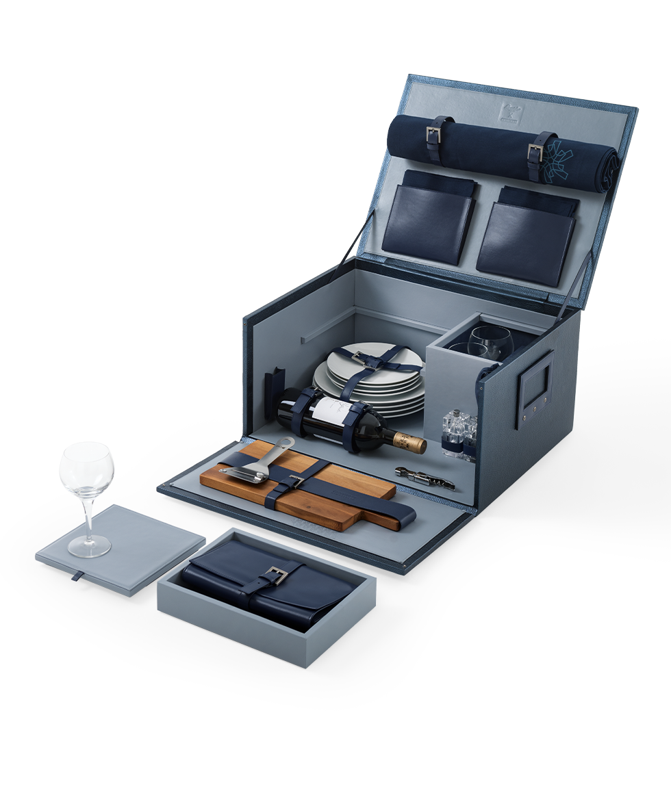 Пикник-корзина с внешней отделкой из кожи с натуральной фактурой, внутри — подкладка из кожи с полу-анилиновой выделкой. Pineider X Giorgetti