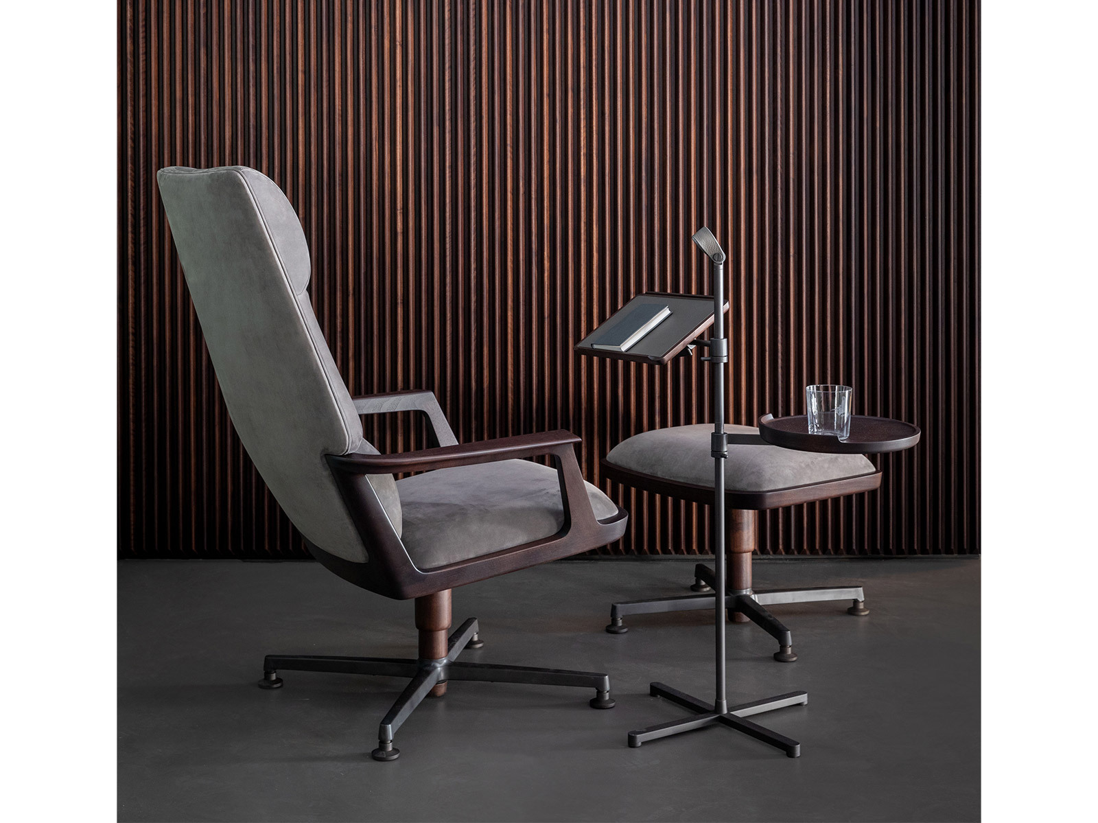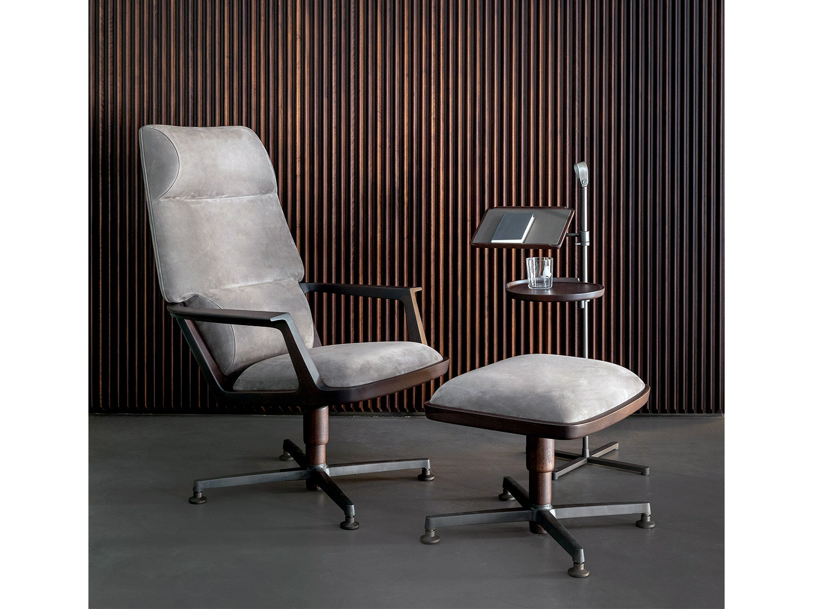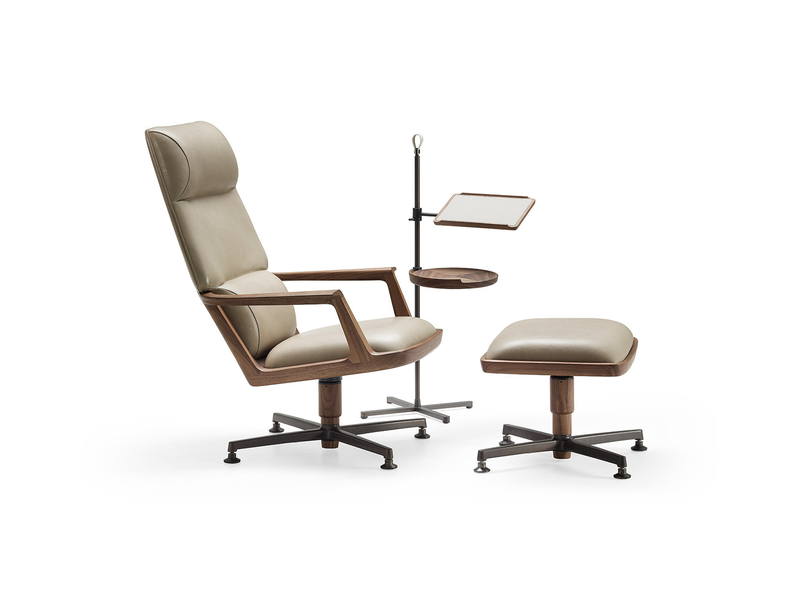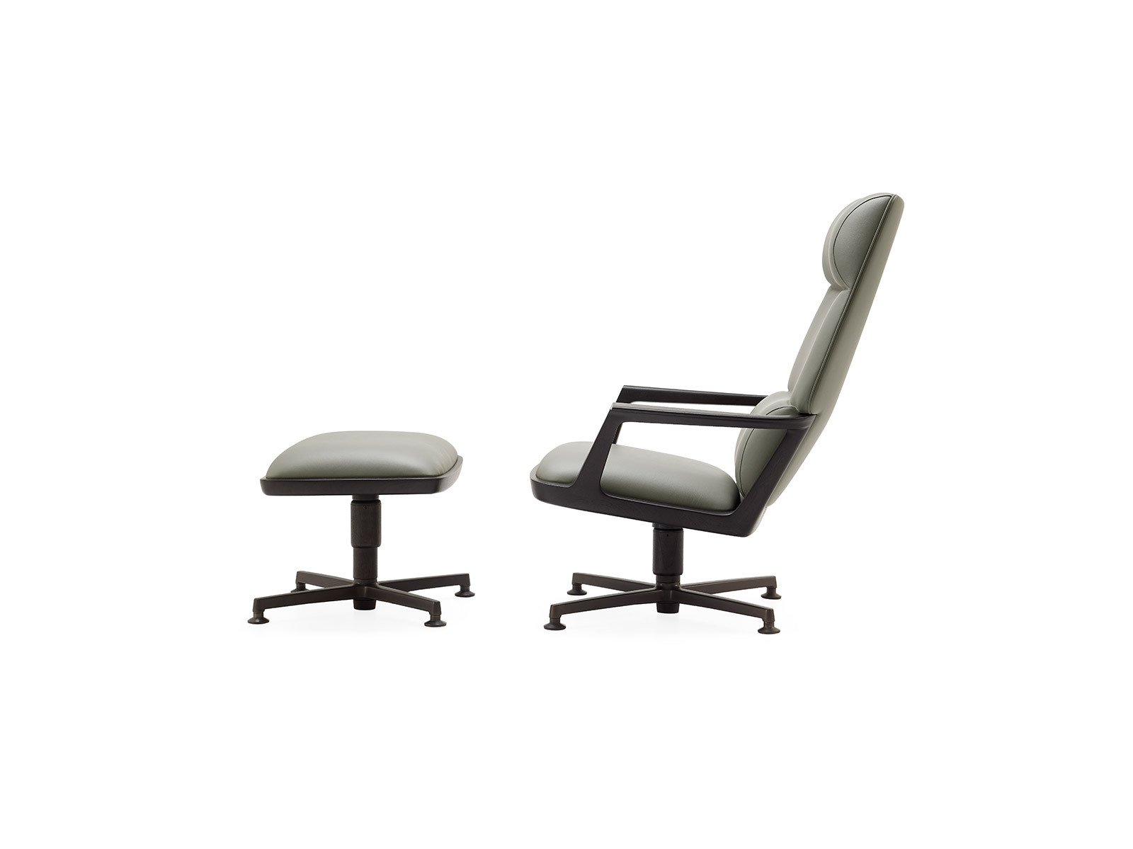Кресло Pigra обеспечивает высокий уровень комфорта благодаря идеальному балансу между достаточно тонким массивным каркасом из ореха и мягкой частью с памятью формы. У кресла широкое сиденье и высокая ровная спинка а также подставка для ног позволяющая удобно и расслабленно сесть. Основание состоит из четырёх алюминиевых спиц с бронзовым покрытием поддерживающих конструкцию. Кресло доступно с обивкой из ткани или кожи по цветам из прайс-листа. Внимание к деталям в пропорциях между структурными и мягкими частями а также высокий уровень качества всех компонентов делают это кресло весьма привлекательным.