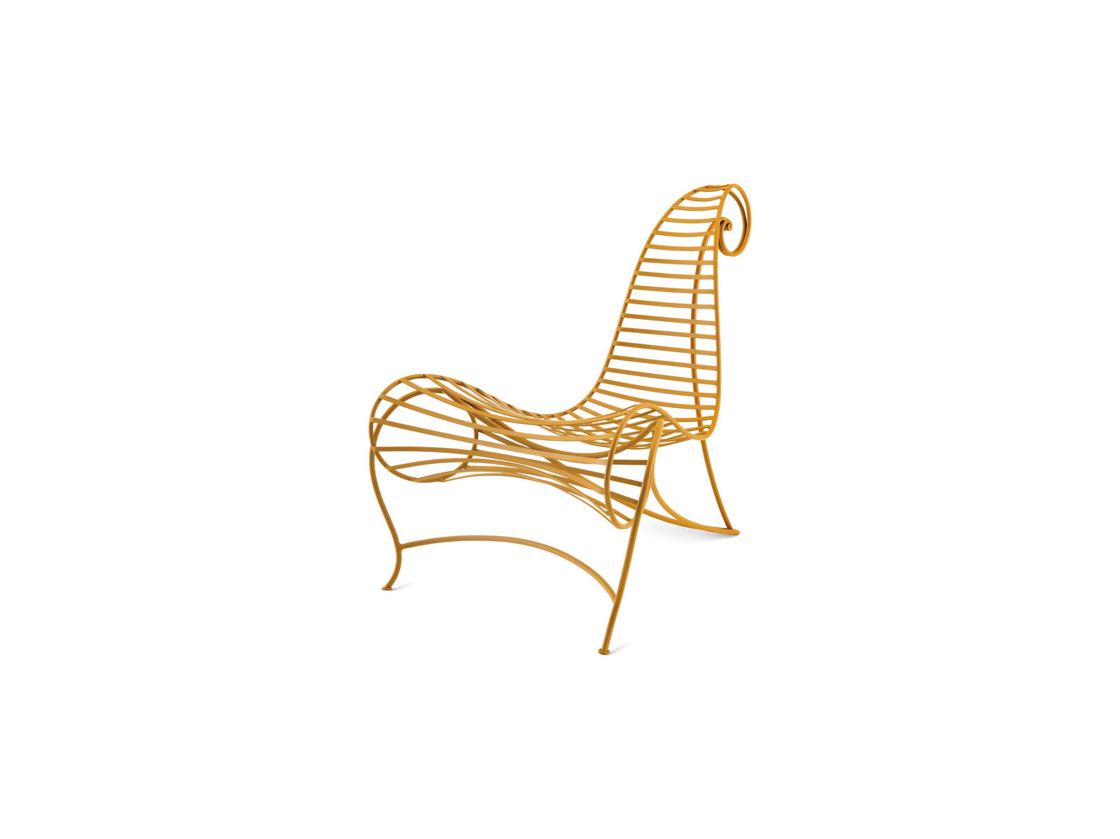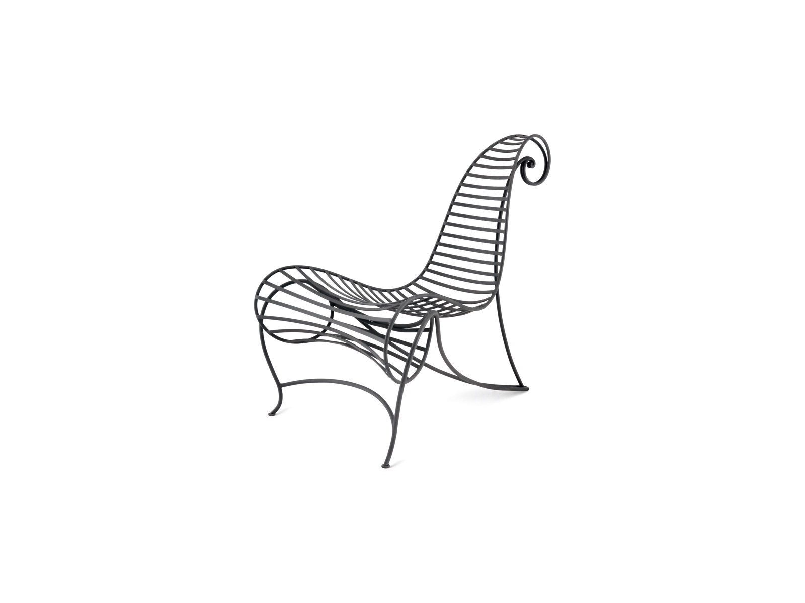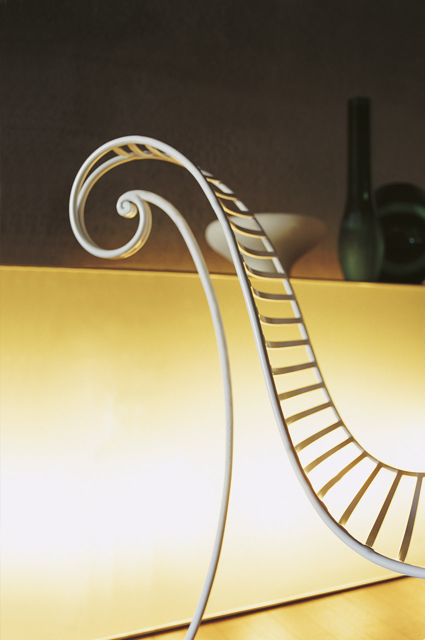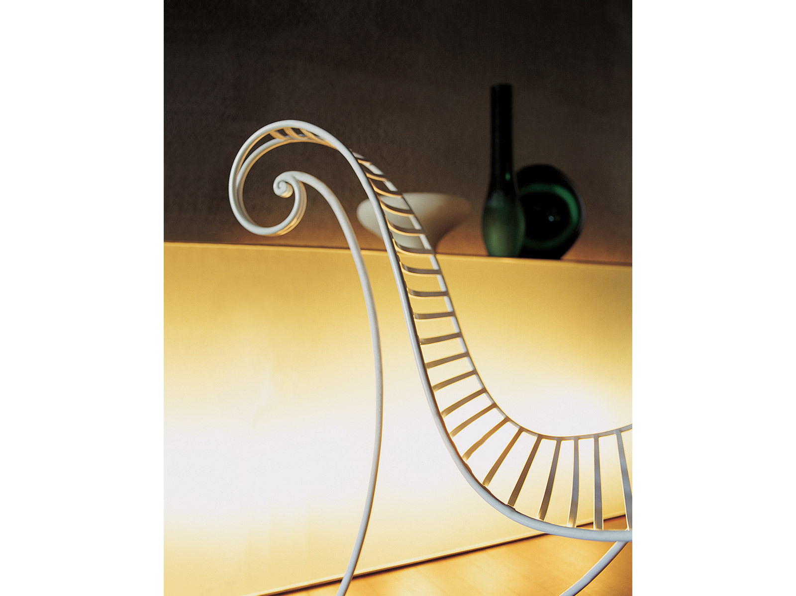 Ceccotti Collezioni не ограничивается деревом и экспериментирует с другими материалами включая железо в сотрудничестве с художником Андре Дюбруа который в начале карьеры посвятил исследованию этого материала особое внимание. В результате появилось несколько культовых изделий таких как кресло Spine Chair созданное в 1992 году. Это кресло вобрало в себя ностальгическое очарование мебели из железа оставаясь вне времени. Каркас выполнен из плоских 10-миллиметровых полос которые изгибаются и обволакивают тело обеспечивая комфорт. Доступно во множестве цветов подходит для оригинального оформления интерьеров и открытых пространств.