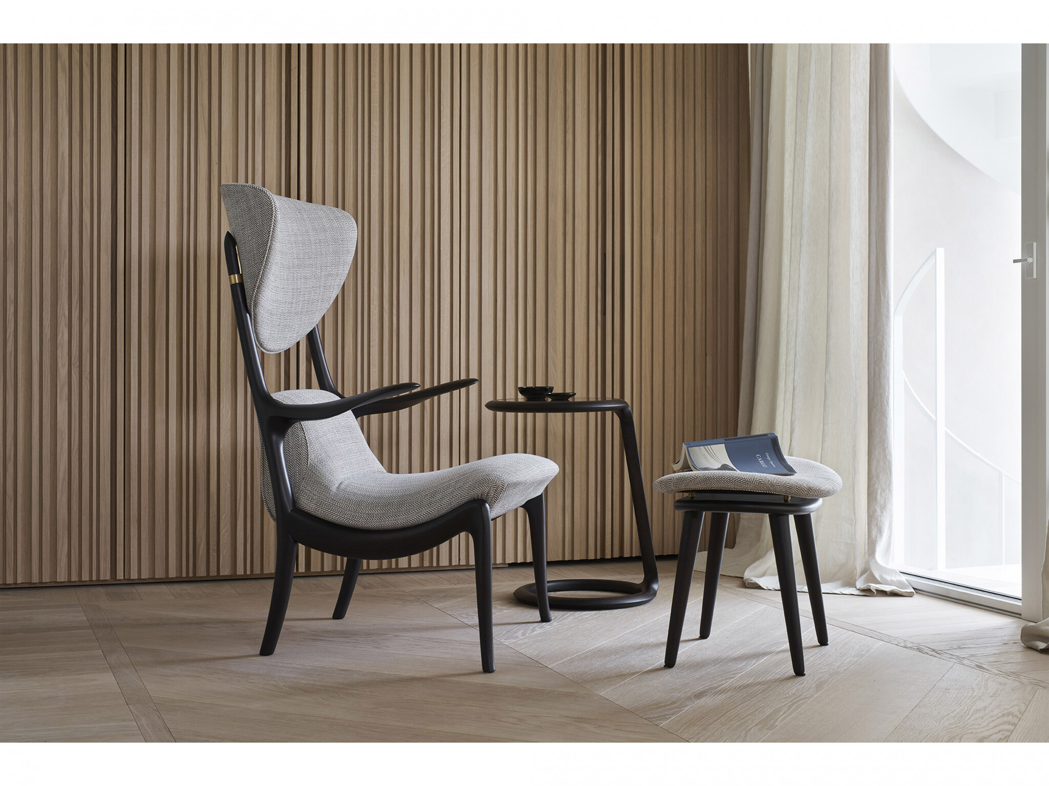 Кресло Star Trek и пуф Star Trek спроектированные Роберто Лаццерони в 1994 году во время его летнего отпуска в Лампедузе переосмысливают мечту всех любителей чтения. История этих предметов начинается с кресла "Tre Pezzi" Франко Альбини и отражает игру перекрёстных отсылок. Star Trek является объединением итальянского и скандинавского дизайна. Название придумал сотрудник бюро Лаццерони и отражает его чувство юмора ведь дизайнер хотел переосмыслить дизайн Альбини. Лаццерони "играет" с пропорциями придавая спинке кресла и необычным подлокотникам преувеличенные размеры. Здесь явно выражена игривость и ирония как отмечал сам Роберто Лаццерони. Исходным элементом дизайна стала боковая часть кресла которая является его ключевой особенностью а спинка завершает композицию. В изделиях Ceccotti Collezioni технология никогда не является самоцелью а скрыта за чистыми линиями и формами. Например механизм крепления спинки скрыт в стыке дерева и латуни и становится декоративным элементом. Чтобы сделать предмет ещё более выразительным он доступен с отделкой из шеллака придающей яркий глянцевый вид.