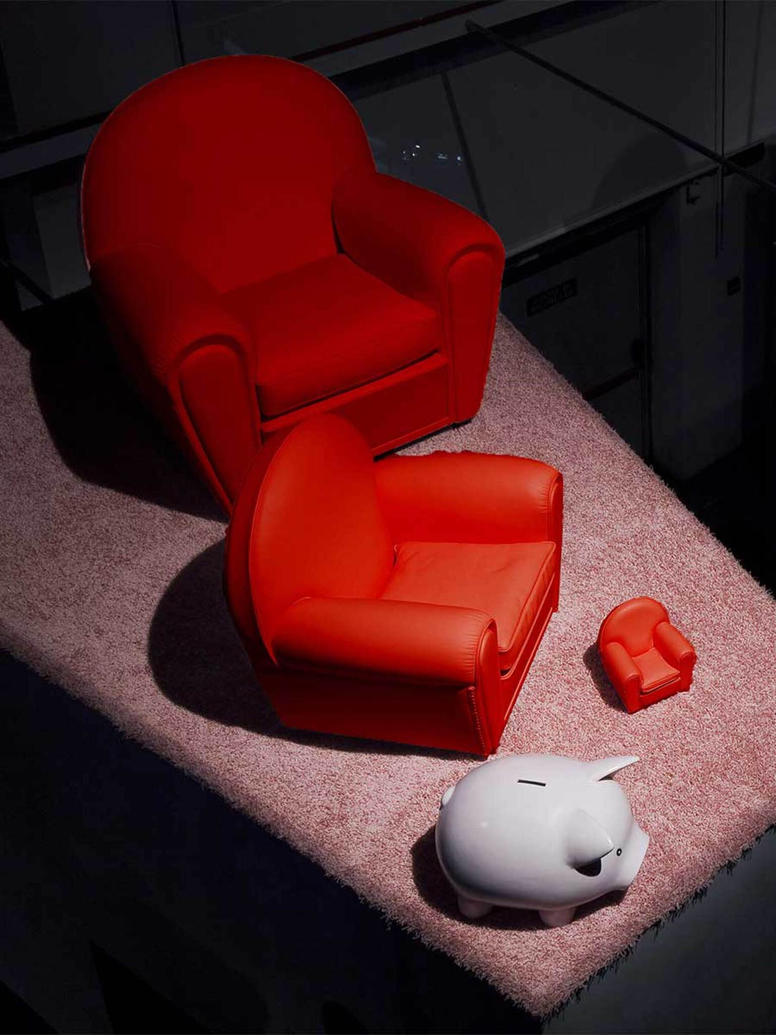 Официально это сиденье называется “модель 904”, но с 1984 года известно как Vanity Fair, и со временем стало эмблемой Poltrona Frau. Считается, что проект, впервые запущенный в производство в 1930 году, был разработан на основе эскизов, которые Ренцо Фрау оставил своей жене Савине. Намеренно объемная конфигурация кресла Vanity Fair сделала его одной из универсальных икон итальянского дизайна. Vanity Fair также доступен в “детском” варианте, который ровно на две трети меньше оригинала, и представляет собой удобный пуф.
