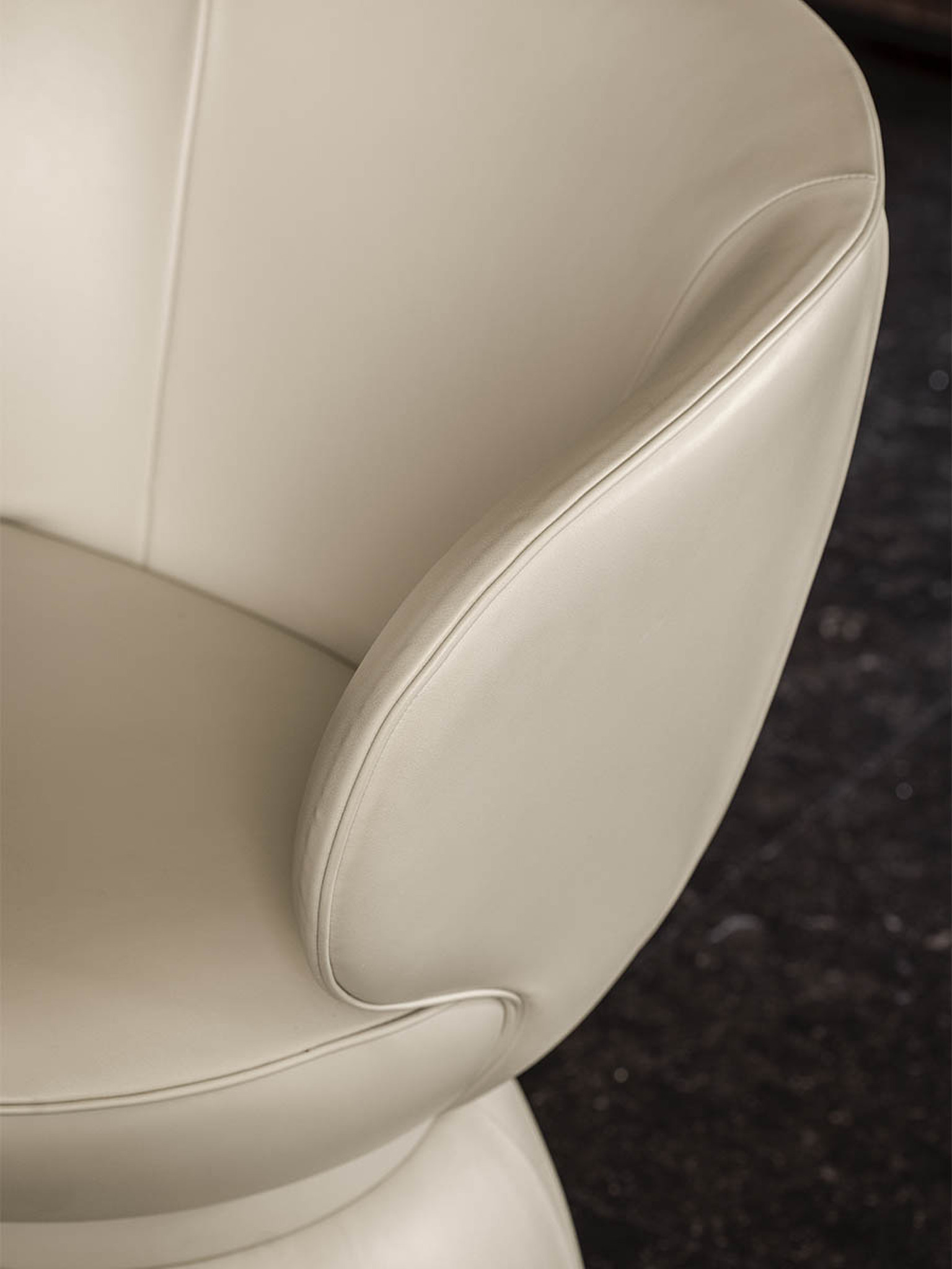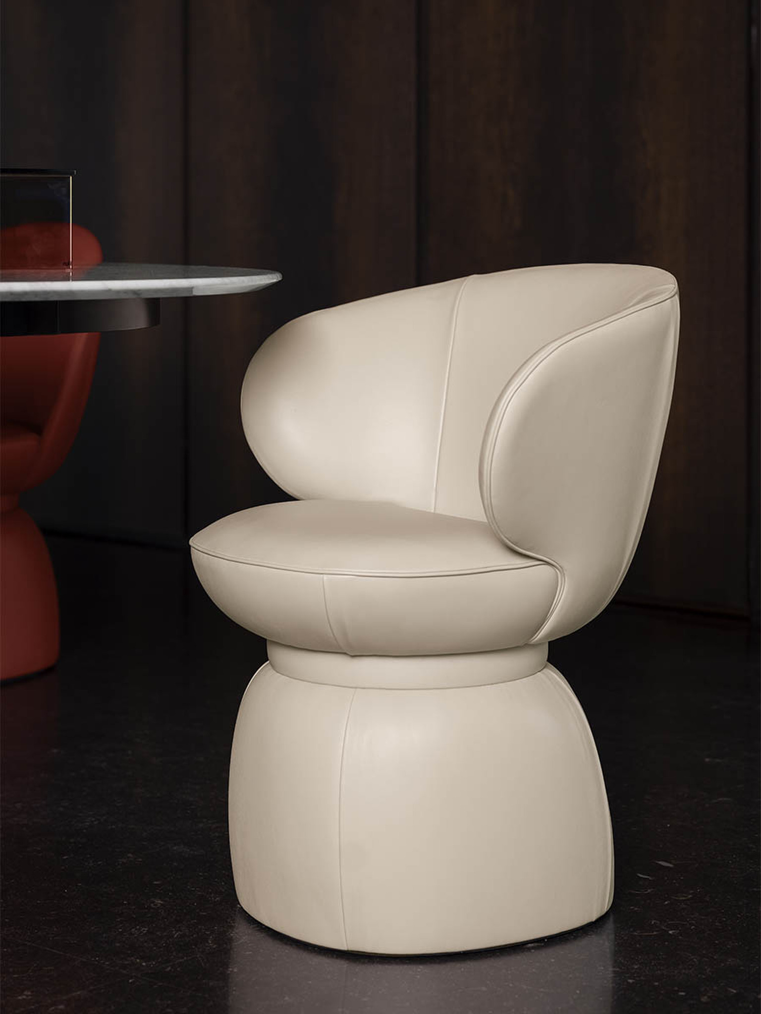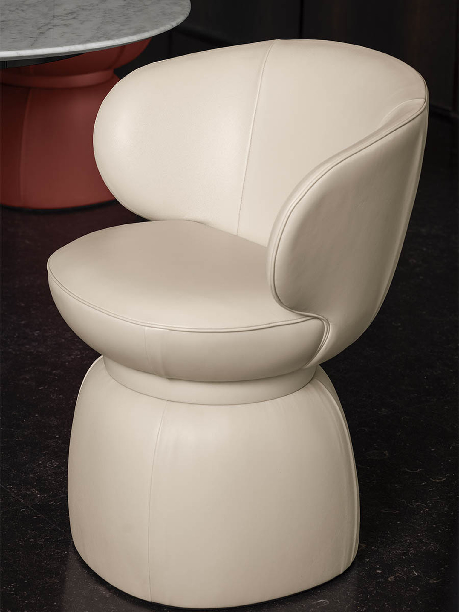 Leplì - это стул, кресельное кресло, табуретка, скамья и пуф. Кенсаку Оширо разрабатывает четыре универсальных изделия с ярко выраженной индивидуальностью. Дизайнер использует традиционные технологии и украшения Poltrona Frau, сочетая их с деталями портновского стиля, заимствованными из мира моды. Классическая прострочка и мягкие складки подчеркивают изящную простоту дизайна. Соблазнительные изгибы стула, в частности, навеяны женскими формами, а тонкий пояс, как и в платье, подчеркивает ее “талию”.