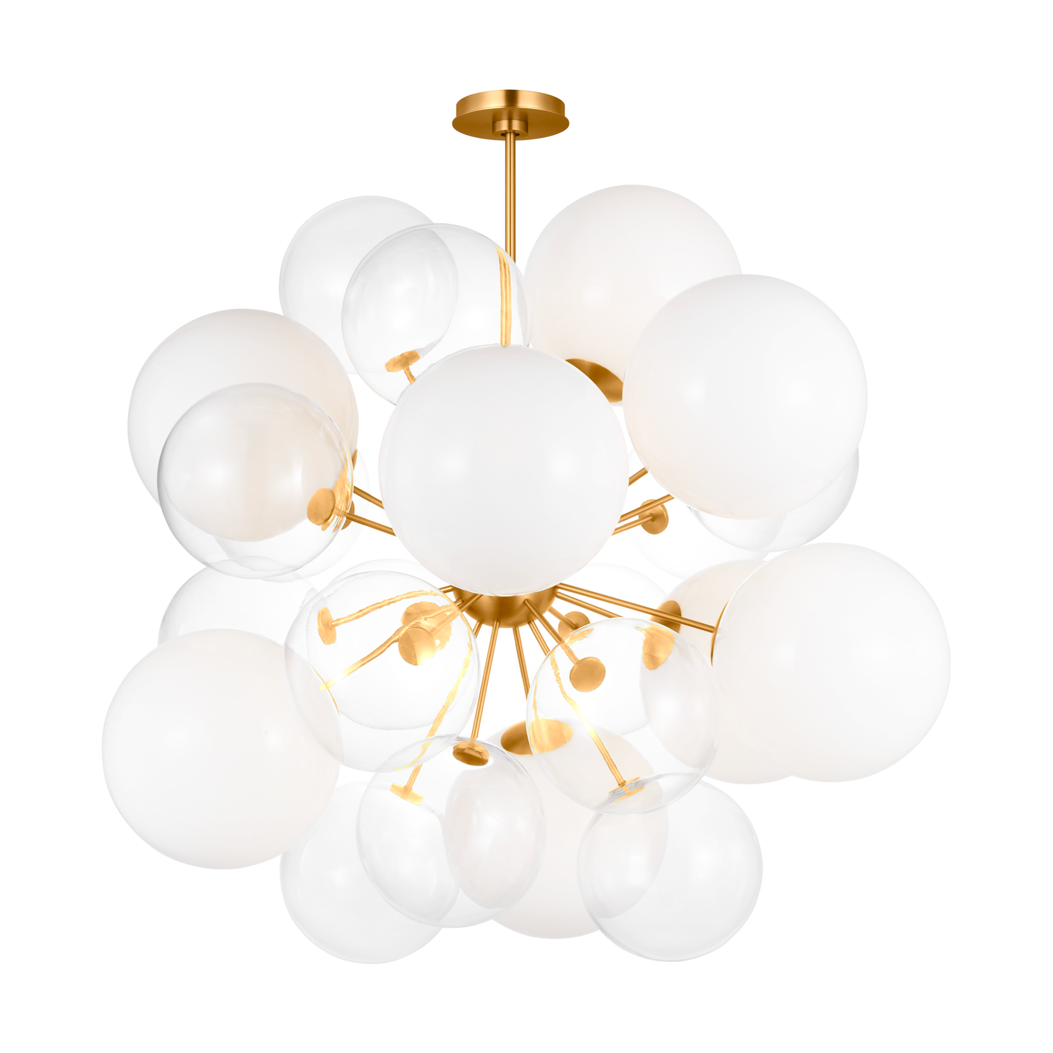Большая люстра Aria представляет собой очаровательную композицию из молочно-белых и прозрачных стеклянных шаров, расположенных в виде элегантного скопления пузырьков. Эти шары отходят от центральной золотой сердцевины, создавая эффектное украшение. Отделка из полированной латуни придает изделию изысканный, роскошный оттенок, усиливая сияние стекла. Эта люстра, которая идеально подходит для создания современной и в то же время праздничной атмосферы в любом помещении, отличается шиком и функциональностью. Влагостойкий, он подходит для самых разных условий эксплуатации и идеально сочетает в себе художественность и практичность.