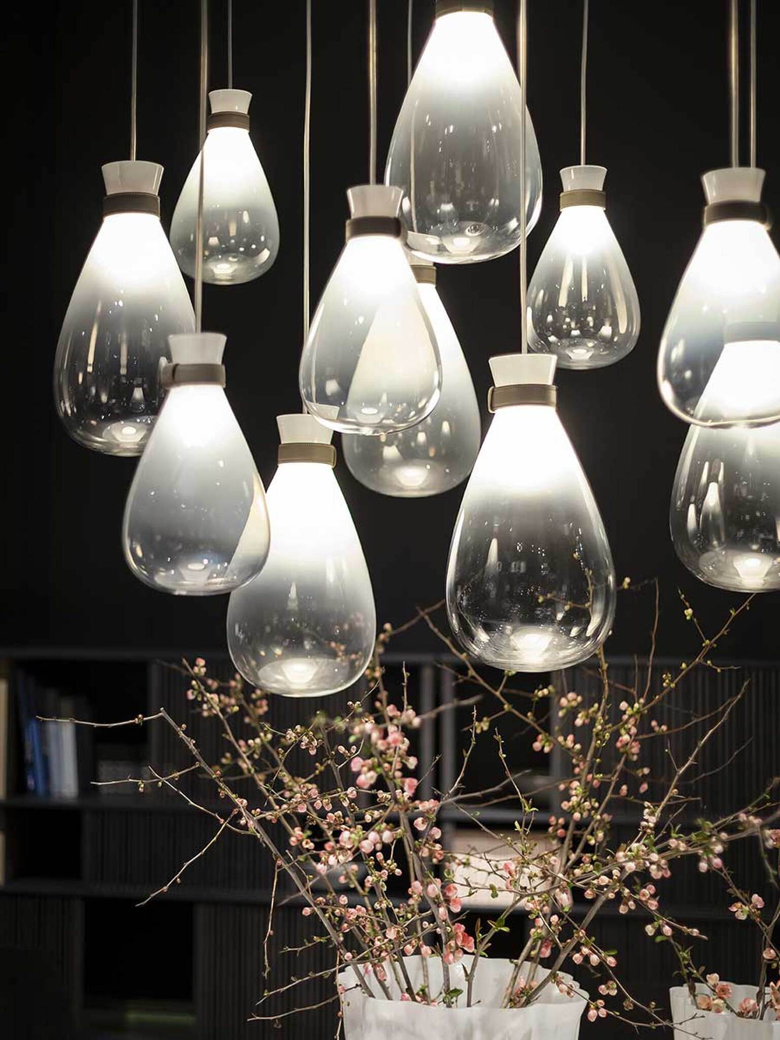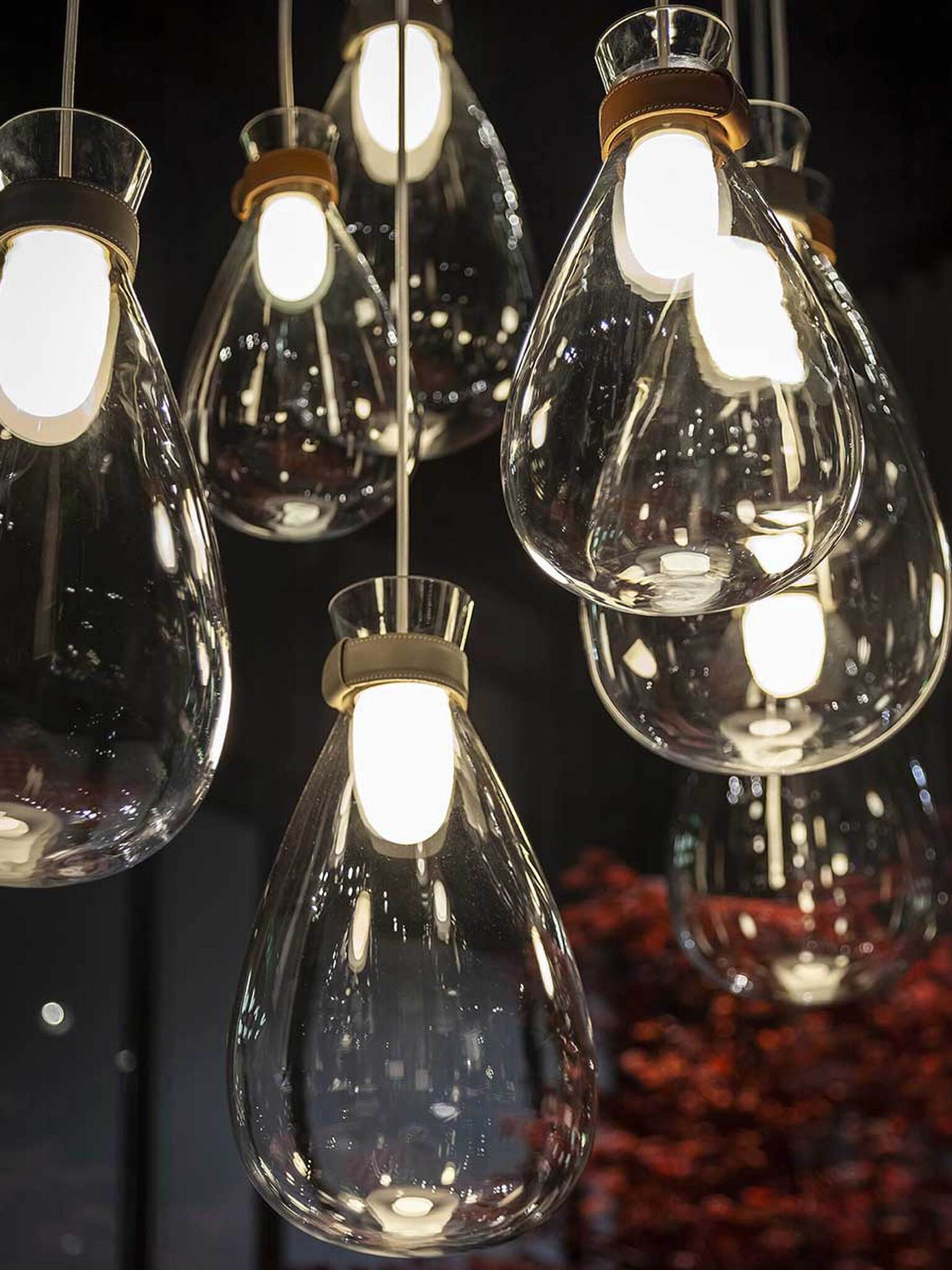 Soffi. Чистота света и стекла, выдуваемого искусными венецианскими мастерами. Минималистичный дизайн GamFratesi точно отражает тот момент, когда техника выдувания придает стеклу форму. Изящные шары неправильной формы, словно подвешенные в пространстве под действием силы тяжести, словно вырастают из тонкого ремешка из седельной кожи.