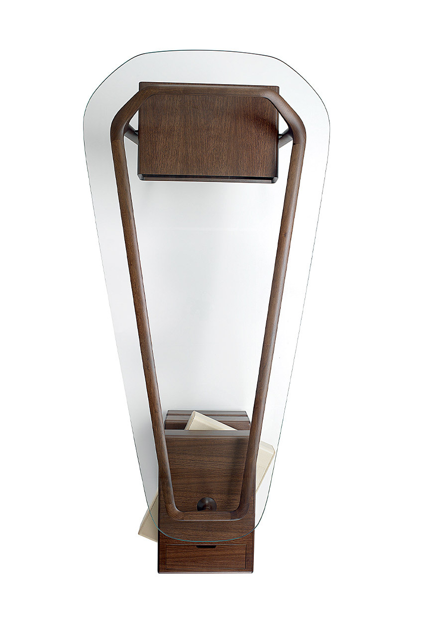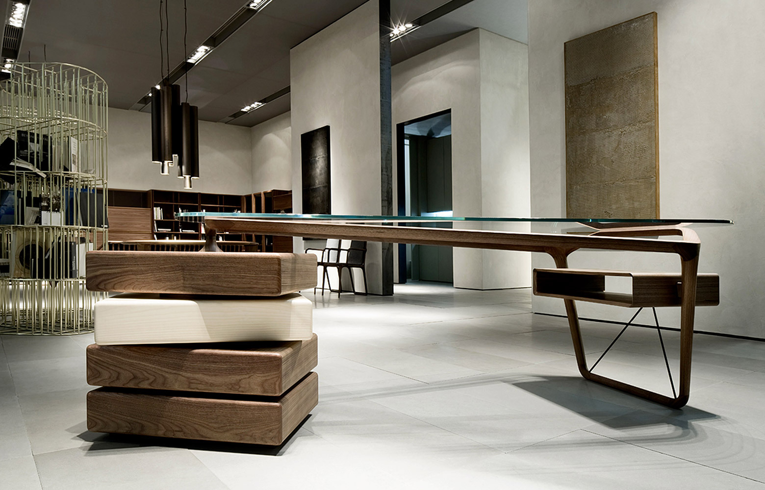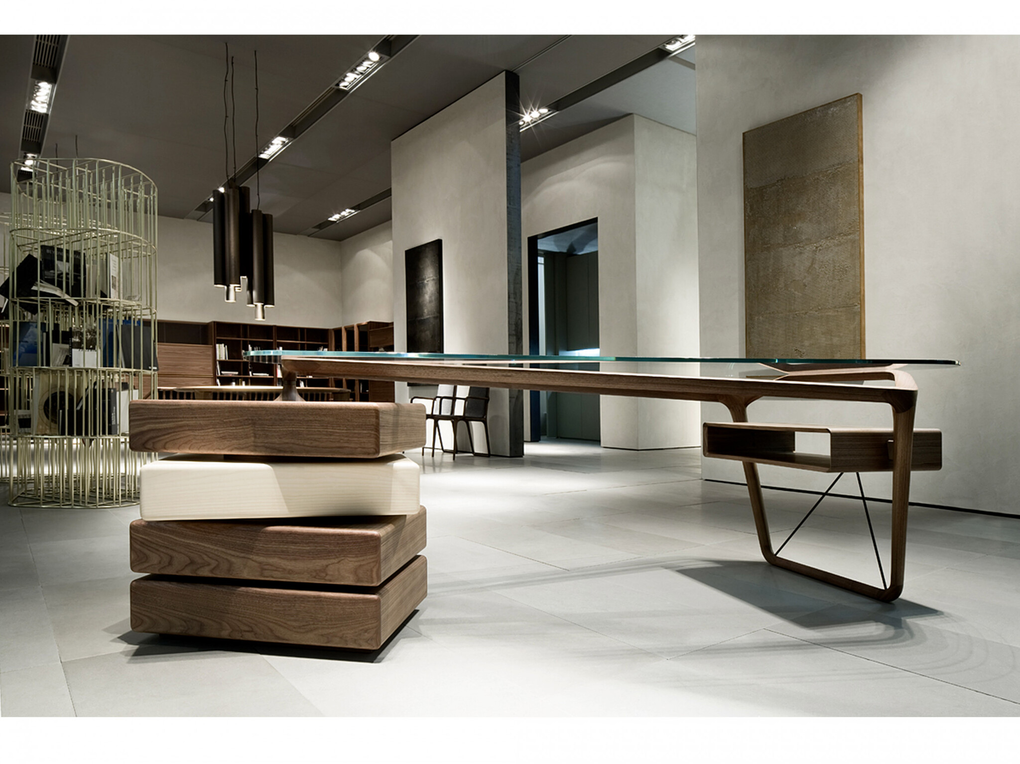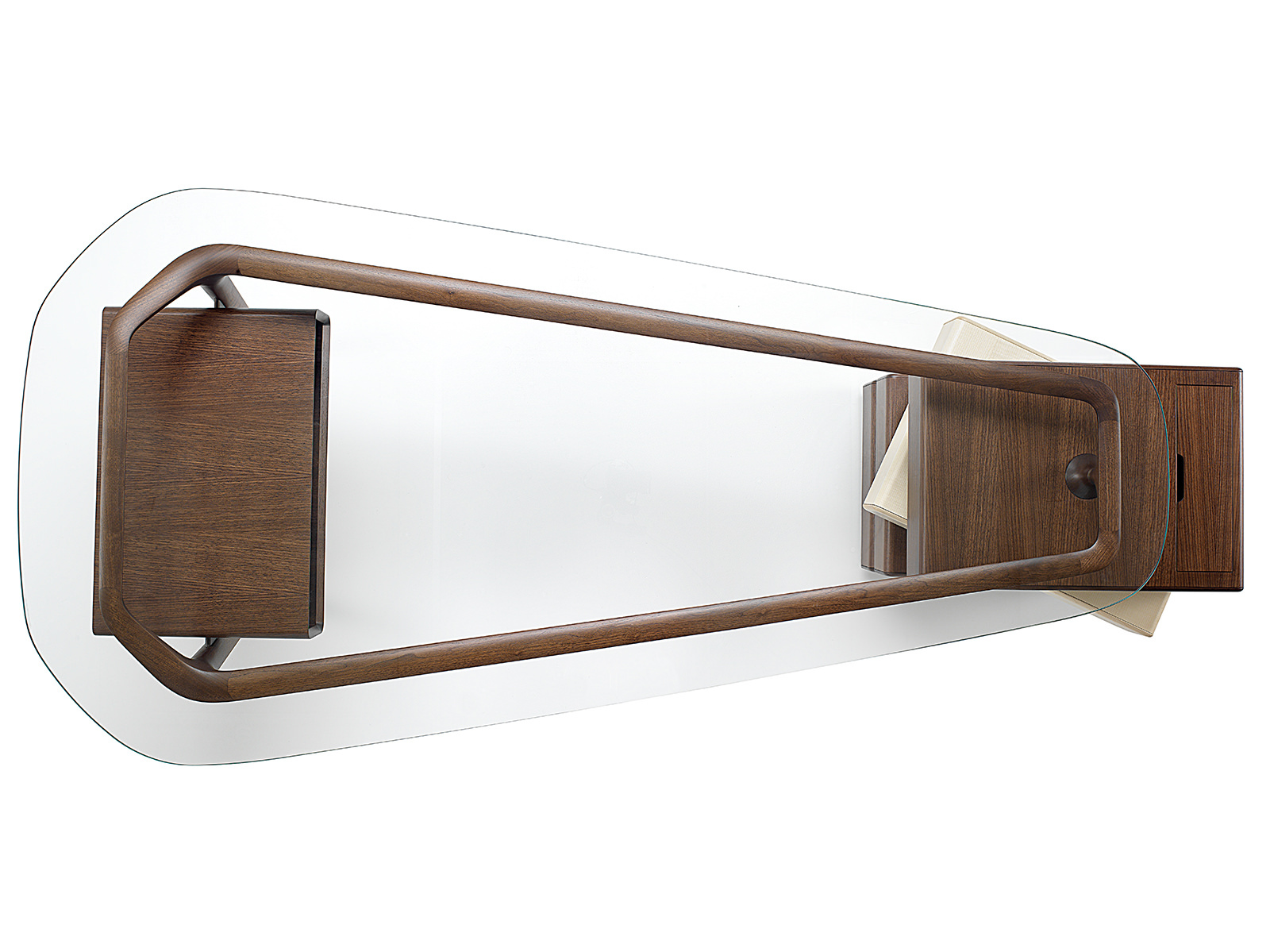 Дизайн Omaggio разработанный Ноэ Дюшофур-Лоуранс в 2011 году вдохновлен формами письменного стола Cavour созданного Карло Моллино. Асимметричный силуэт и четкие линии придают ему динамизм что делает его неподвластным времени предметом мебели. Благодаря современному дизайну исполнения он впишется в любую обстановку от традиционной до самой современной. Справа в основании письменного стола находится комод закругленный со всех четырех сторон и имеющий минимальный профиль. Простота также проявляется в деталях таких как ручки выдвижных ящиков которые выполнены в виде отверстия в нижней части выдвижного ящика чтобы оставаться скрытыми. Второй выдвижной ящик из четырех основных элементов системы хранения может поворачиваться и изготовлен из беленого клена с внутренним органайзером. Остальные три выдвижных ящика выполнены из массива американского ореха а в первом имеется выдвижное отделение для кабелей. Такое стилистическое решение еще больше оживляет все произведение. Большую функциональность обеспечивает открытое хранилище расположенное на изогнутых ножках стола с противоположной стороны. Столешница из закаленного стекла толщиной 12 мм с легкой боковой шлифов-кой которая может быть выбрана в прозрачном или затемненном исполнении улучшает визуальный аспект дизайна.