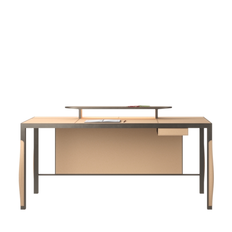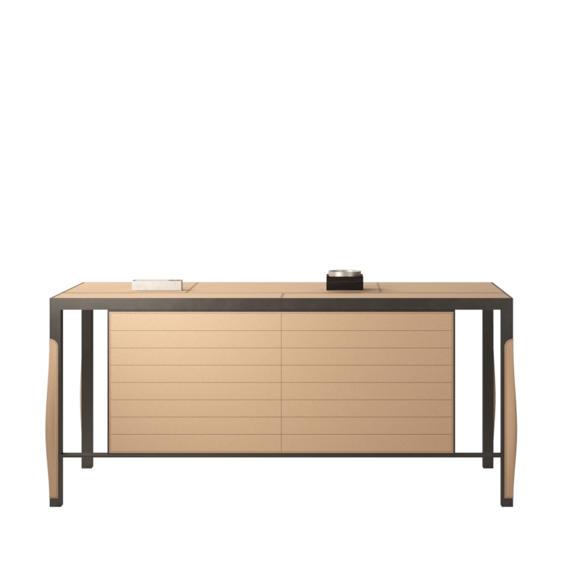 Металлическая конструкция стола FAYI 78323 DESK с кожаной столешницей, длинным верхним металлическим лотком, обшитым кожей, с возможностью установки кожаного выдвижного ящика и кожаной передней панели в металлической раме, углы металлических ножек смягчены кожаной обивкой. Размеры [W x D x H] в мм: 1625 x 675 x 825