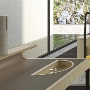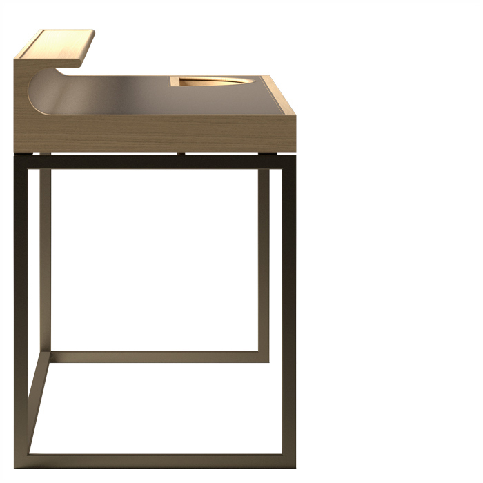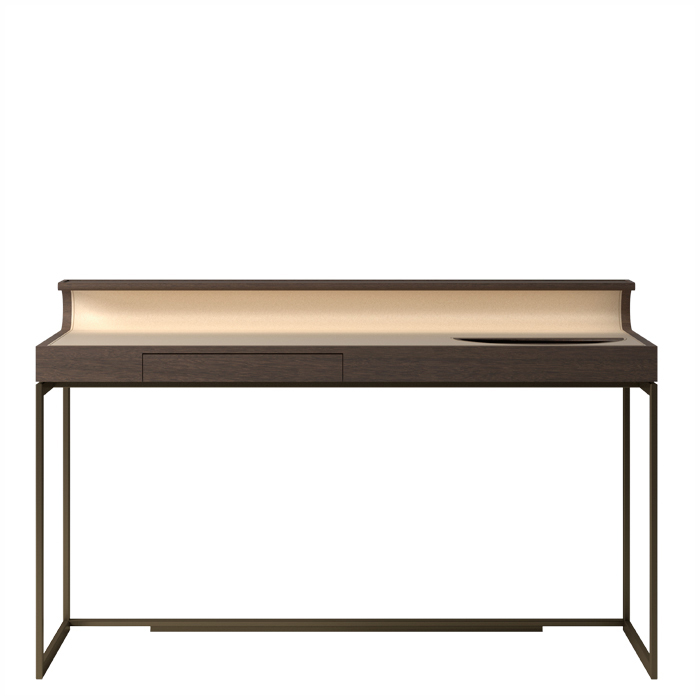 PLAI 63216 письменный стол и комоды из дерева Купира или натурального дуба, кожаная столешница, встроенный полукруглый вращающийся ящик, выдвижной ящик под столешницей, скрытая светодиодная подсветка под верхней полкой, металлическая опора на раме. Размеры [W x D x H] в мм: 1400 x 600 x 725
