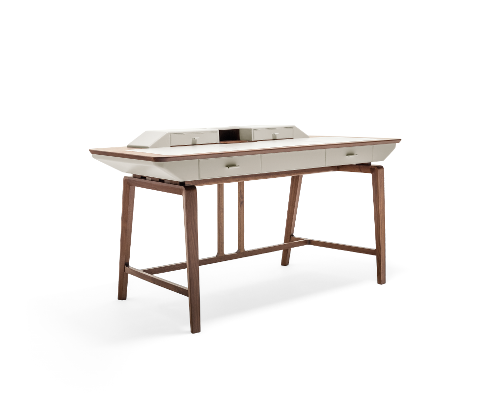 Минималистичные линии дизайна туалетного столика Studium, который сочетает орех каналетто и седельную кожу.