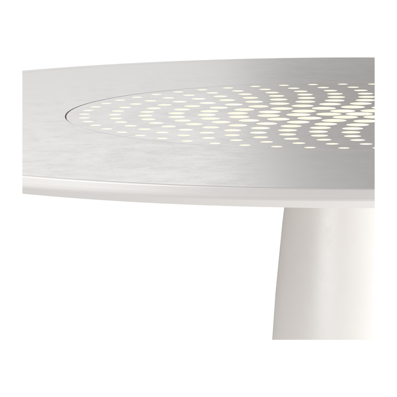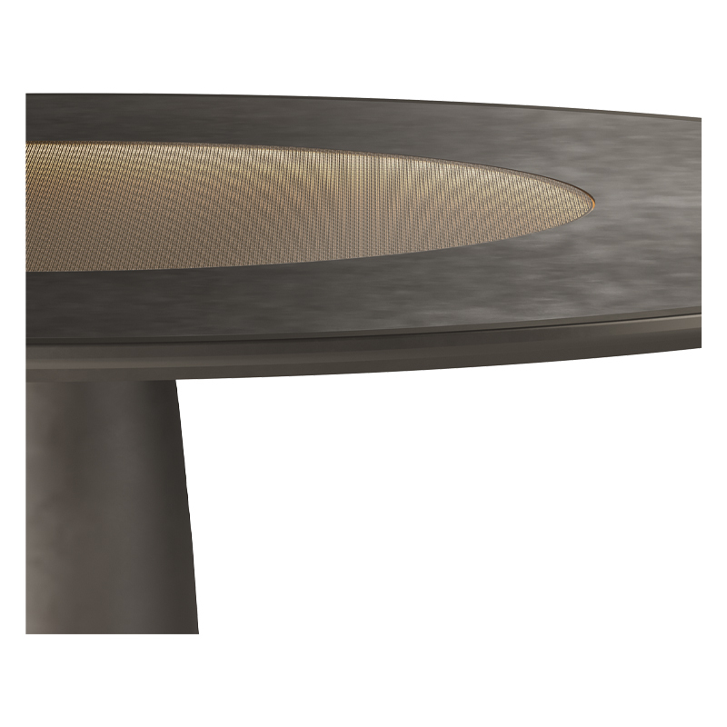 Круглый стол YASU 92324 с центральной стеклянной столешницей с декоративным рисунком delabrè металлическая столешница, покрытая лаком delabrè бронзовый лакированный край, дополнительная подсветка с помощью низковольтного светодиода дистанционный выключатель и диммер с питанием 24 В 3,75 А источник питания стола расположен в центре основания Размеры [W x H] в мм: 1600 Dia x 720