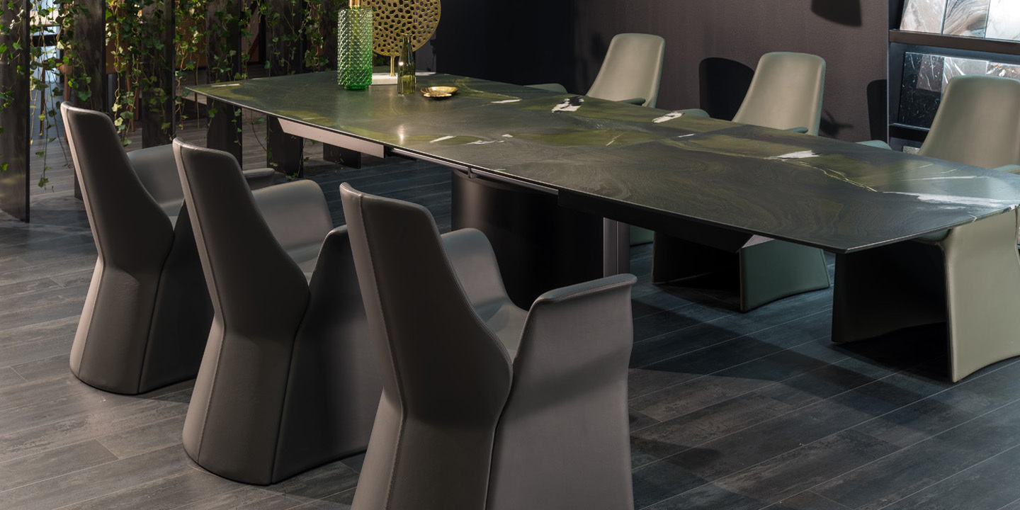 Раздвижной обеденный стол ADLER также доступен в исполнении Magnum из натурального камня или массива дерева. Этот стол имеет базовый размер 270 см, увеличенный до 370 см. При индивидуальном заказе возможны различные размеры.