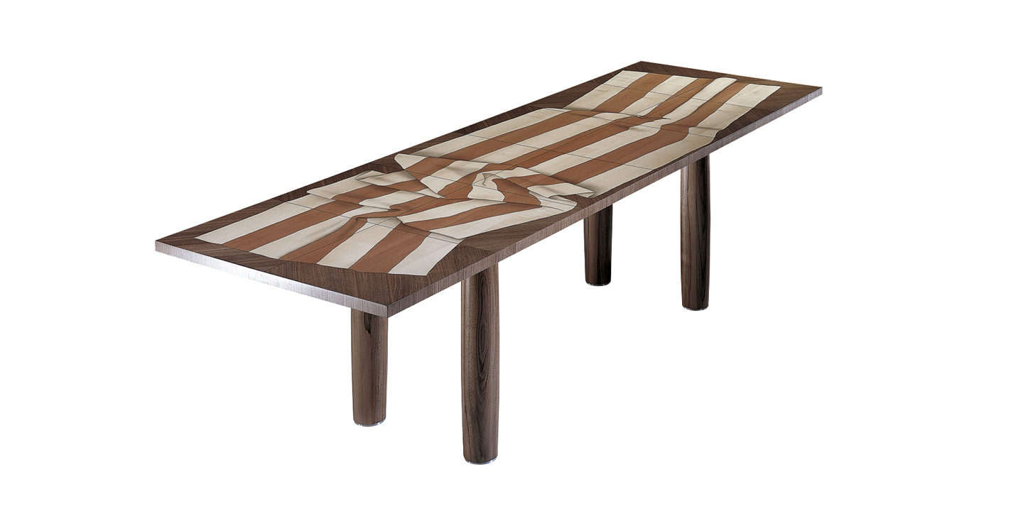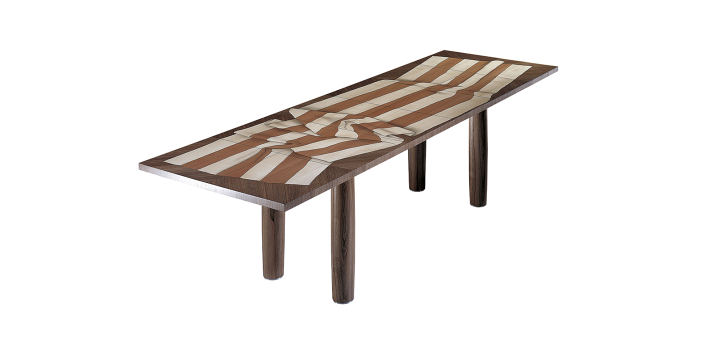 Стол в стиле постмодерн. Что касается формы и технического исполнения, "Аркадьен" - это традиционный обеденный стол с облицованной столешницей и ножками из шпона в тон. Особенностью этой модели является маркетри в виде наброшенной ткани, что придает этому предмету мебели, помимо его функциональности, многоуровневый смысл. Это шедевр мастерства, выполненный из различных видов шпона: американского ореха, клена, груши и черного дерева.