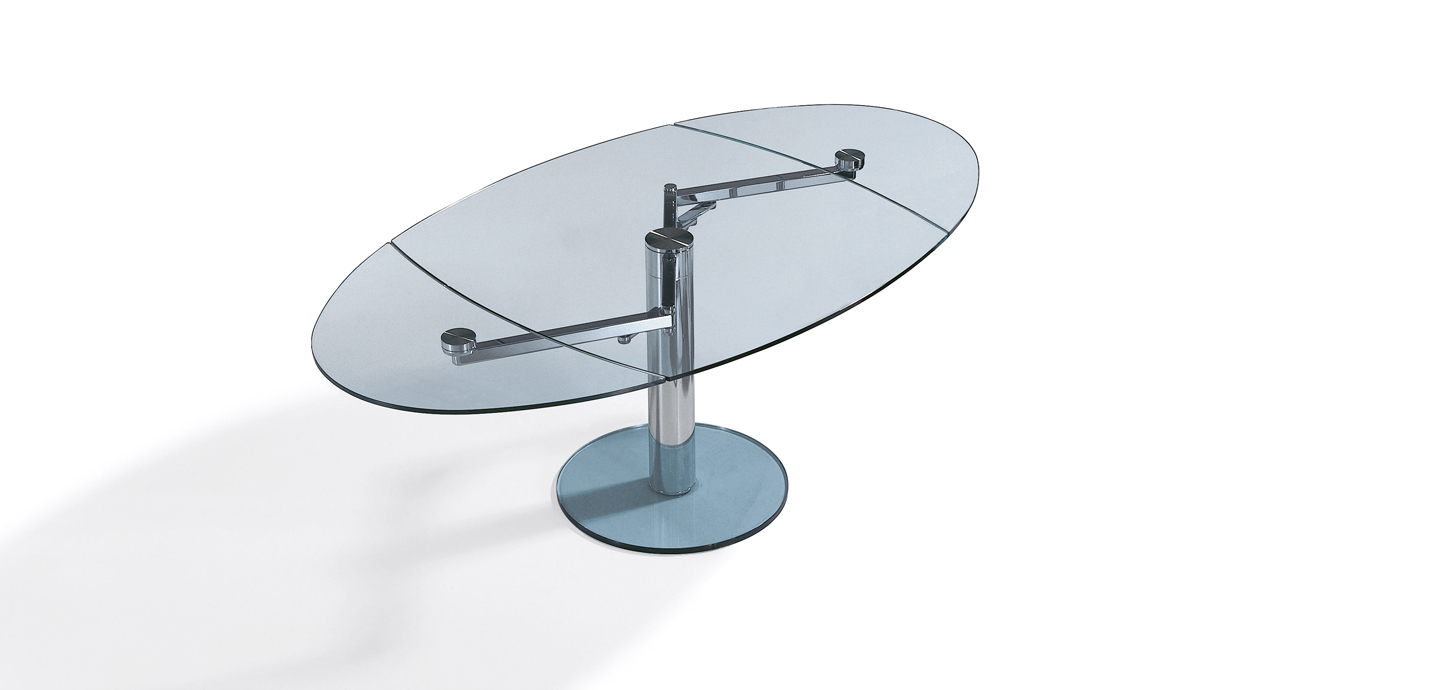 Раздвижной обеденный стол из стекла с двумя поворотными створками под основной панелью. Стол легко открывается. Две створки поворачиваются на 90°. Столешница может быть овальной или прямоугольной формы. Без удлинения столешница имеет форму мягкого квадрата. Основание изготовлено из стальной трубы, полированной хромом, на черном литом основании, из стеклянной пластины или круглой или мягкой квадратной пластины из стали с полированным хромированным покрытием.
