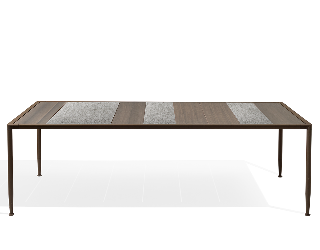 Столешница, отличающаяся чередованием цветов и материалов, создает уникальный характер уличного стола Gea.