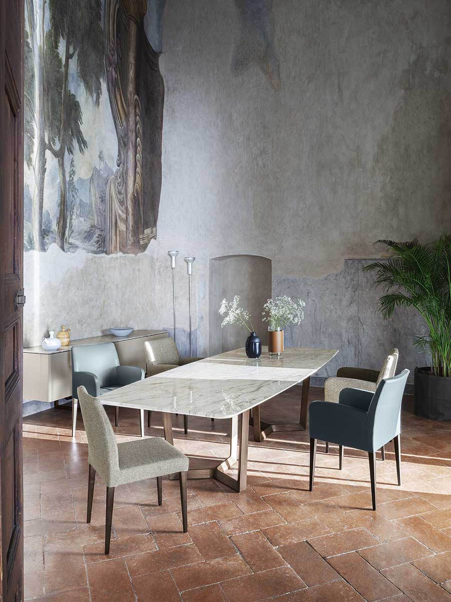 Роберто Лаццерони разработал стол Bolero Ravel для Poltrona Frau. Столешница из цельного куска мрамора бочкообразной формы, заостренные края и основание на 3 ножках делают его еще более динамичным и изящным. Чувственная партитура звуков, гармонично сочетающихся в пространстве: Роберто Лаццерони явно вдохновлялся гипнотическим “Болеро” Равеля, когда создавал этот изящный столик, который, несмотря на "тяжелые" материалы, кажется почти подвешенным в воздухе. Такие материалы, как мраморная столешница, которая, прикрепленная к опорам с помощью распорки, кажется парящей в пространстве. Его слегка трапециевидная форма подчеркивает визуальное восприятие толщины, уменьшенной до минимума. Это ощущение подчеркивается изящными скошенными краями, которые скошены вверх на коротких сторонах и вниз на длинных сторонах. Оригинальная заостренная треугольная секция придает основанию на 3 ножках большую динамичность. В результате получается воздушный столик со сдержанной элегантностью, который легко сочетается с другими предметами мебели Poltrona Frau.