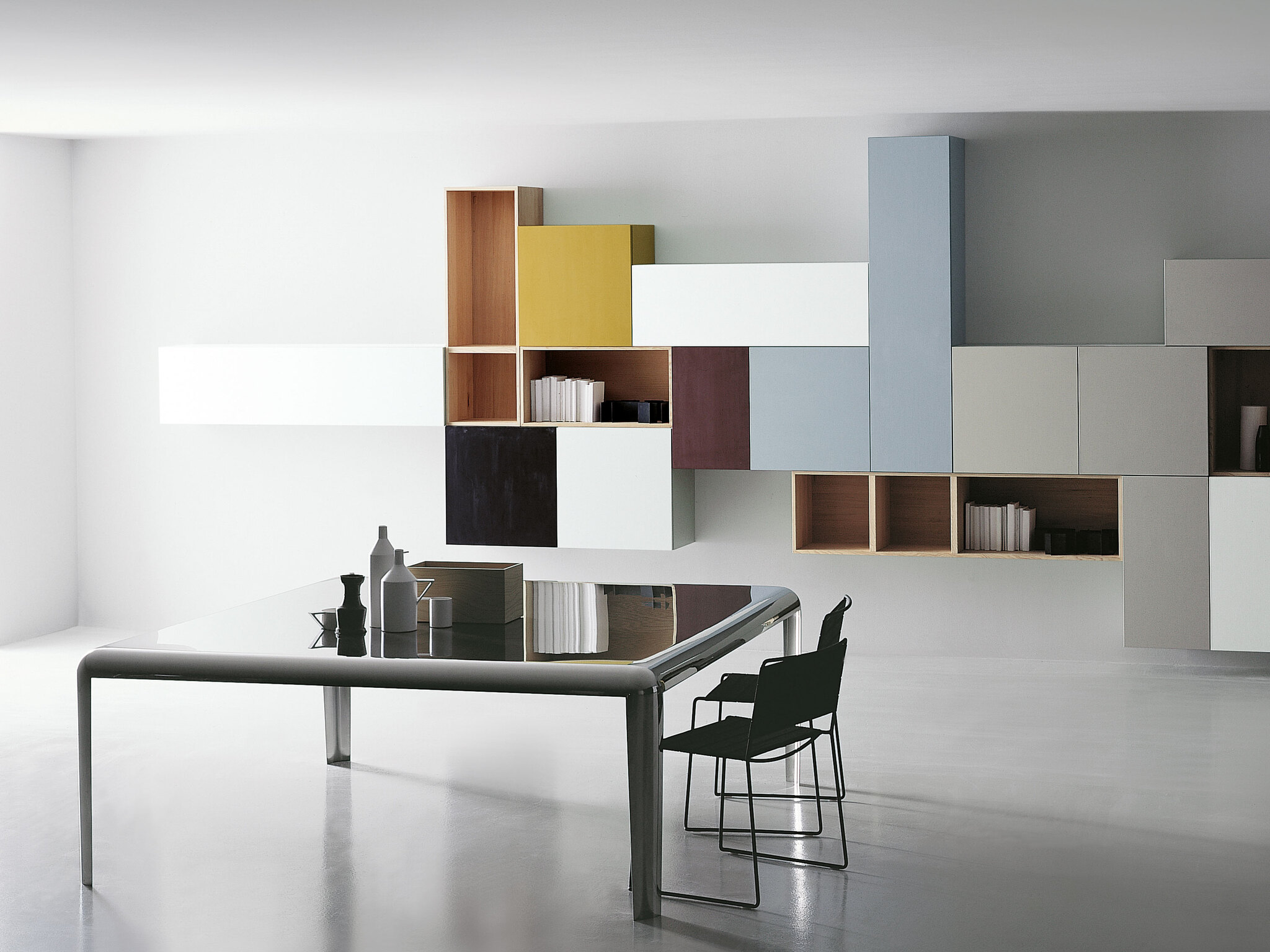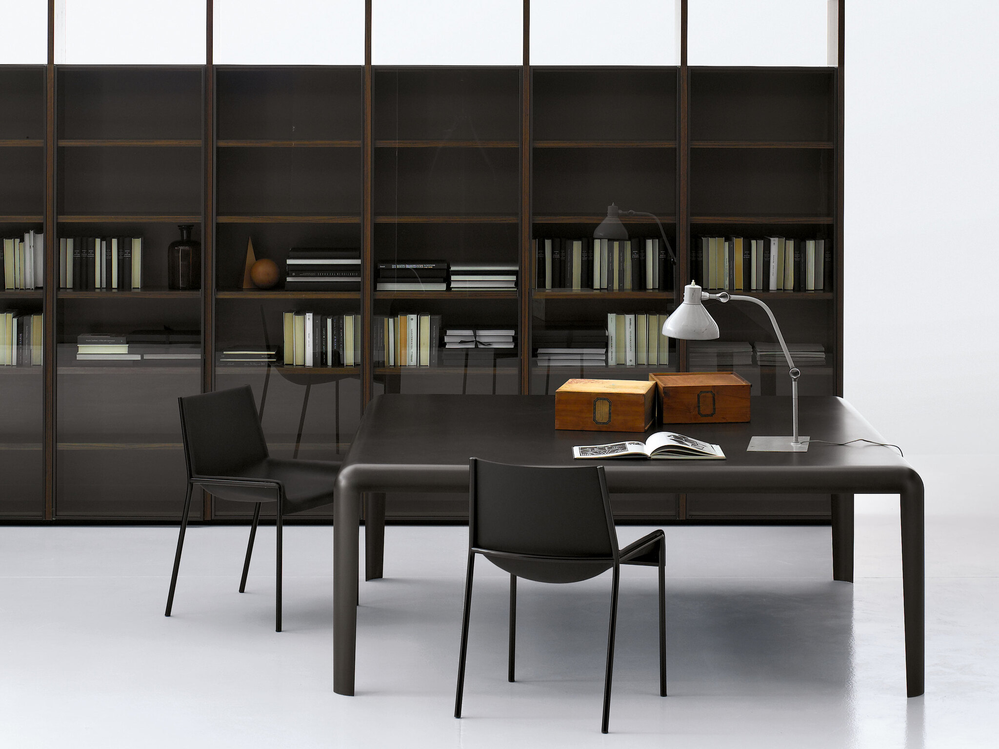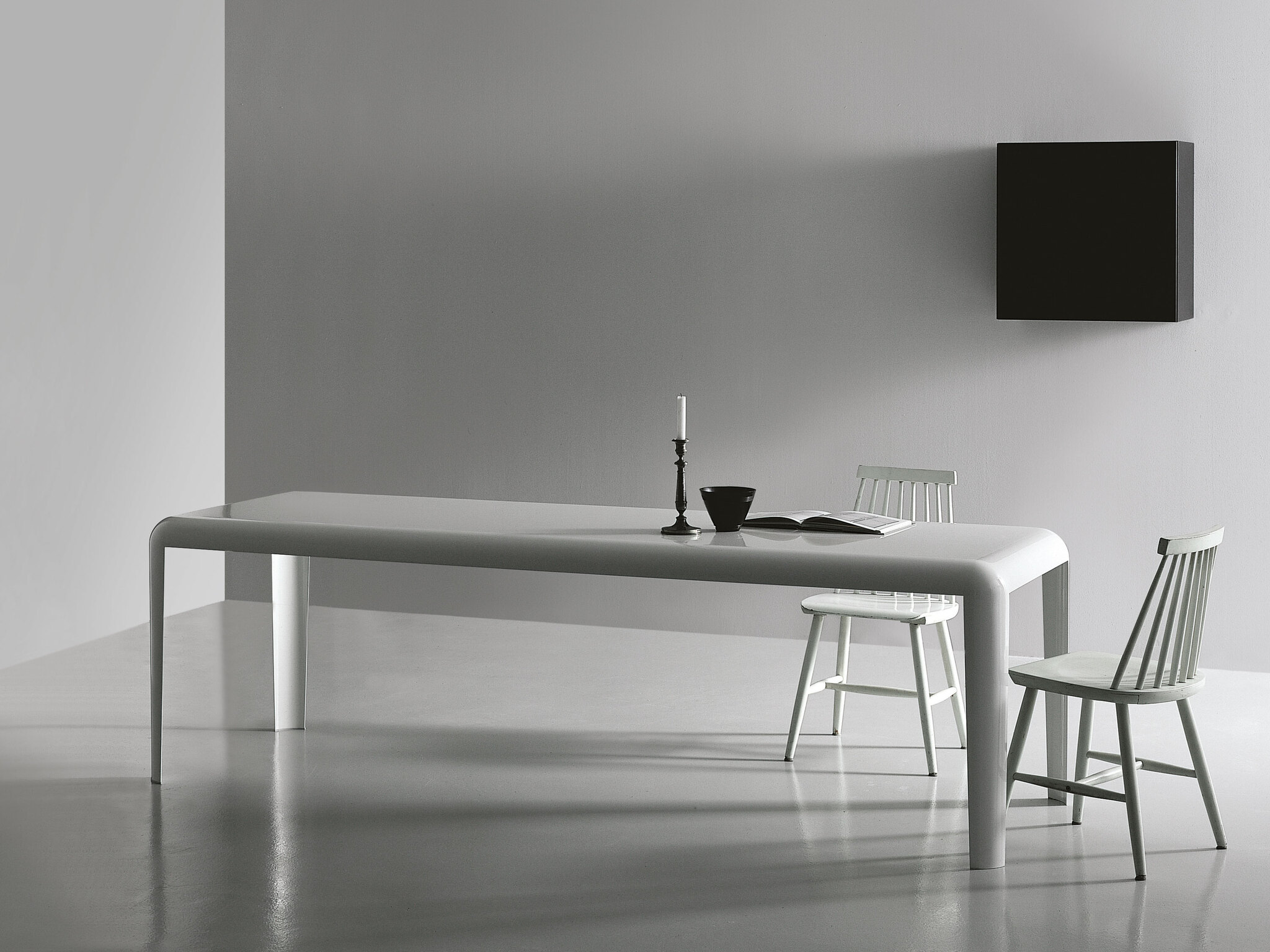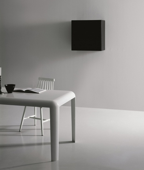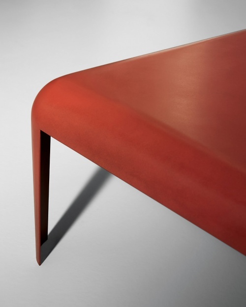 Стол изготовлен из спаянного изогнутого листового металла, окрашен в глянцевый белый или черный цвет с эффектом бронзы, из нержавеющей стали или покрыт лаком в цветах rosso antico и grigio porfido. Также доступен в низком исполнении, H. 400 мм, с фиксированными или настраиваемыми размерами. Доступен также в наружном исполнении.