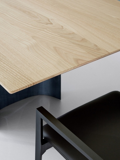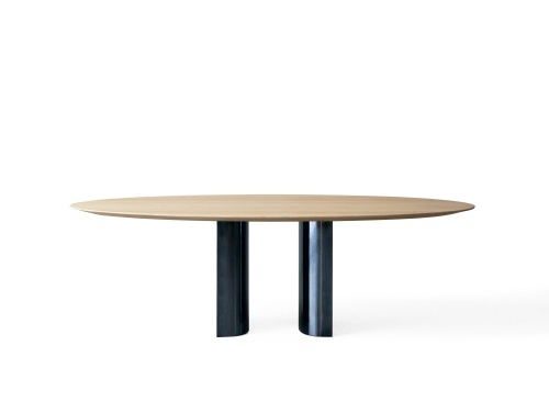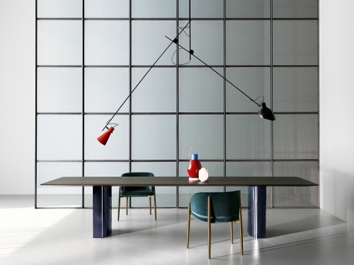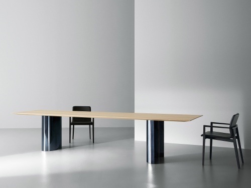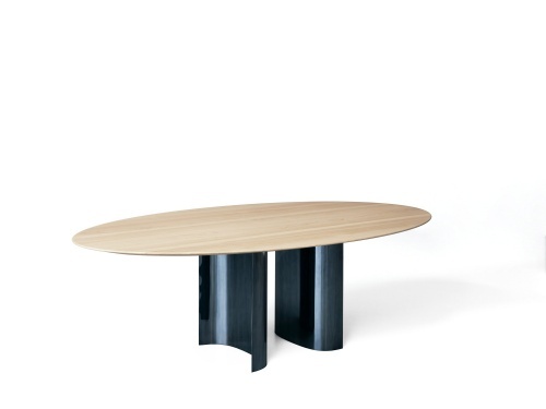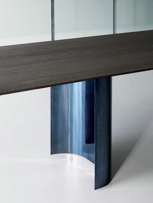 Стол Jeff, разработанный Оскаром и Габриэле Буратти, обыгрывает завораживающую реакцию зеркальных поверхностей: интригующая тема, характерная для различных направлений современного искусства, колеблющихся между минимализмом и максимализмом. Обтекаемая столешница из массива каштана словно подвешена на двух металлических центральных основаниях, особая геометрия которых - открытая полукруглая форма из глянцевого алюминия, окрашенного в синий цвет, - выполнена вручную, что создает постоянно меняющиеся эффекты отражения. Столешница, изготовленная из отборных планок натурального или окрашенного в черный цвет каштана, имеет заостренный край, который придает особую легкость очень толстому верху. Дополнительное закругление по всему периметру смягчает края, создавая небольшие сферы на каждом из четырех углов. Чтобы гарантировать устойчивость столов с течением времени, в массивную древесину встроены четыре усиливающие балки. Под столешницей металлические усиливающие элементы закреплены деревянными дюбелями с высококачественной инкрустацией.