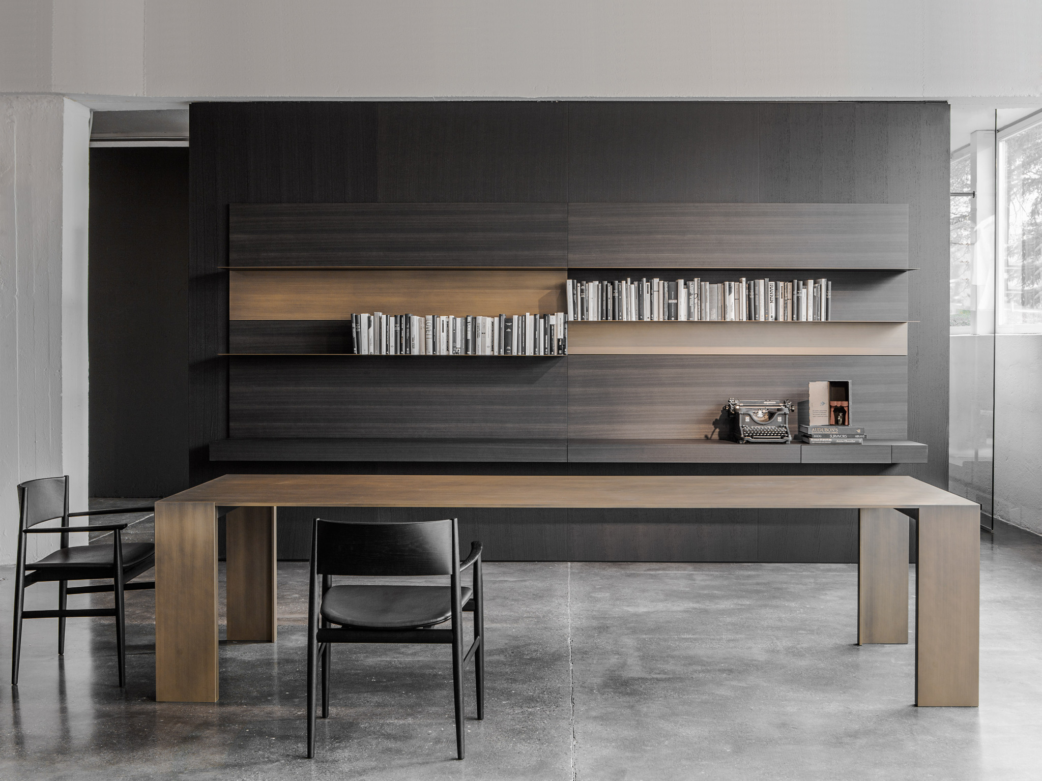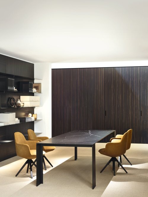 Стол Metallico отличается легкостью столешницы и ножек, изготовленных из листового алюминия толщиной 12 мм. Цельный алюминий придает этому важному проекту утонченную эстетику, но в то же время материальную устойчивость, прочность и легкость, а также экологичность. Он доступен в прямоугольном и квадратном исполнении, а также может быть изготовлен по индивидуальному заказу. Он также подходит для столовых и конференц-залов, доступен в черном или белом исполнении, покрыт лаком rosso antico, grigio porfido и полированной латуни, а также в наружном исполнении с белой или черной отделкой. Особая отделка, бархатистая на ощупь и эстетически ценная, достигается за счет каталитической окраски, высокой толщины и последующих этапов ручной полировки и вощения, что придает ей исключительный материальный эффект. Последнее предложение в отношении стола Metallico - это деревянная отделка столешницы в сочетании с лакированными ножками во всех доступных вариантах отделки; столешница стола (доступна только в прямоугольном исполнении) может быть выполнена из дерева коллекции Porro. Последнее предложение Metallico - мраморная отделка столешницы в сочетании с черными лакированными ножками. Metallico выпускается с мраморной столешницей только в прямоугольном исполнении.