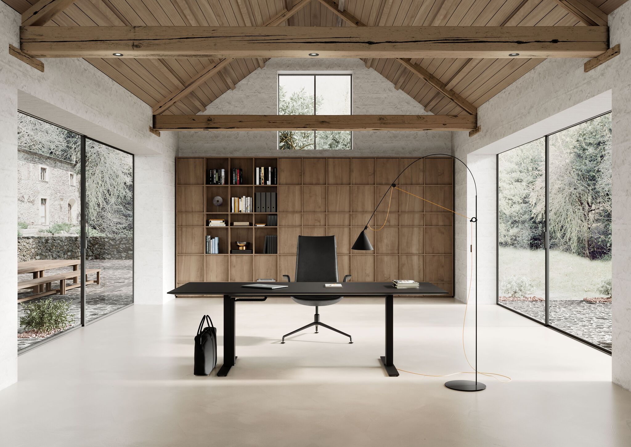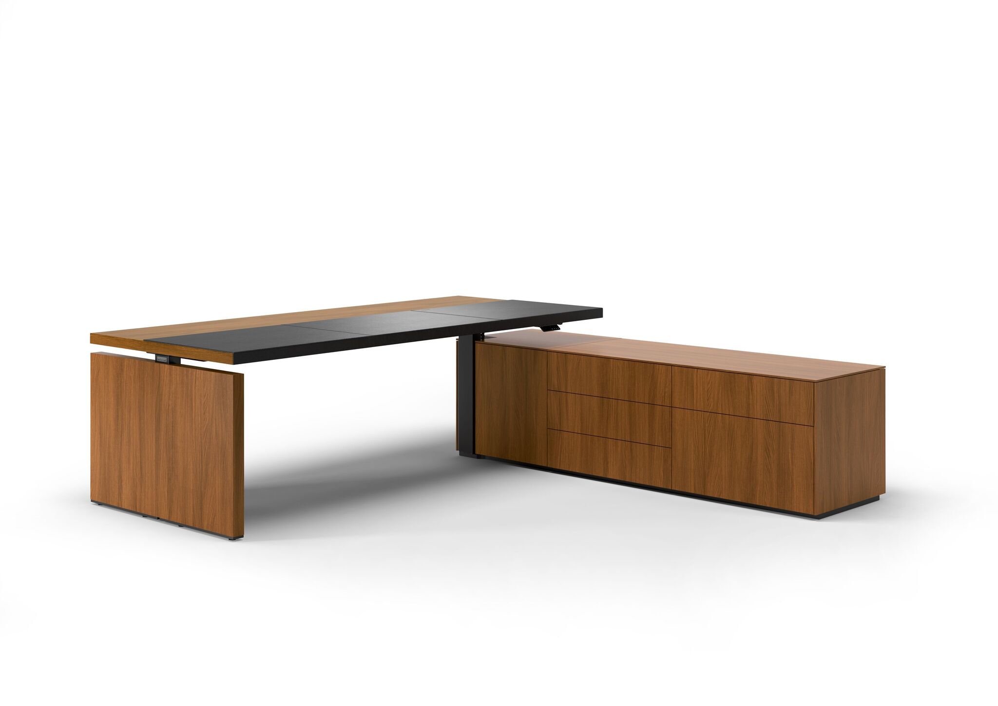 Рабочее место для руководителей: графичные линии и форма "моста" стола руководителя подчеркивают архитектурную ясность. Проекты можно сортировать и структурировать на большой столешнице. Функция регулировки высоты позволяет принимать различные положения за столом. Ценный и настраиваемый дизайн.