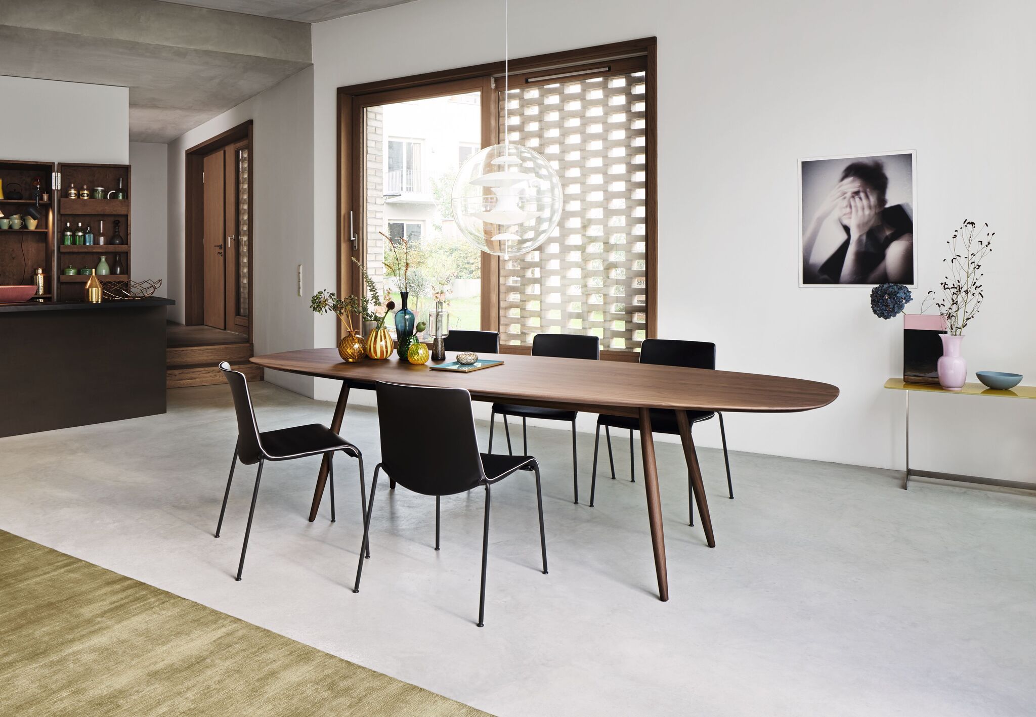 Гармоничные линии характеризуют этот обеденный стол, изготовленный из массива дуба или ореха. Столешница как бы парит над каркасом – в результате получается устойчивая, но легкая конструкция. К признакам исключительного мастерства относятся впечатляющие продольные очертания деревянного стола и точная обработка его краев.