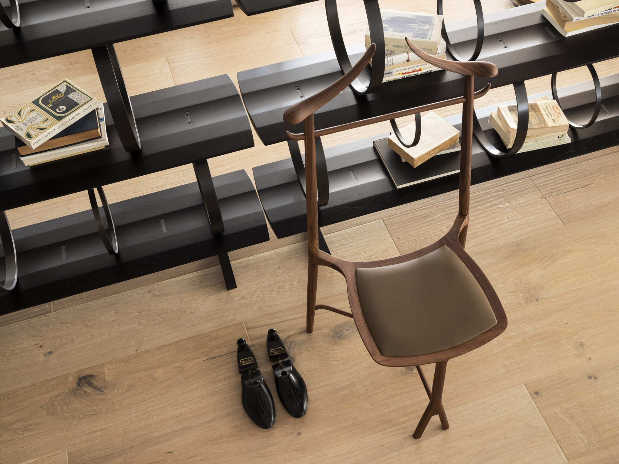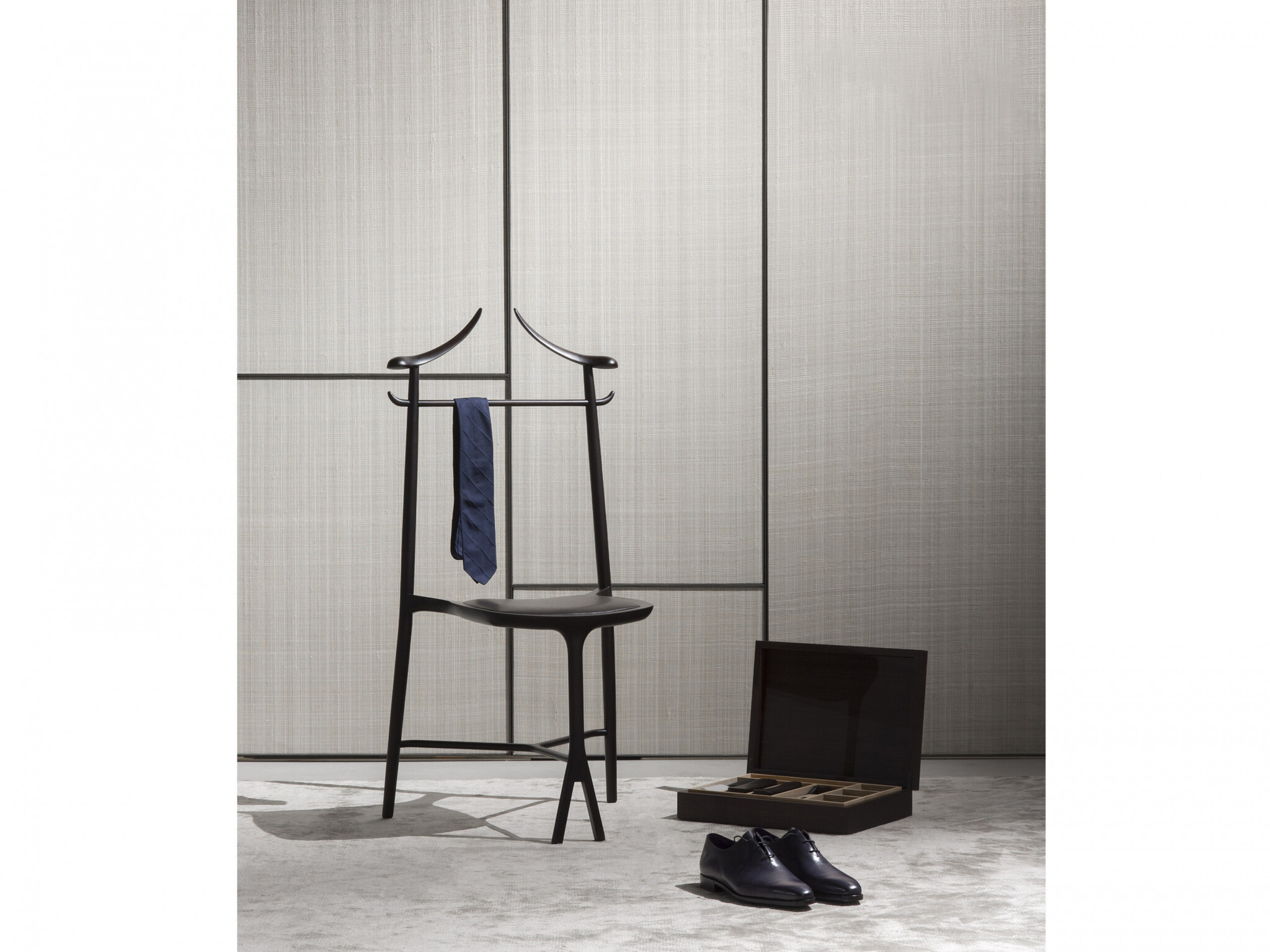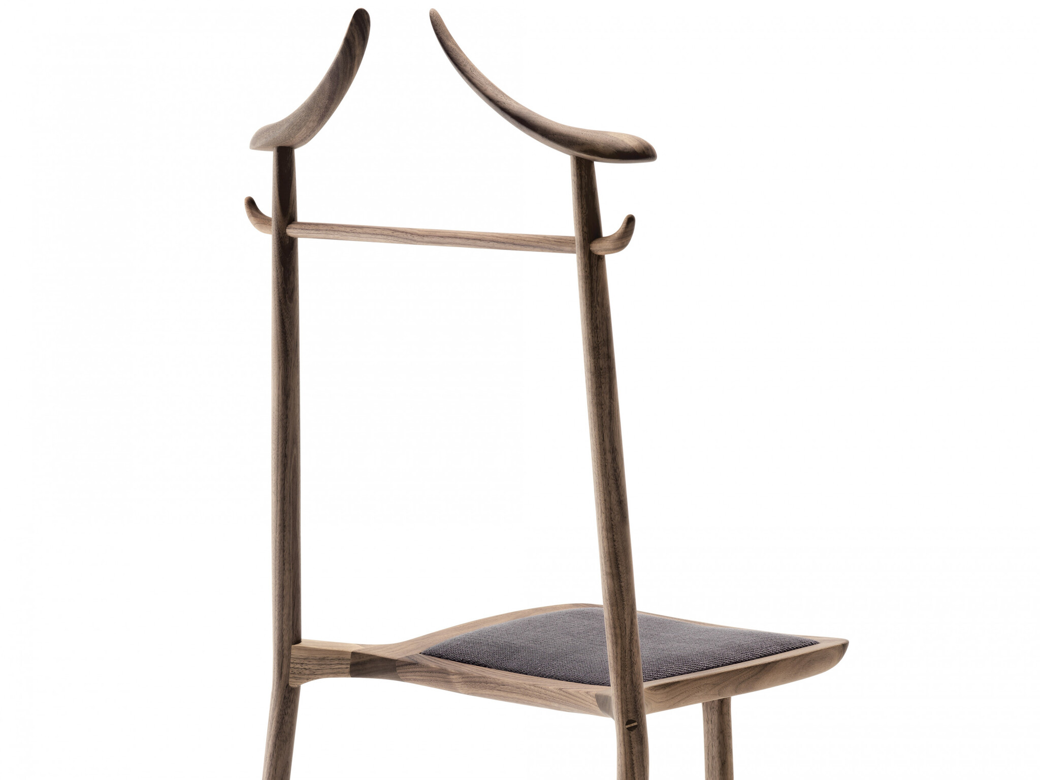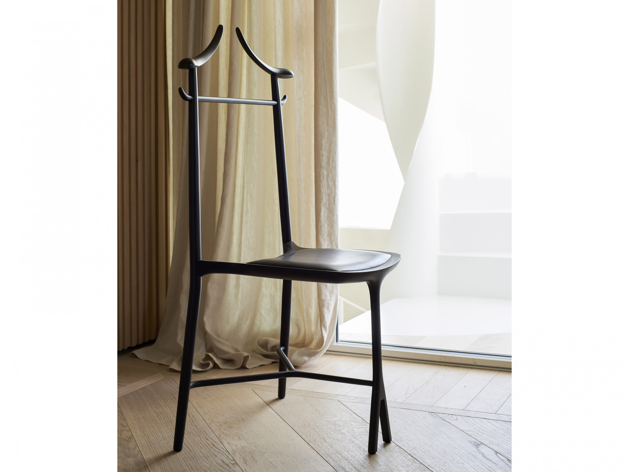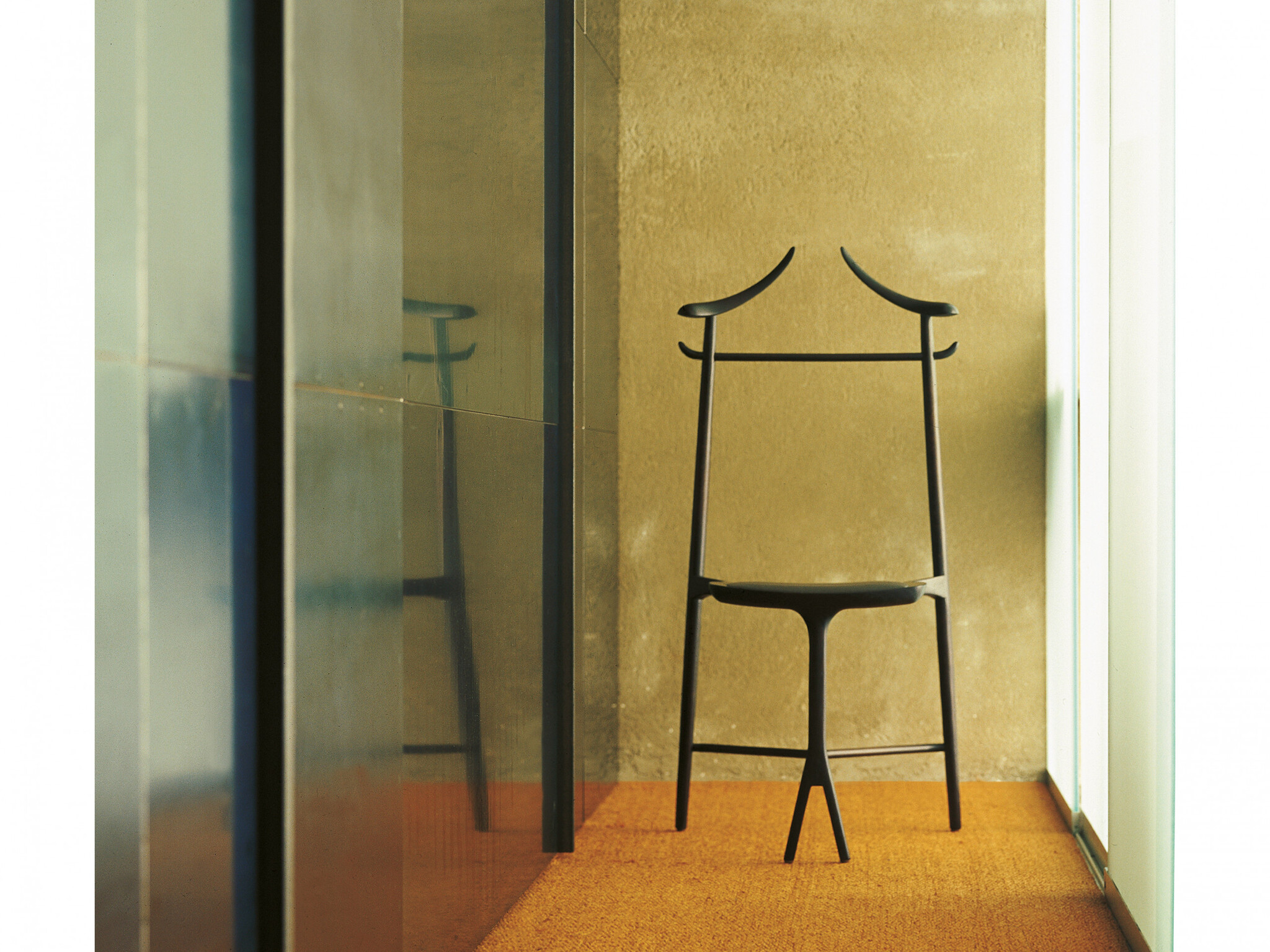 Chambre Close — кресло созданное в 1988 году Роберто Лаццерони который интересуется концептуальным искусством и радикальным дизайном. Это уникальная интерпретация идеи вешалки для одежды превращающаяся в универсальный и комфортный элемент мебели идеальный для спальни или гардероба. Это очень легкое кресло — весит меньше 3 кг. Выполнено из массива американского ореха с лаконичной структурой вдохновленной японскими иероглифами. В ней сочетается несколько изящных минималистичных элементов формирующих спинку состоящую из плечика для курток вешалки для штанов и двух боковых крючков для ремней и галстуков. Для дополнительного комфорта сиденье можно обить тканью кожей или натуральной кожей. Также доступна шеллаковая отделка придающая древесине глянец и подчеркивающая ее текстуру с уникальными тактильными эффектами.