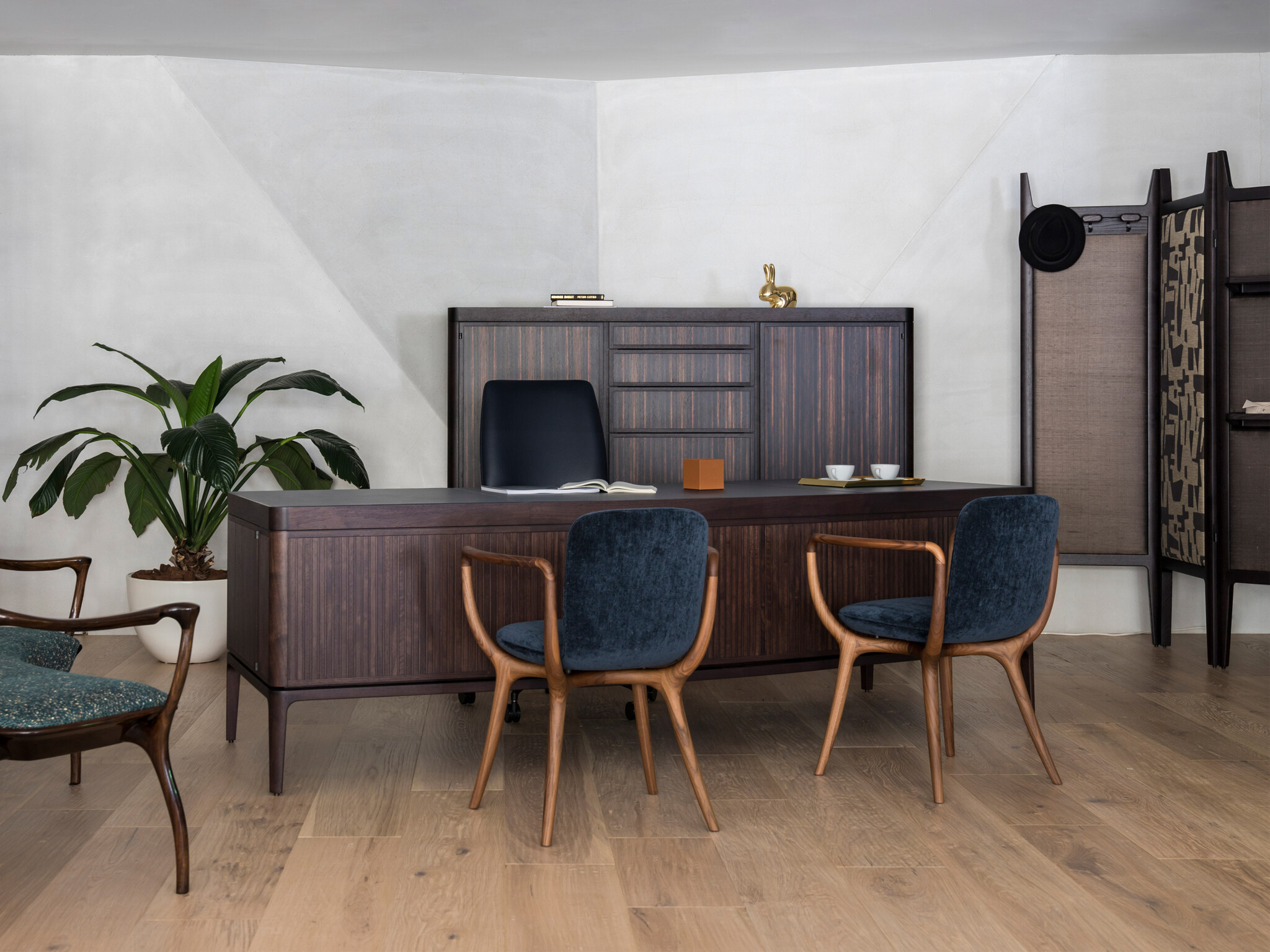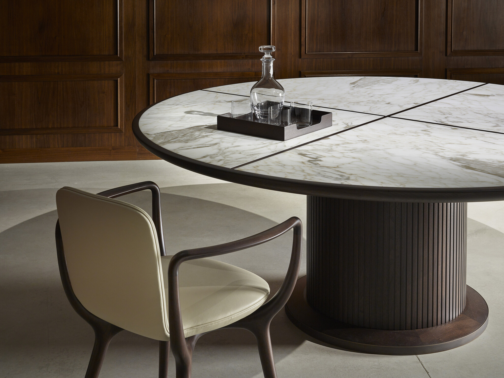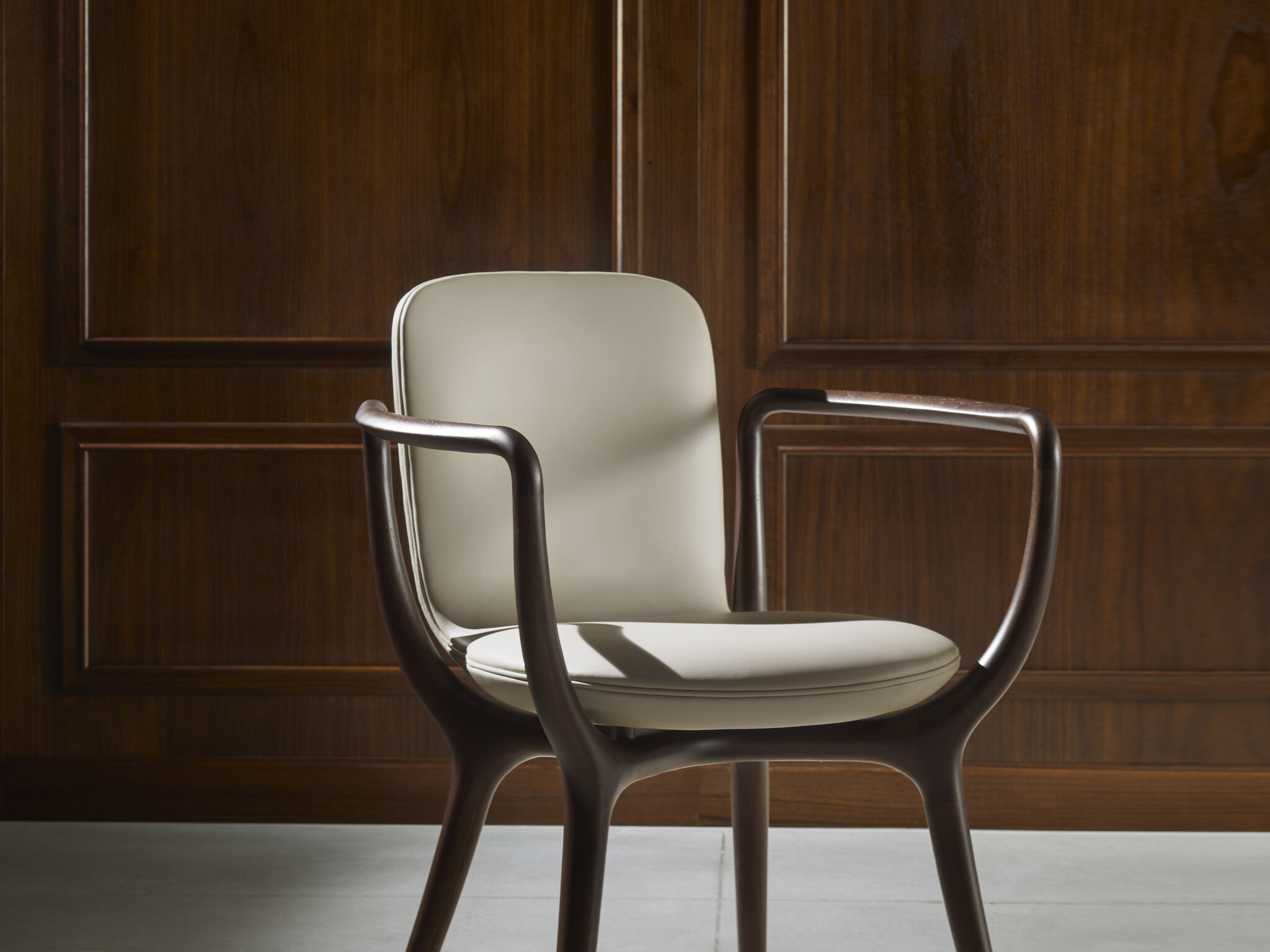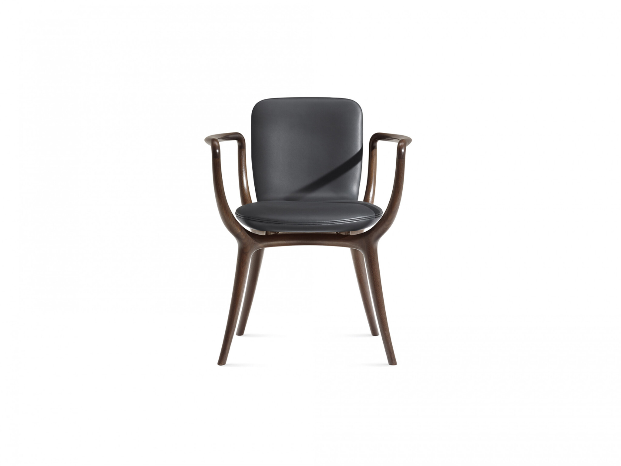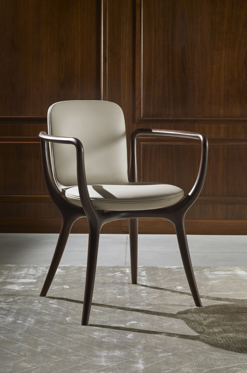 Стул Piruette обладает уютным и обволакивающим силуэтом. Разработан Роберто Лаццерони как идеальное сочетание ремесленных традиций и современного дизайнерского поиска. Каркас выполнен из массива американского ореха где передние ножки соединяются с задними благодаря изящным плавным подлокотникам расширяющимся по бокам для большего комфорта. Обе стороны соединяются X-образной конструкцией поддерживающей сиденье закрепленным латунными поворотными элементами. Сиденье изготовлено из одного листа изогнутой фанеры бука с мягкой обивкой из ткани кожи или натуральной кожи. В Piruette нельзя использовать ткани Harald Flair Silk белый лен и неотбеленный лен. Имеет шеллаковое покрытие придающее поверхности лёгкий блеск и глубину рисунку древесины.