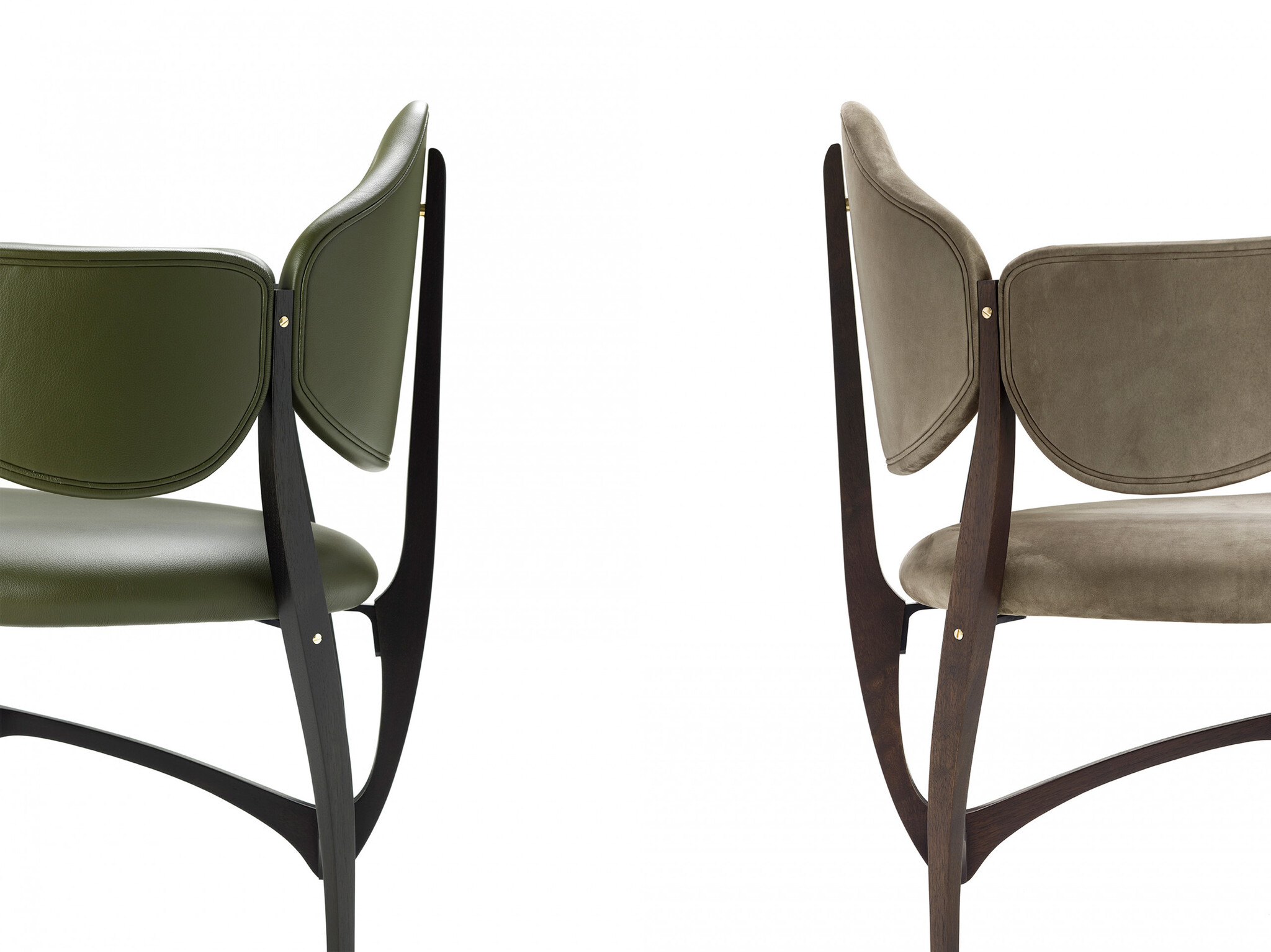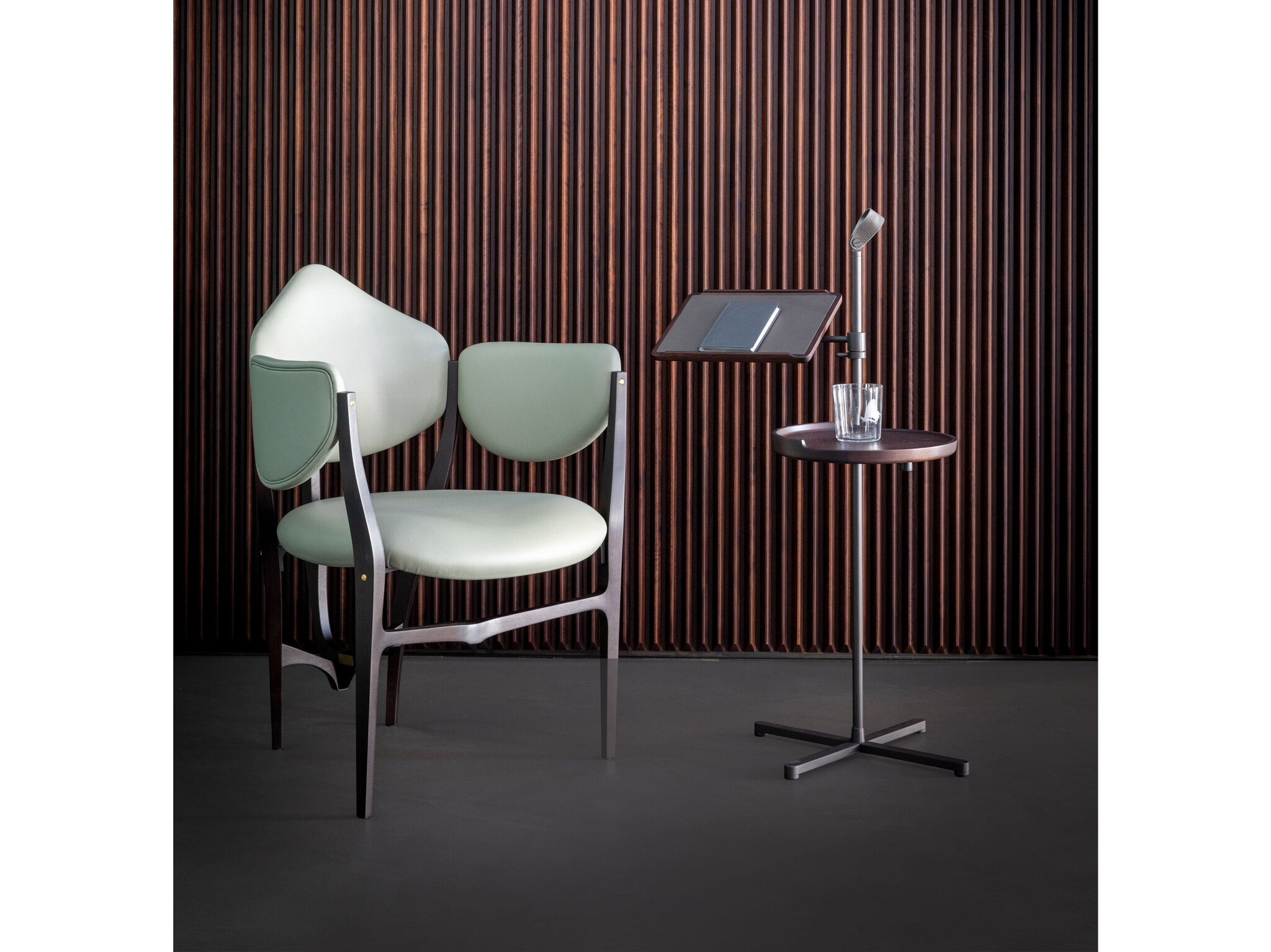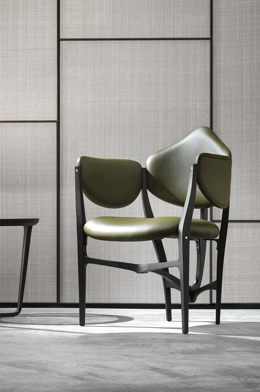 Небольшое кресло Stellage с чистым и выразительным органичным профилем. Спинка и подлокотники приваренные к изящному биоморфному каркасу придают креслу индивидуальность и характер делая его уникальным. Дизайн студии Gabetti & Isola Raineri был разработан для нового здания Фондовой биржи Турина и отражает стиль неолиберти характерный для столицы Пьемонта. Структура из эбонизированного бука с плавными гармоничными линиями отделана металлическими фурнитурами и видимыми винтами что придает элегантность и утонченность. Обивка выполнена из Resinflex — эластичного и устойчивого к погодным условиям материала. Новая версия кресла Stellage 52 была создана Лодовико Габетти и Фабрицио Пеллегрино по инициативе студии Gabab совместно с Франко Чеккотти. Она уважает оригинальный дизайн добавляя новые структурные и декоративные элементы такие как полностью переработанные металлические крепления для повышения устойчивости сиденья и использование кожаной обивки. Отделка выполнена из массива американского ореха в различных цветах. Stellage 52 входит в линейку Masters Tribute выпускаемую Ceccotti Collezioni которая представляет ремесленные и дизайнерские корни компании через переиздания классики.