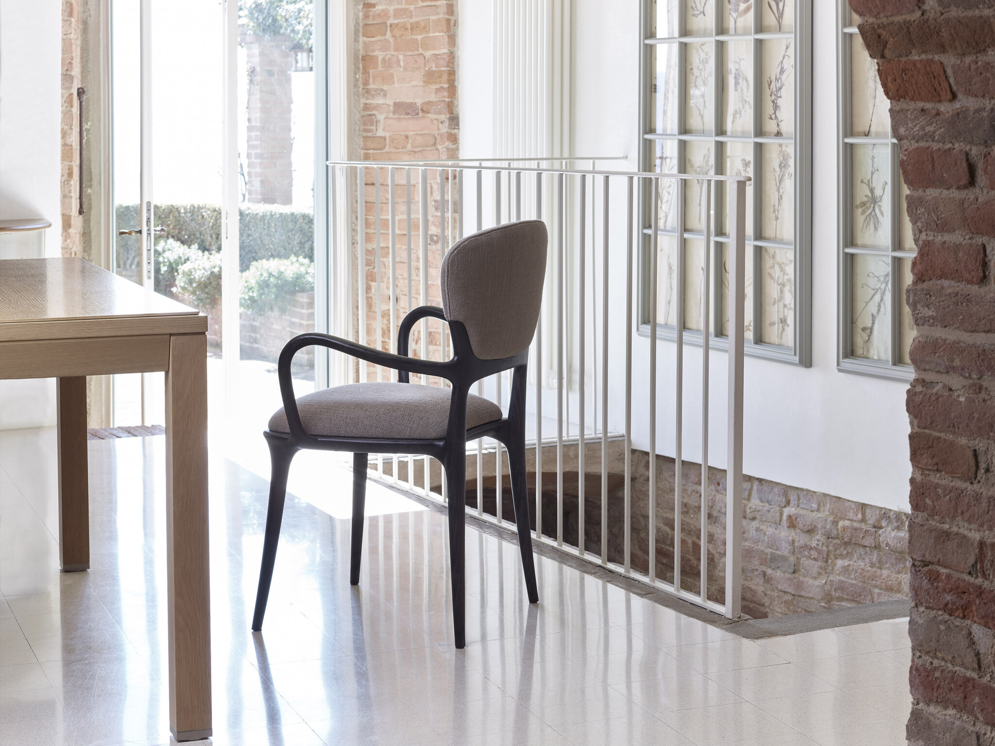 Teresa разработанная Роберто Лаццерони с ее плавными и мягкими линиями является идеальным выбором для тех кто ищет элегантность и комфорт. Она сочетает функциональность с эстетикой благодаря эргономичным формам и изящному силуэту. Идеальна для столовой офиса или гостиничного номера. Изготавливается из массива американского ореха или ясеня — двух материалов обеспечивающих прочность и стабильность. Доступна с подлокотниками или без. Характеризуется уникальным дизайном подчеркивающим большое мягкое сиденье и спинку из фанеры. Может быть обита тканью кожей или натуральной кожей.