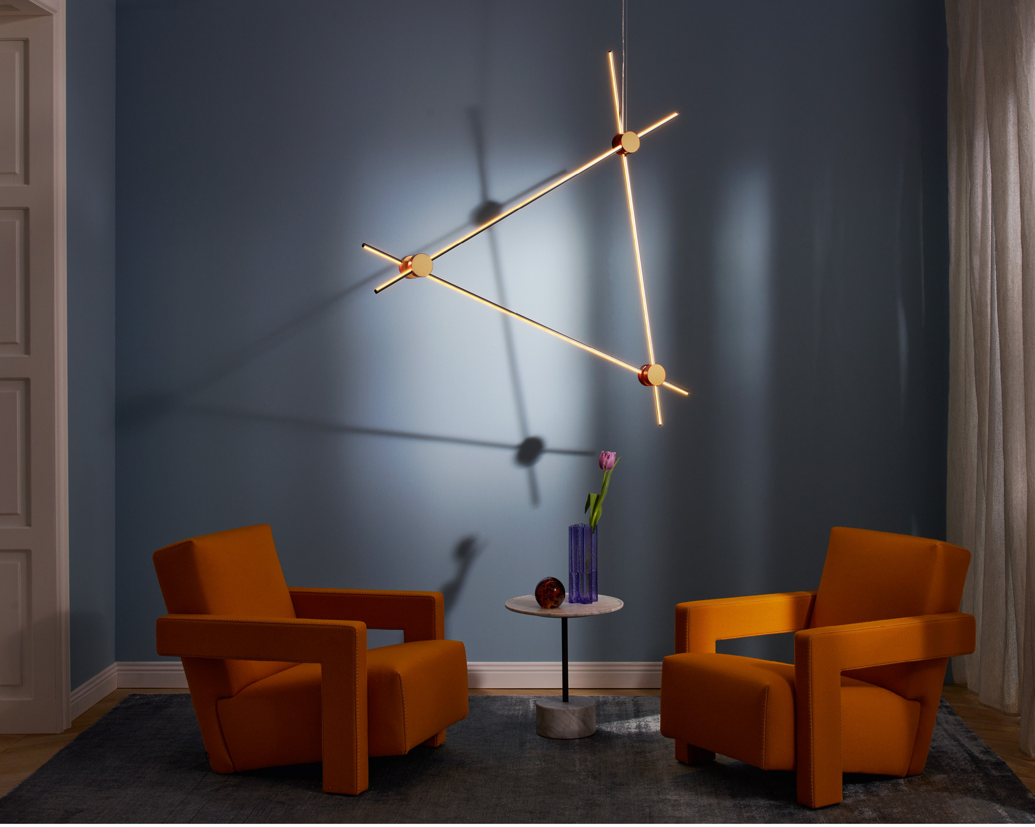 ОСВЕЩАЮЩАЯ ГЕОМЕТРИЯ Вертикальный подвесной светильник, разработанный Тобией Скарпа (Tobia Scarpa), представляет собой, казалось бы, простую конструкцию с использованием сложных инновационных технологий и доступен в двух размерах. Светильник состоит из трех светящихся линий, которые можно соединять, образуя различные композиции, благодаря круглым соединителям из черного металла, украшенным серебряными деталями, внутри которых скрыты передовые технологии. Каждую светящуюся линию можно поворачивать на 360 градусов, чтобы регулировать ее положение и яркость света.