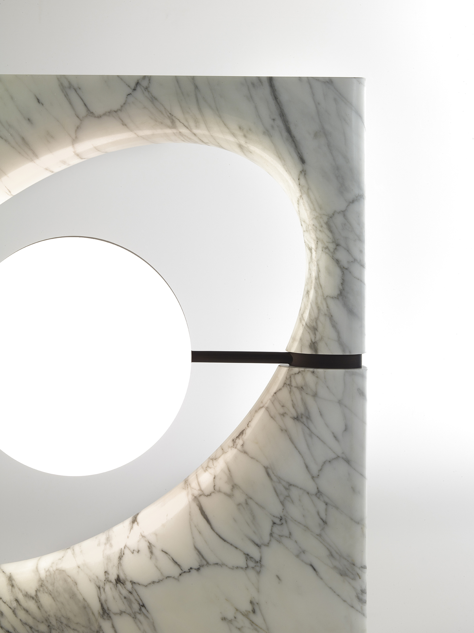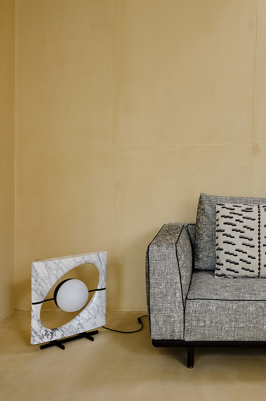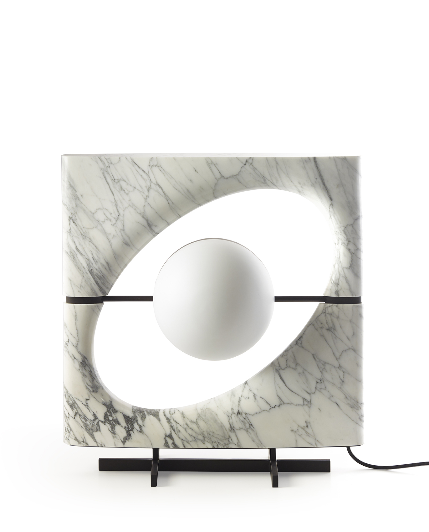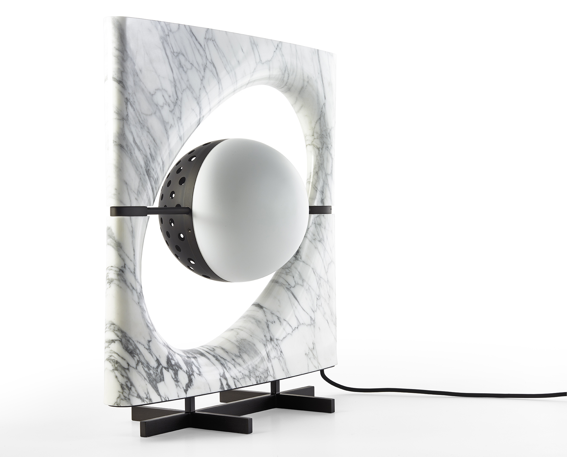Солнце Ра - это светящаяся скульптура. Осветительный прибор состоит из светящегося сферического элемента который кажется подвешен в эллиптическом пространстве подобно Сатурну тяготеющему в своих кольцевых системах. Абажур состоит из двух полусфер: одна из них выполнена из белого матового стекла которое служит источником рассеянного света а другая - из перфорированного металла пропускающего прямые лучи света. Светильник состоит из рамы выполненной из цельного куска камня который тщательно подобран таким образом чтобы подчеркнуть прожилки натурального мрамора доступного в мраморе Cervaiole. Светильник установлен на металлическую подставку.