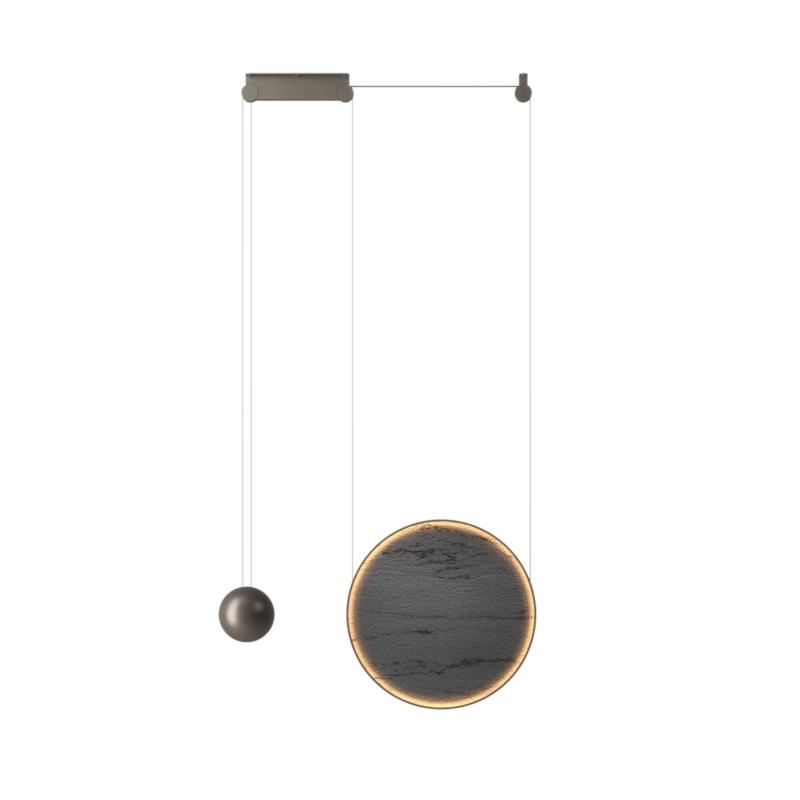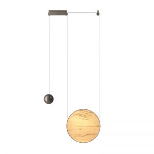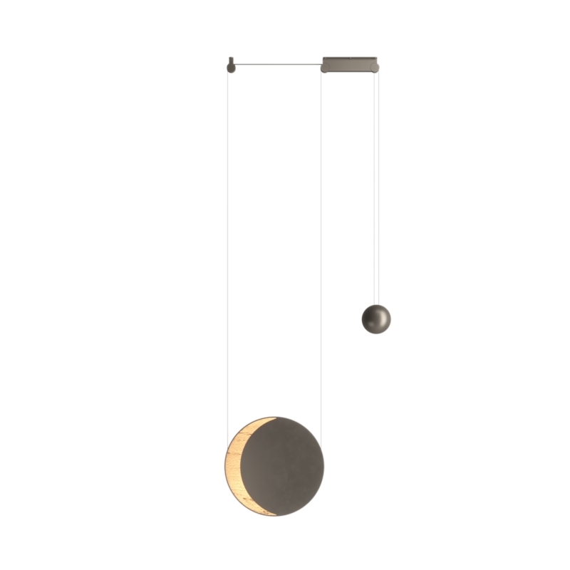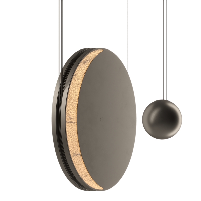 Подвесная конструкция светильника OSEE 90023 выполнена из металла с рассеивателем из полупрозрачного камня, обеспечивающим режимы полнолуния, четверти луны и затмения, с регулируемым металлическим сферическим противовесом для широкого диапазона монтажных высот светильника, регулируемой яркостью с помощью скрытого светодиода, комбинированной подвеской и кабелем питания. Размеры [W x D x H] в мм: 685 x 130 x 1450-1590